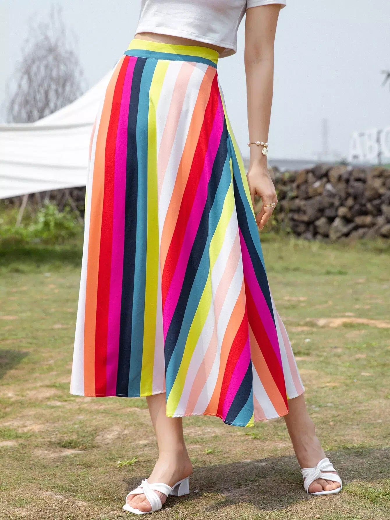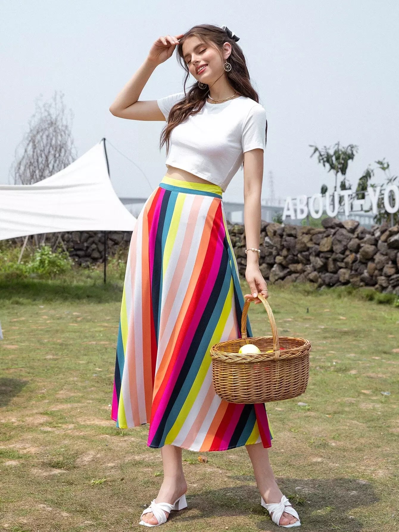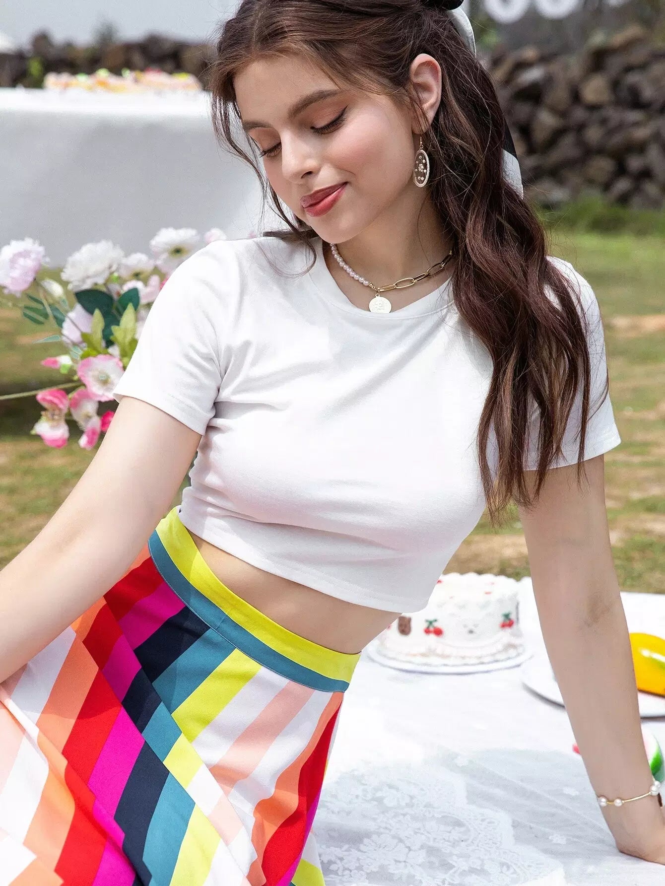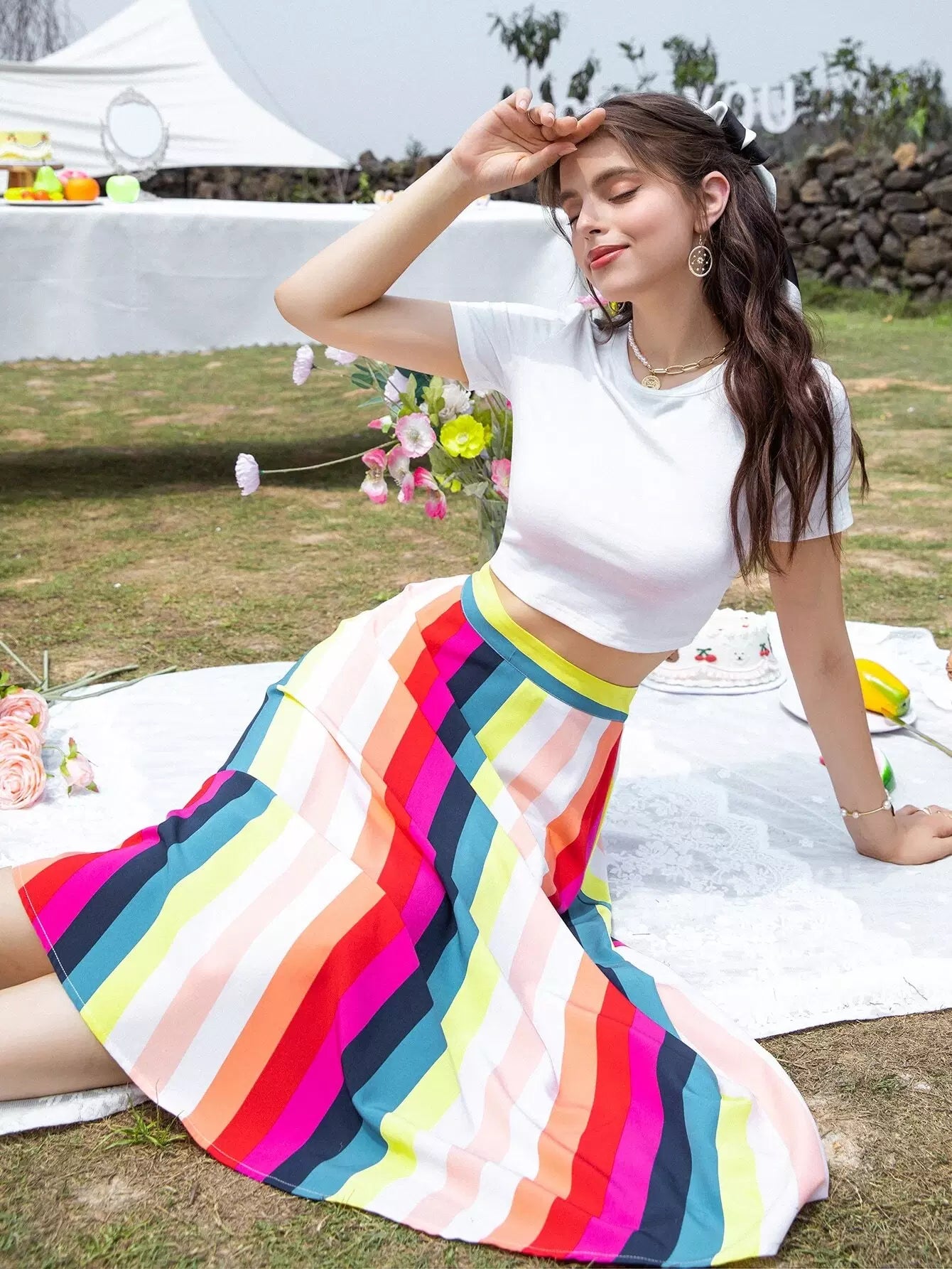 تي شيرت قصير سادة مع تنورة مخططة بسحاب في الخلف
