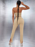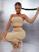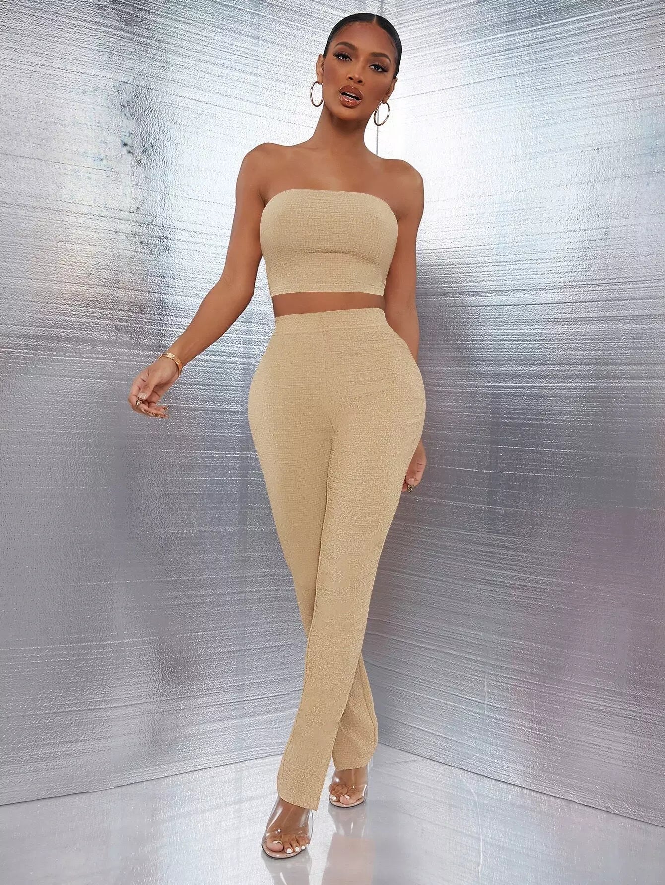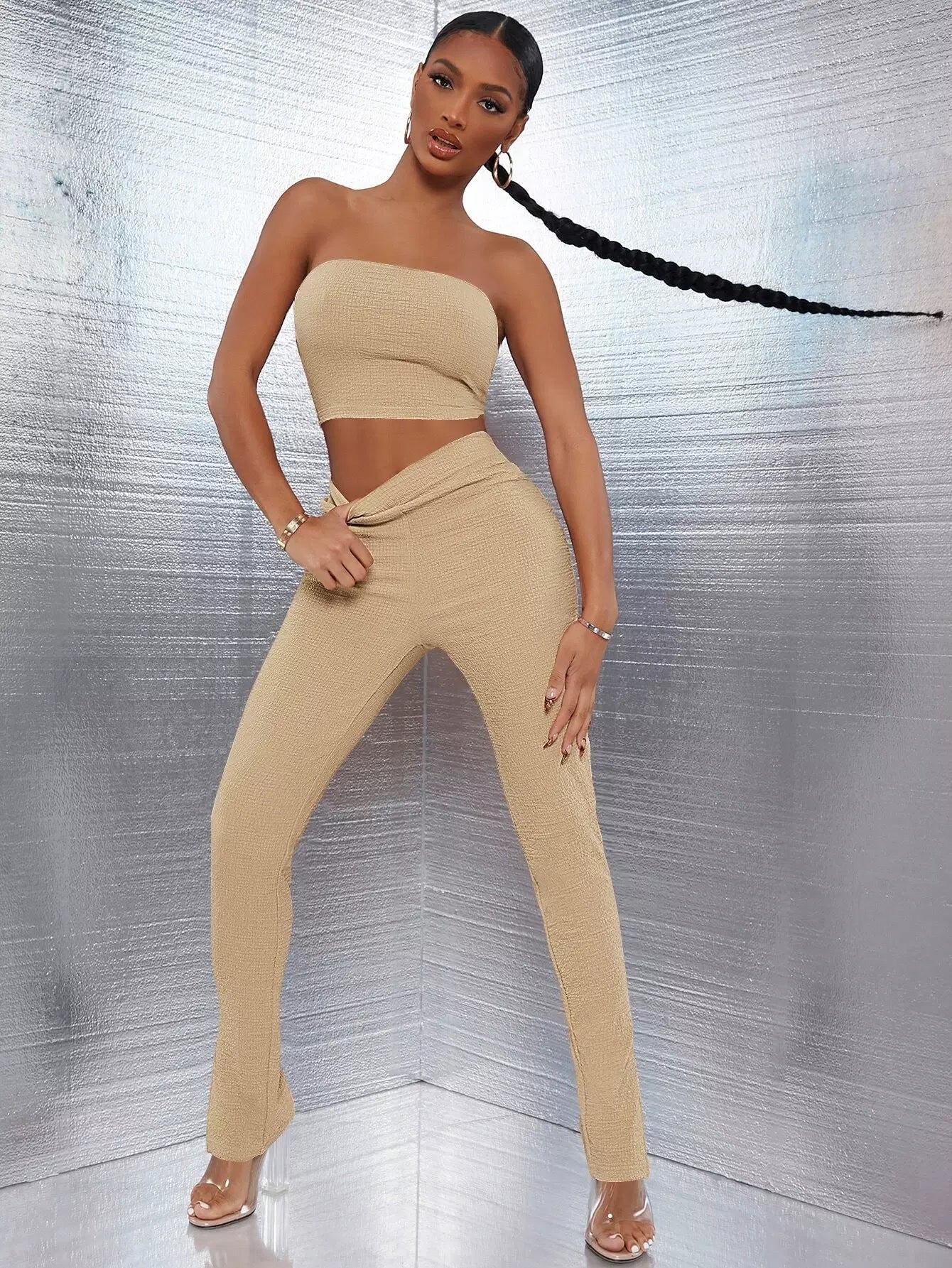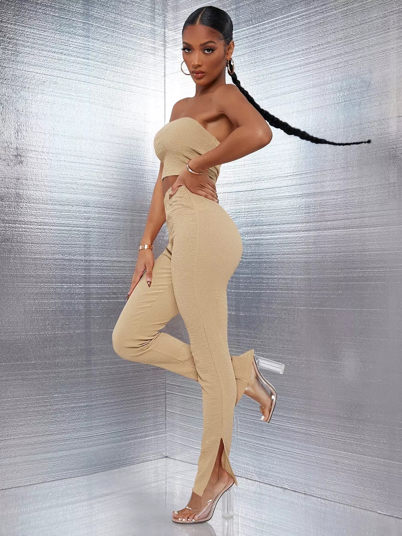 طقم بلوزة أنبوبي قصير سادة وبنطلون بحافة مشقوقة