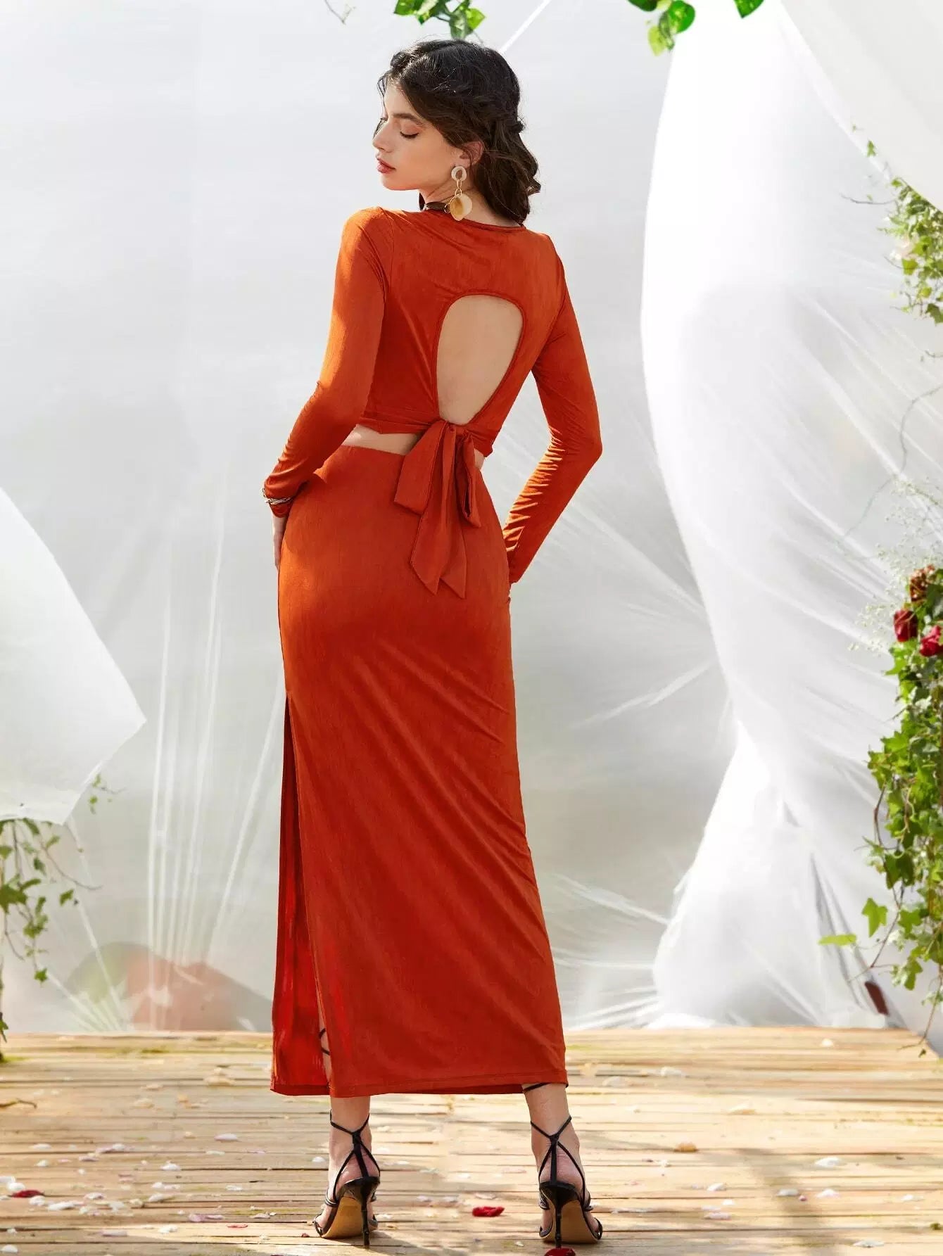 طقم بلوزة بفتحة ظهر مفتوحة بفتحة قصيرة، وتنورة بحافة مقسمة