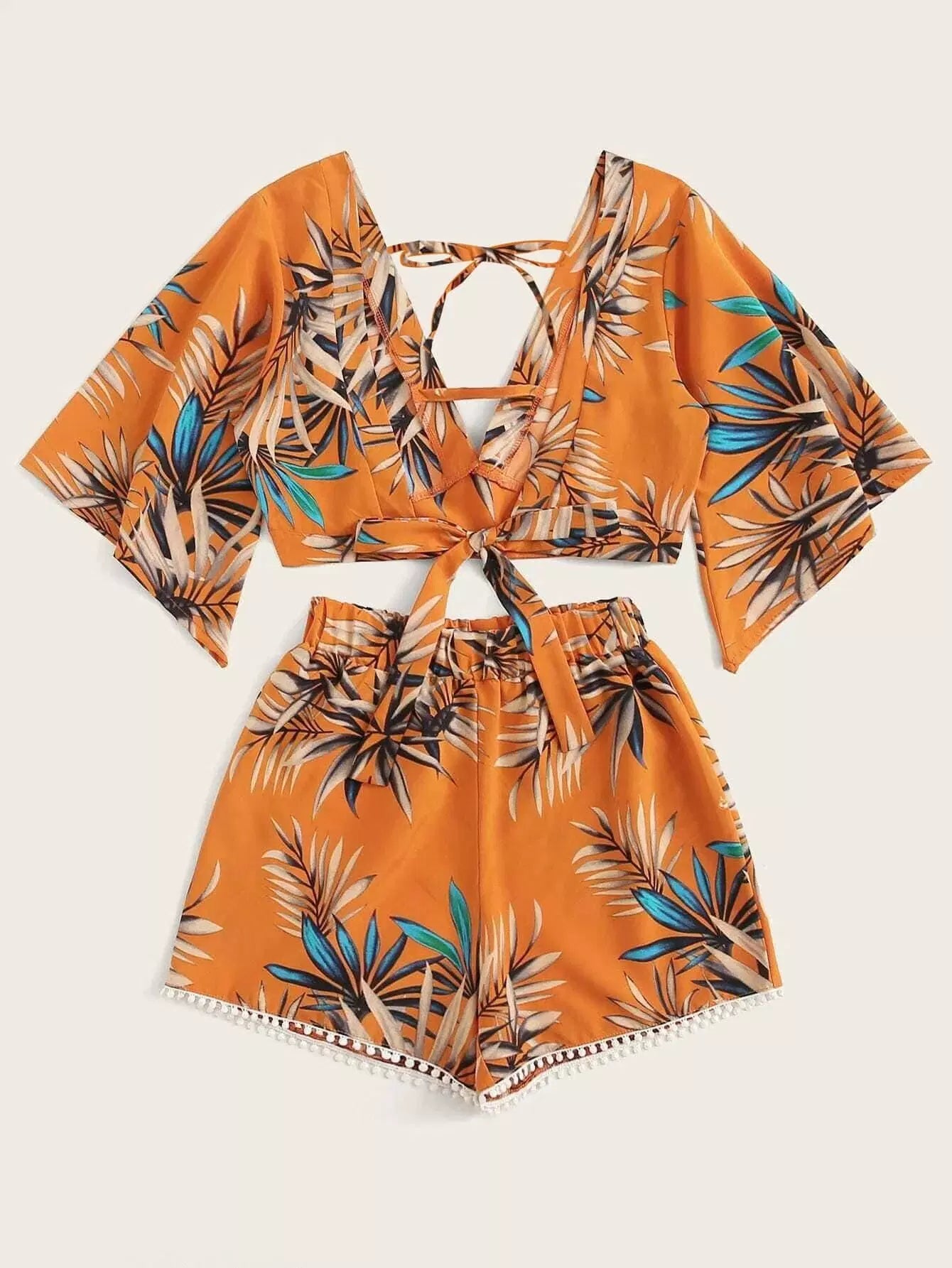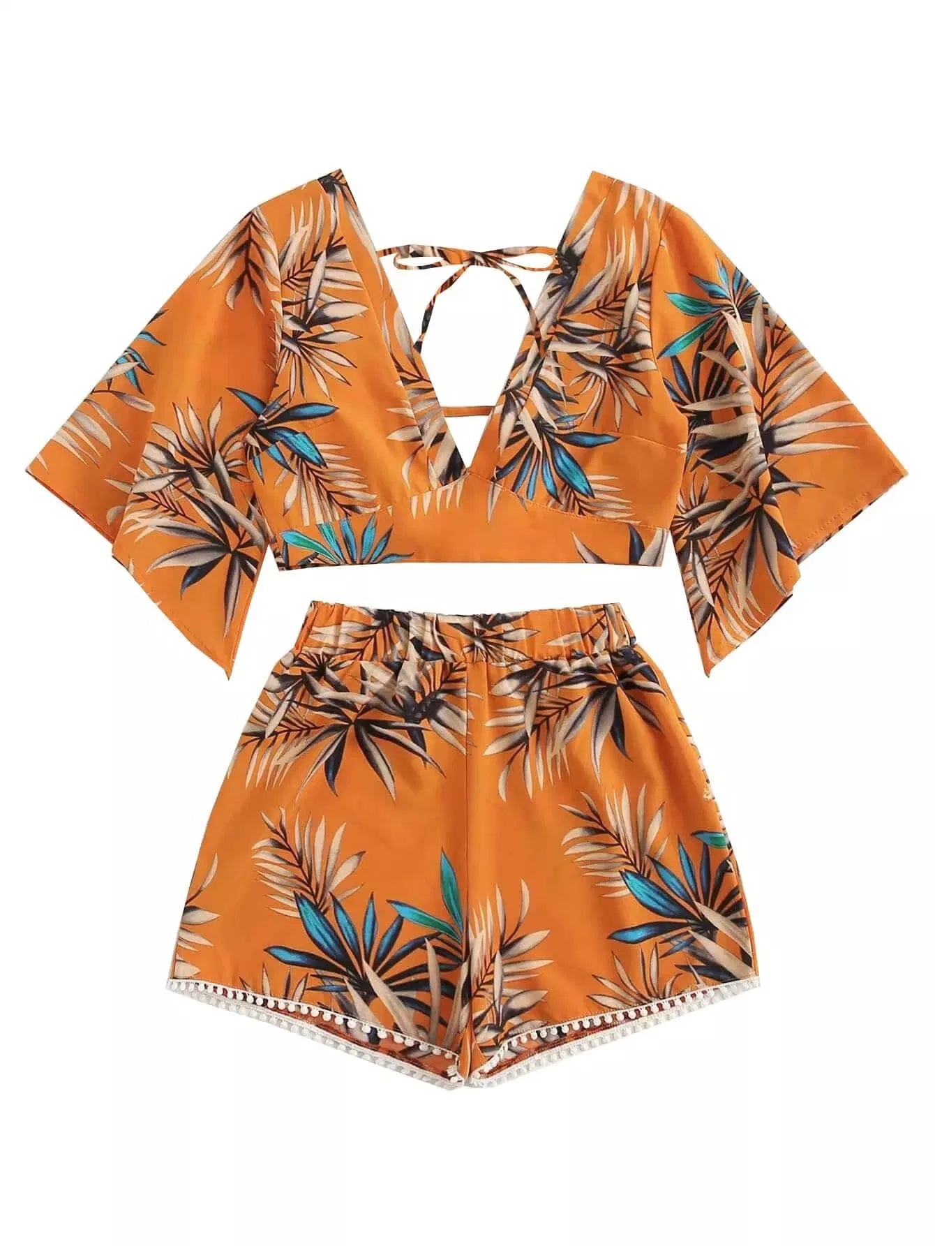 طقم بلوزة قصيرة بقصّة قصيرة استوائية واسعة وشورت قصير بوم بوم