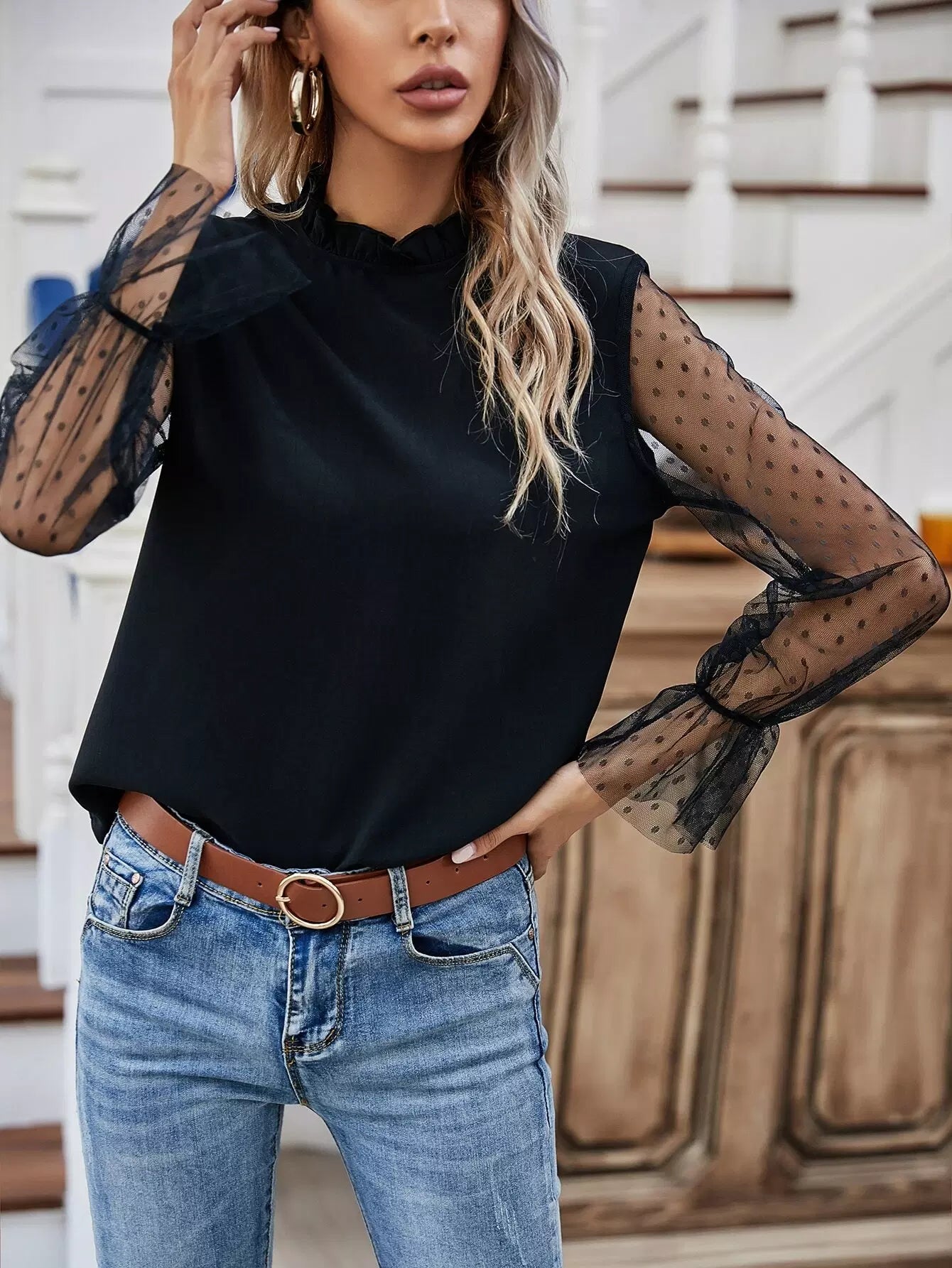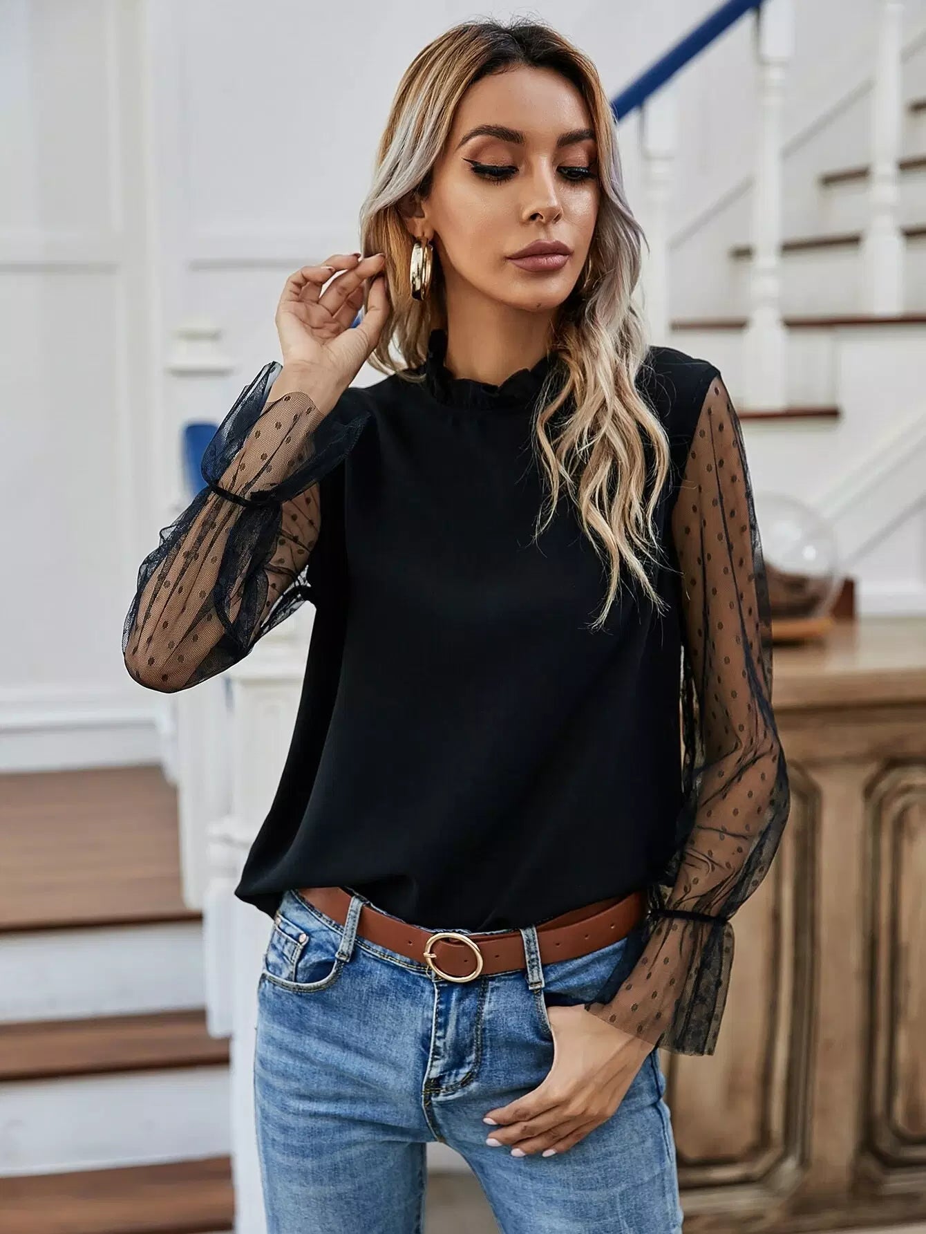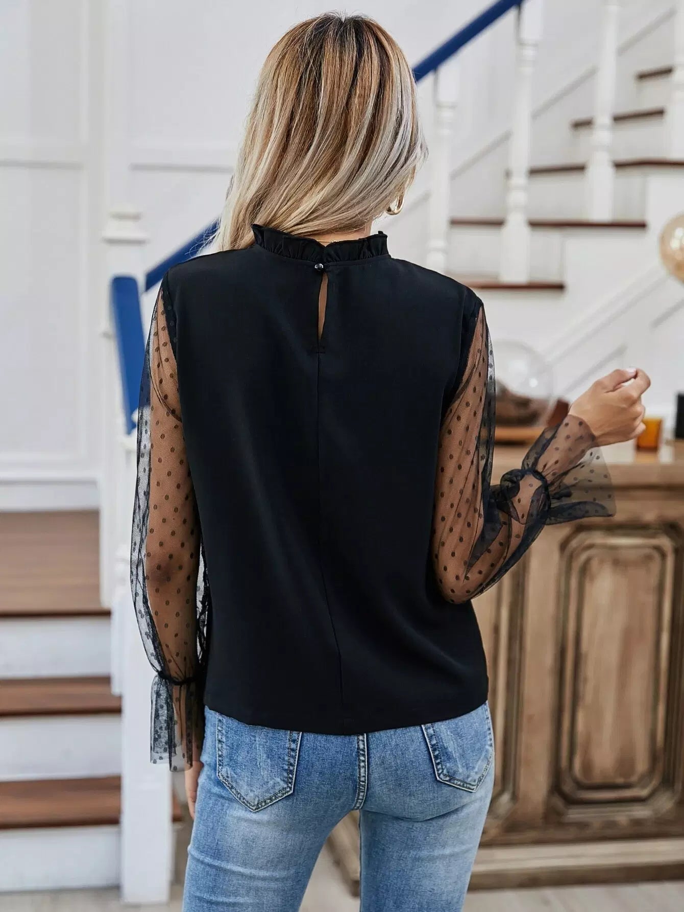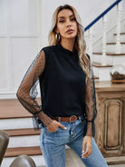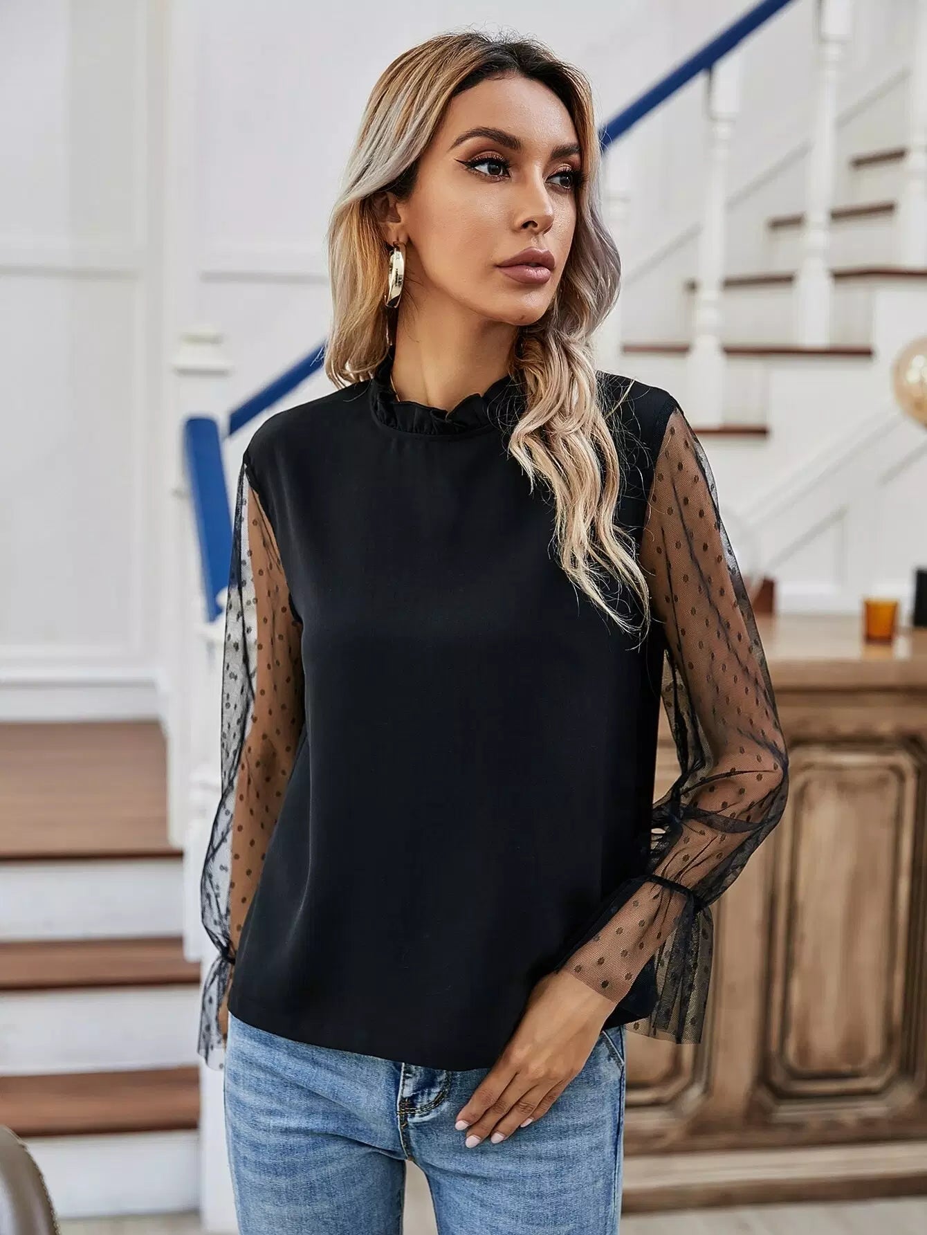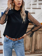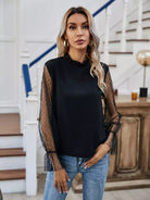 بلوزة بأكمام شبكية كشكش برقبة كشكش