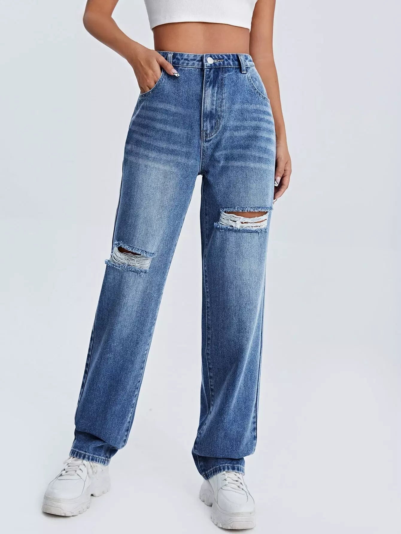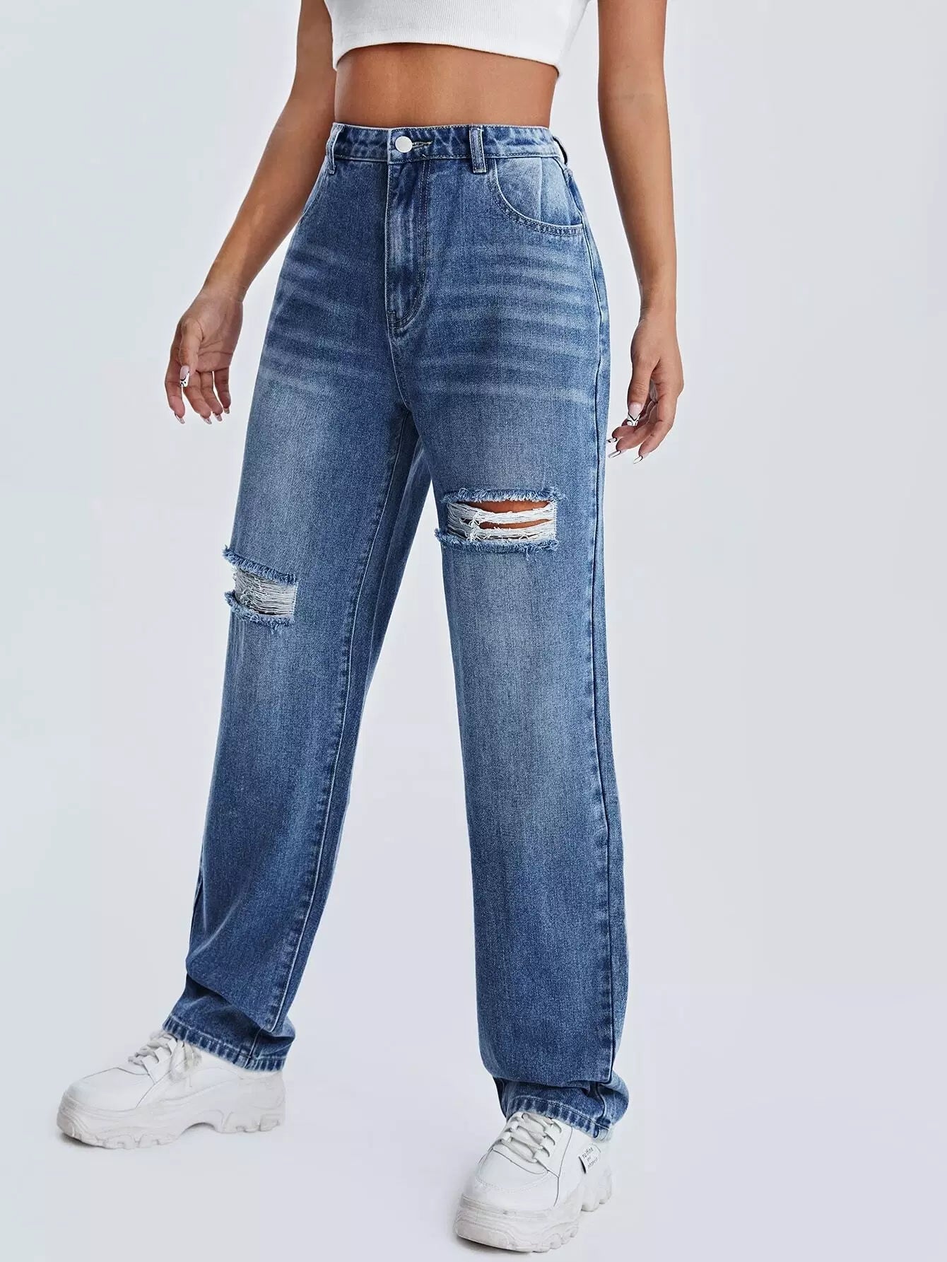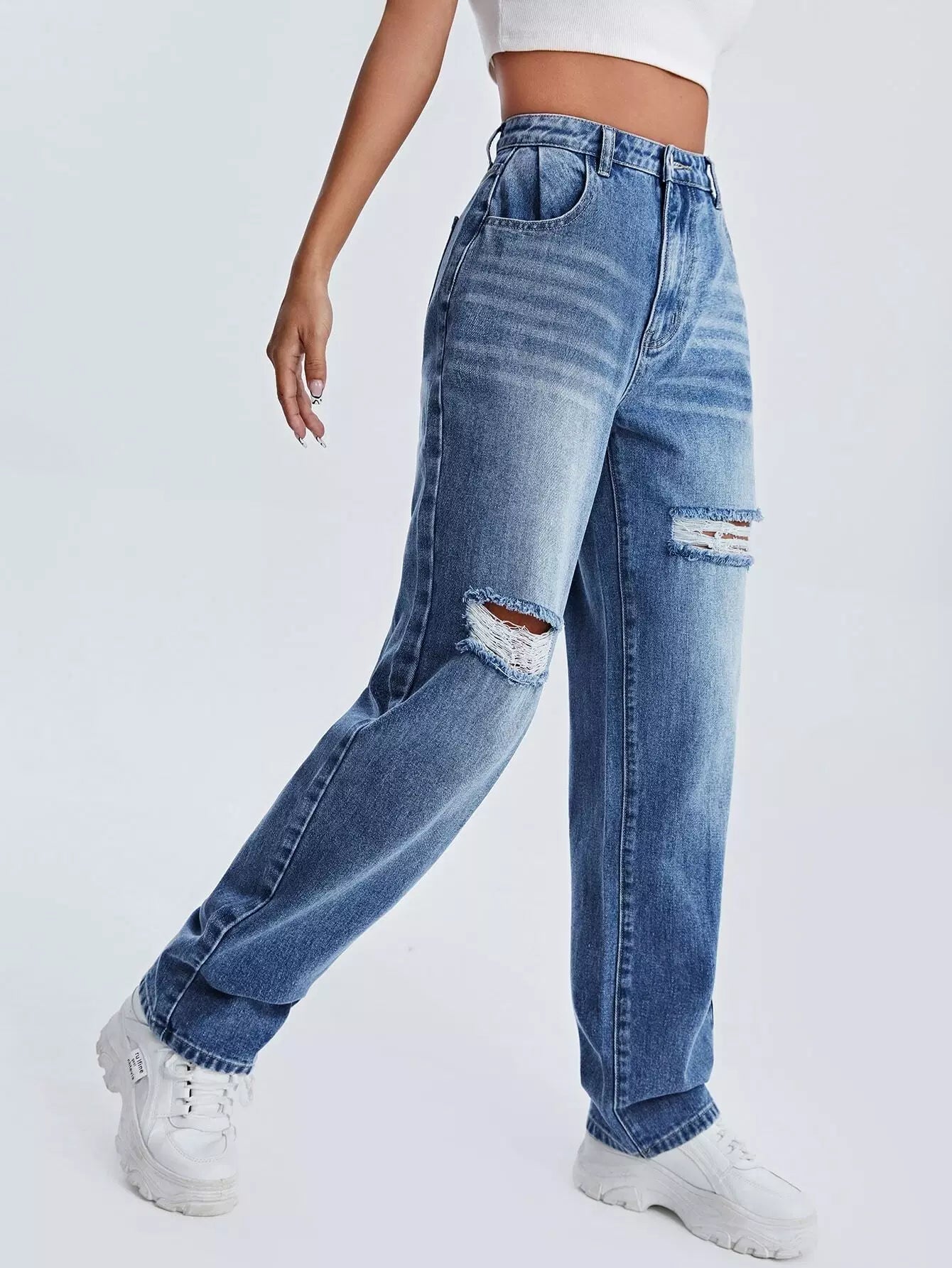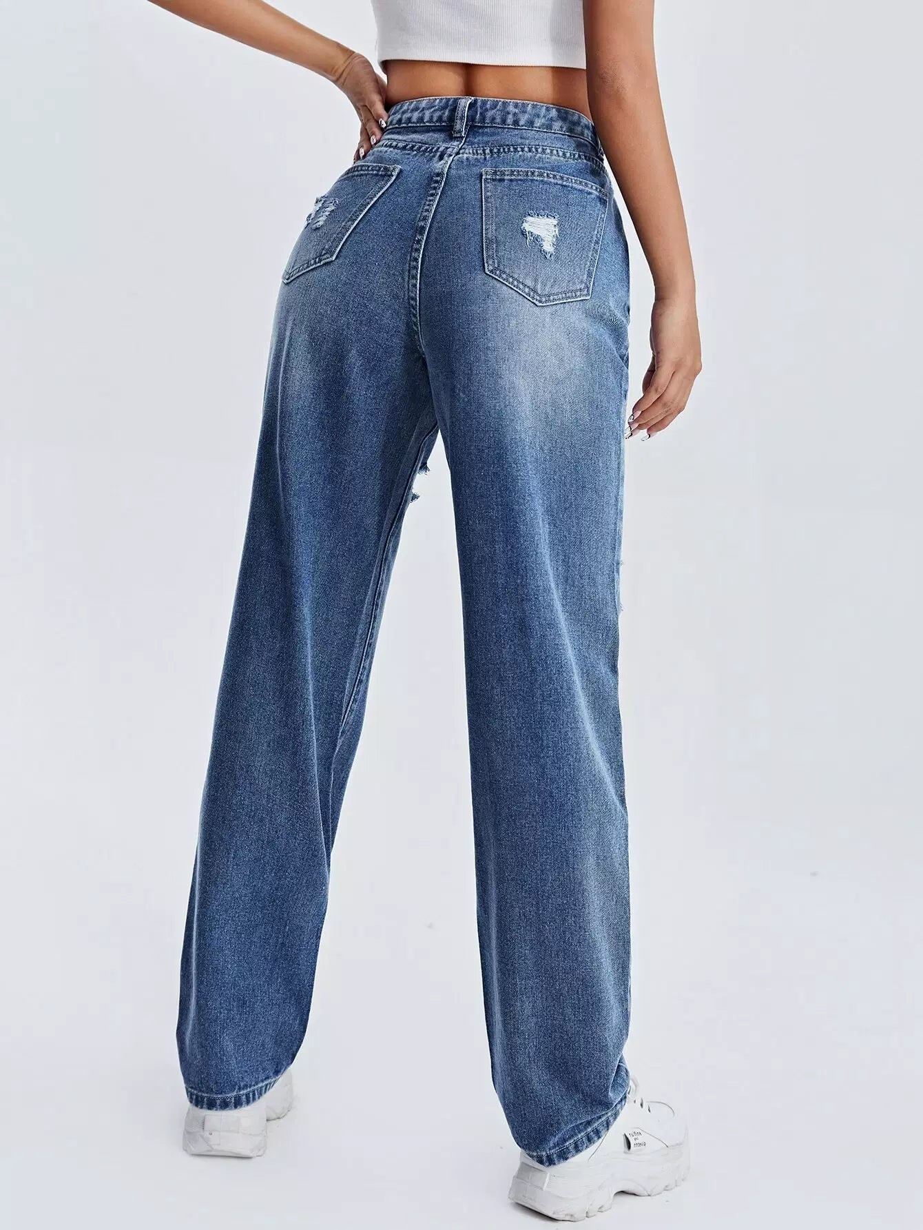 بنطلون جينز بخصر عالٍ ممزق عالي الخصر