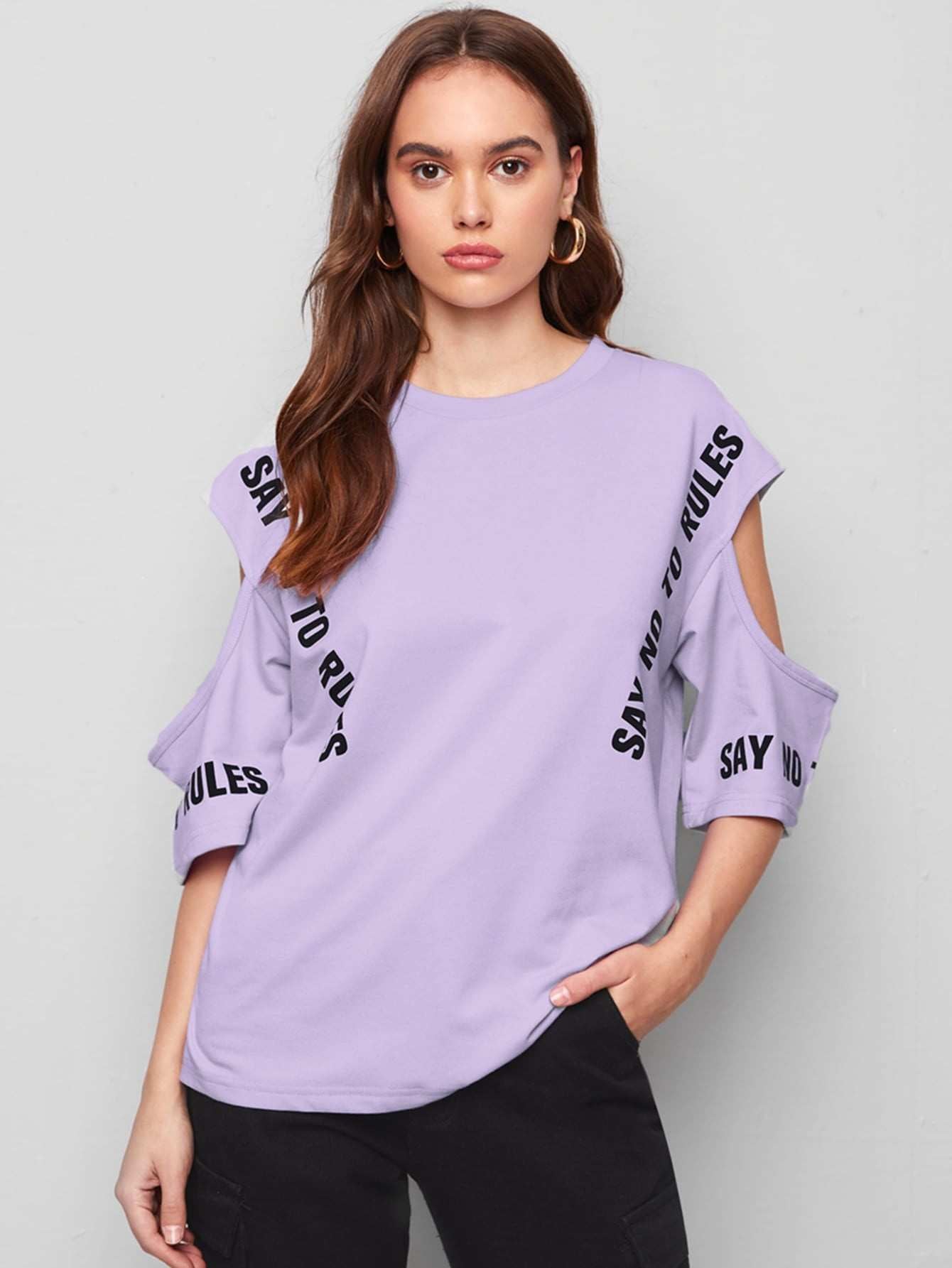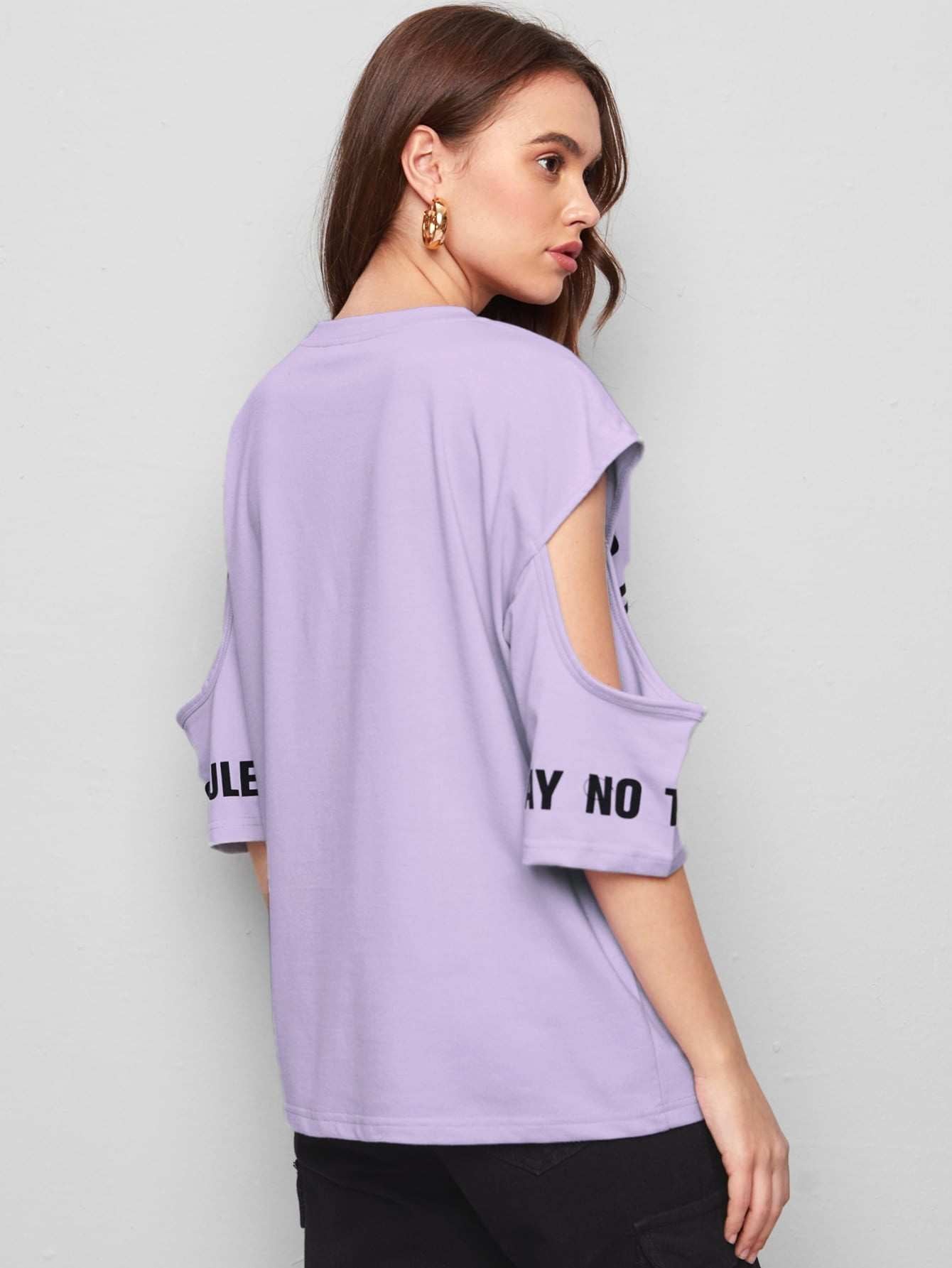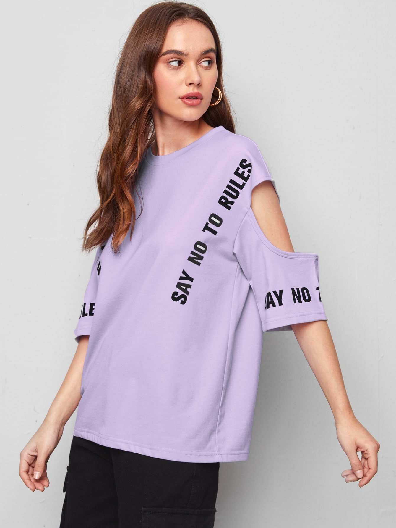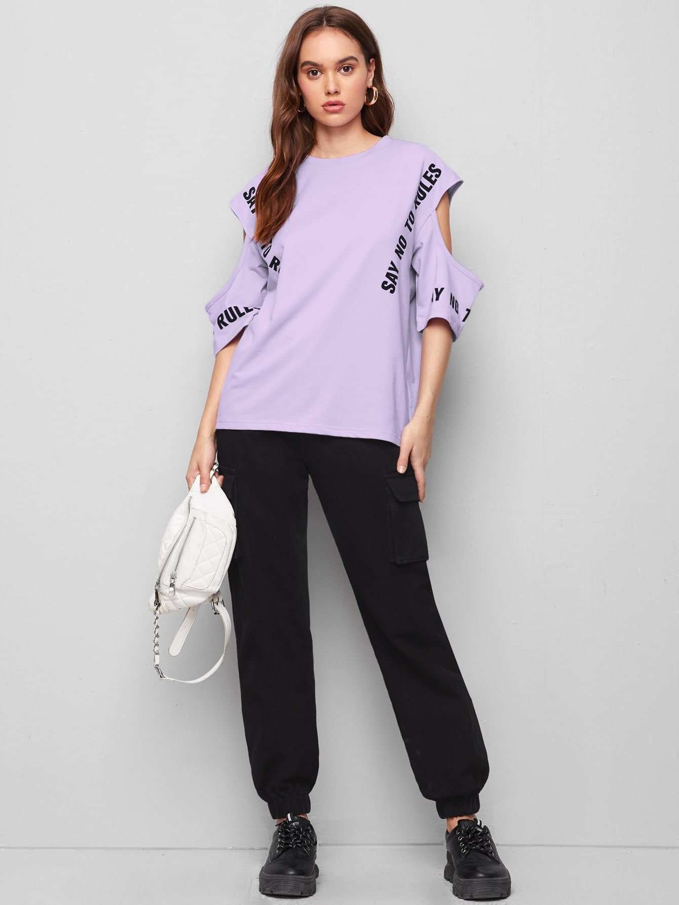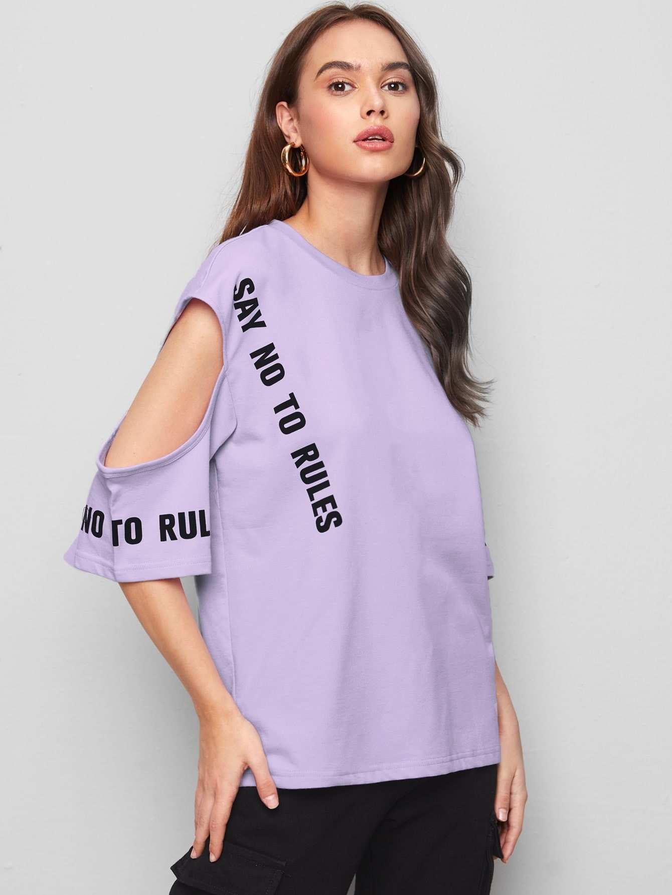 تي شيرت برسومات حروف وأكمام مقصوصة