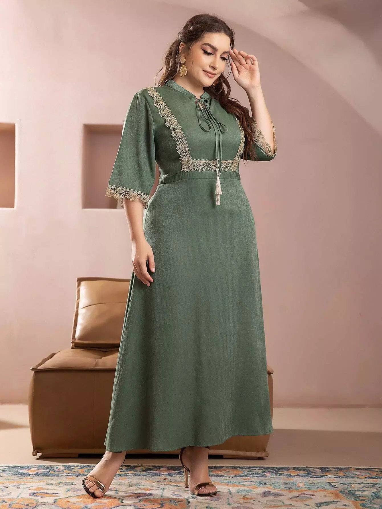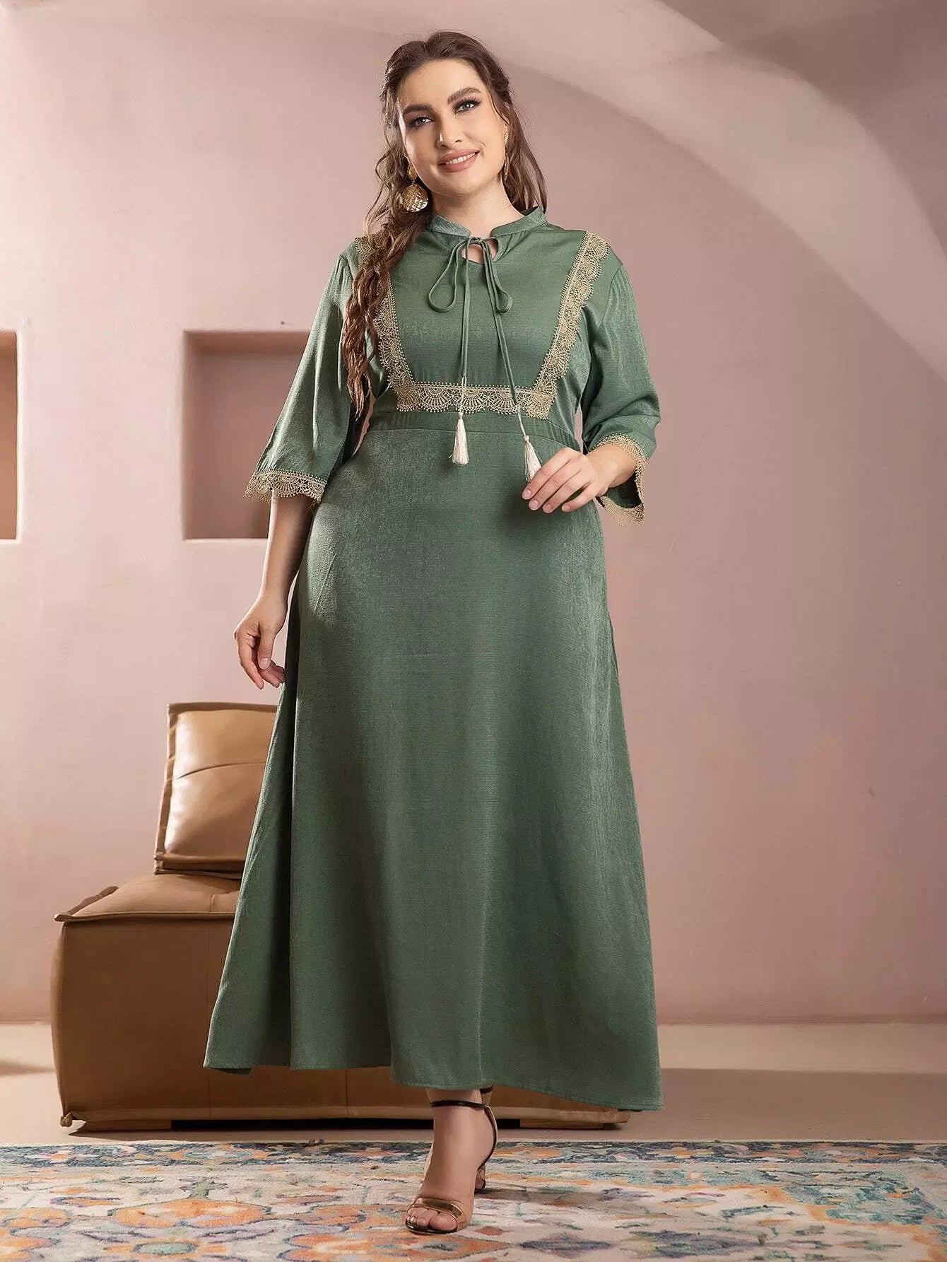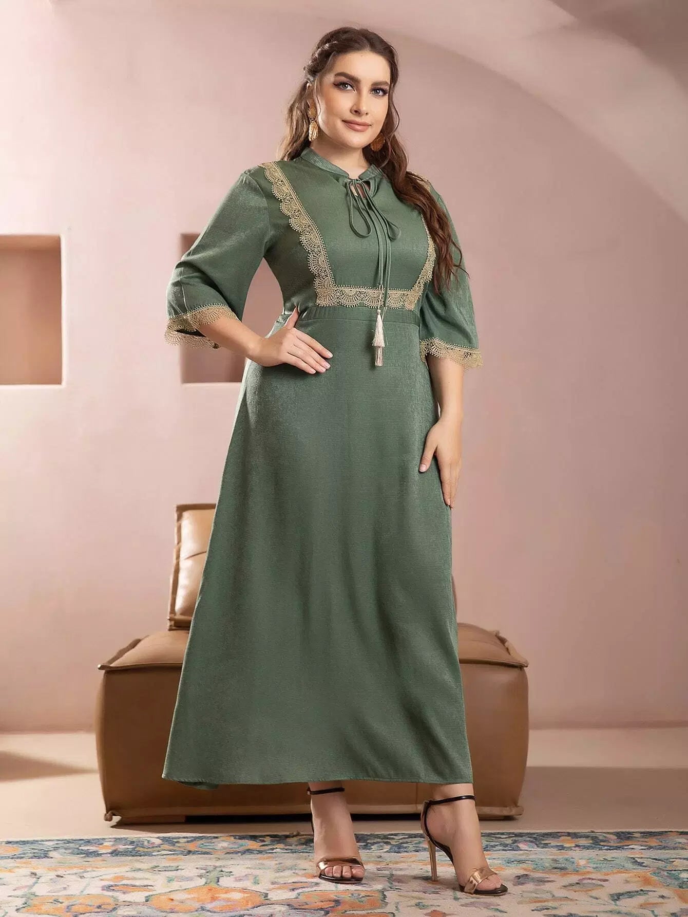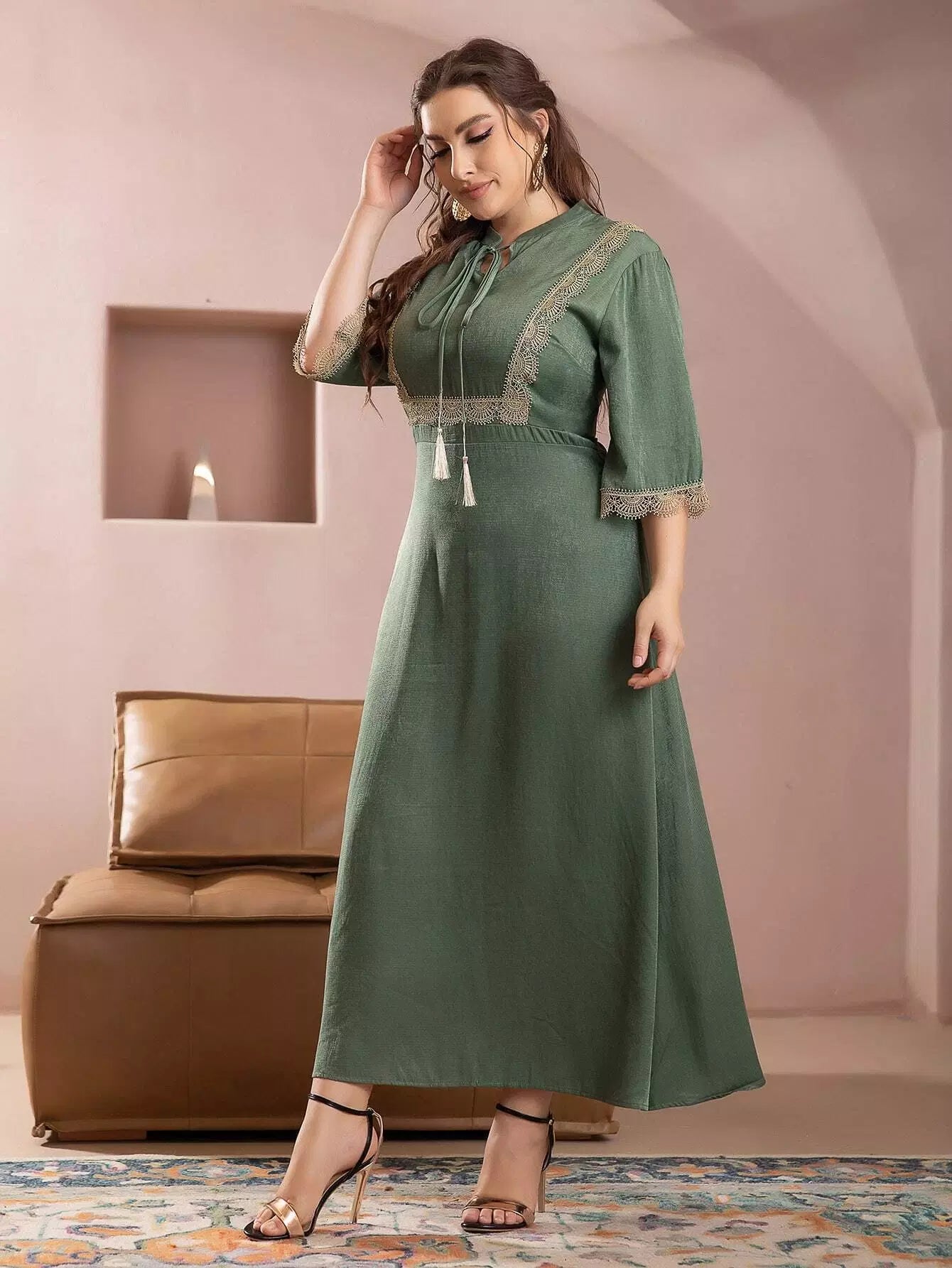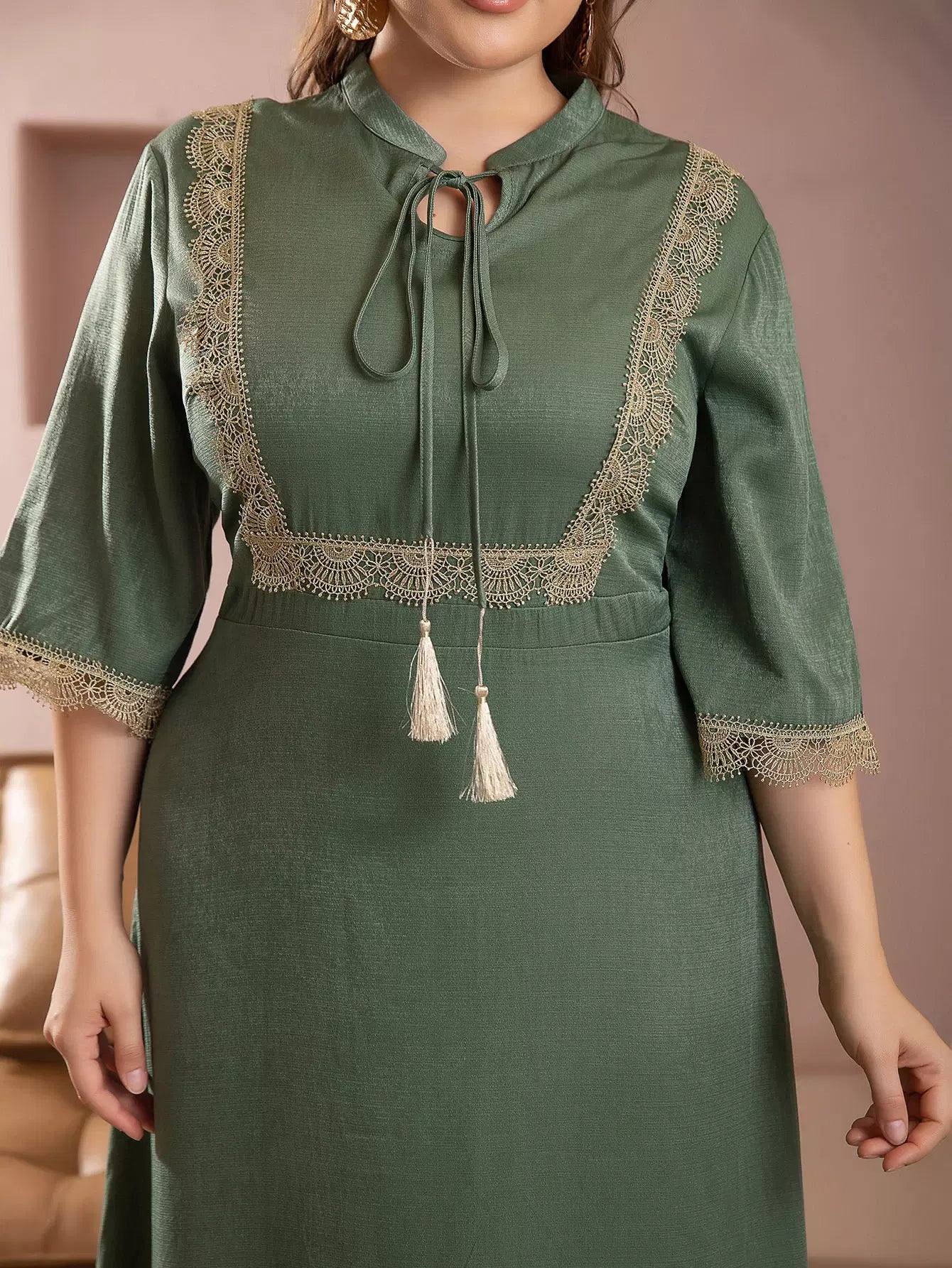 نحيف - مقاس كبير فستان بربطات عنق بشرابة وشريط من الدانتيل