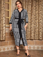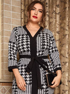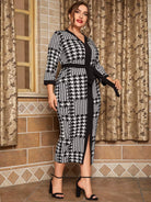 بالإضافة إلى فستان بنقشة هاوندزتوث وبحواف مقسمة بدون حزام