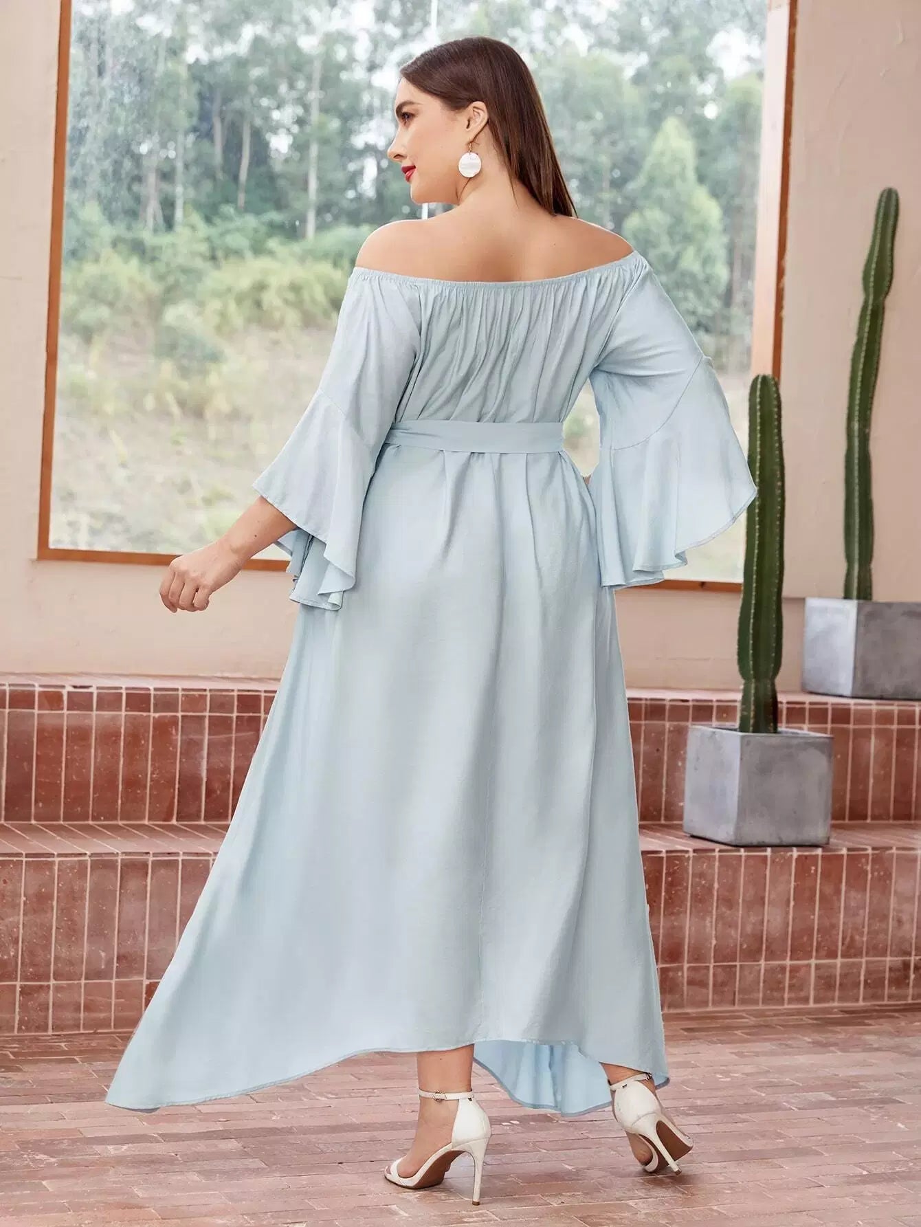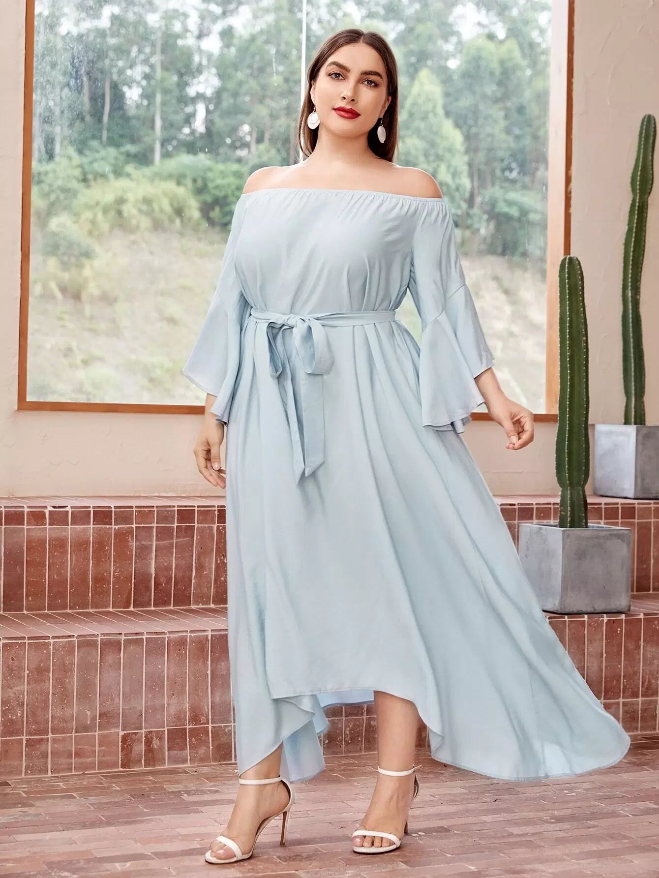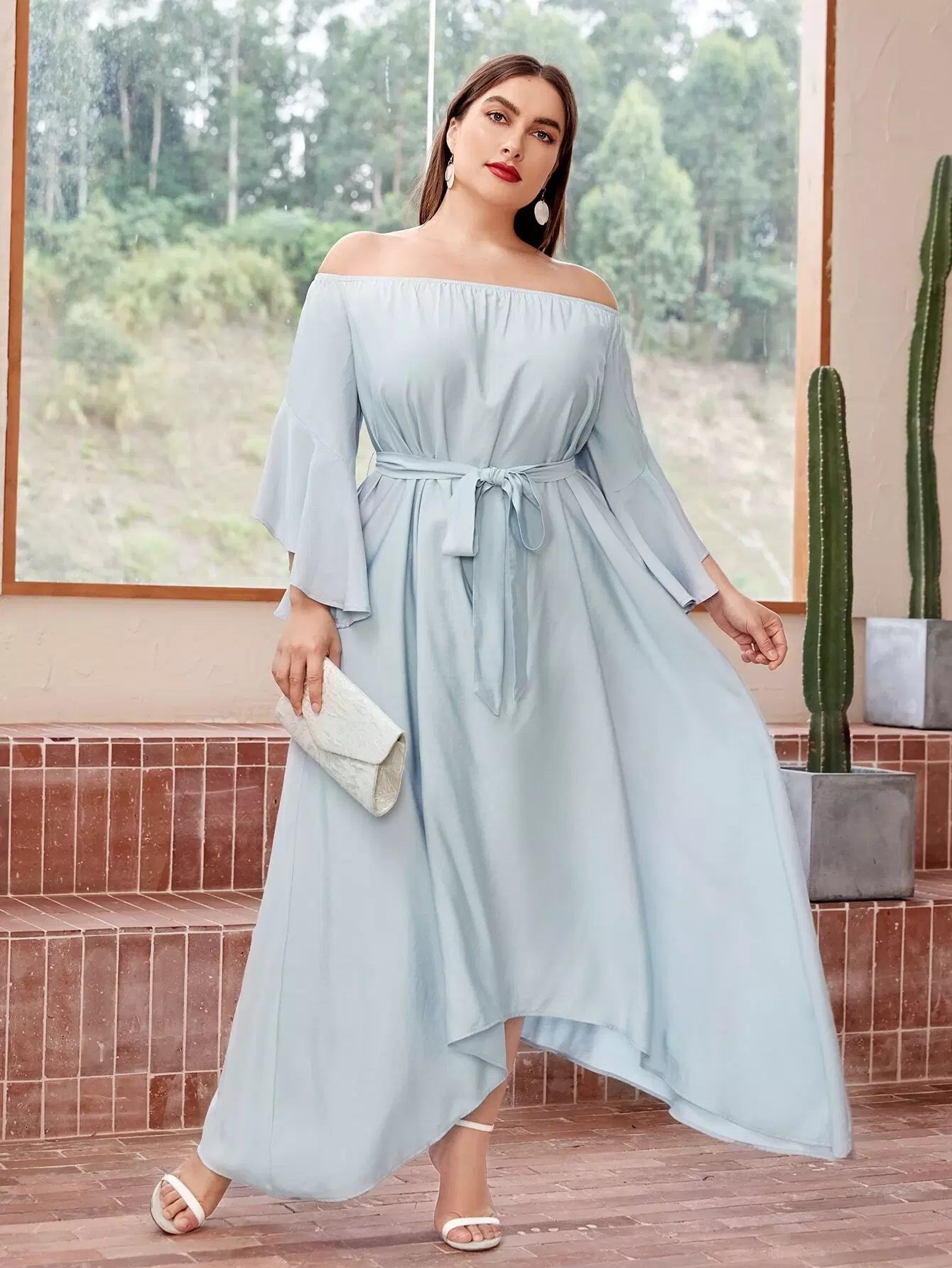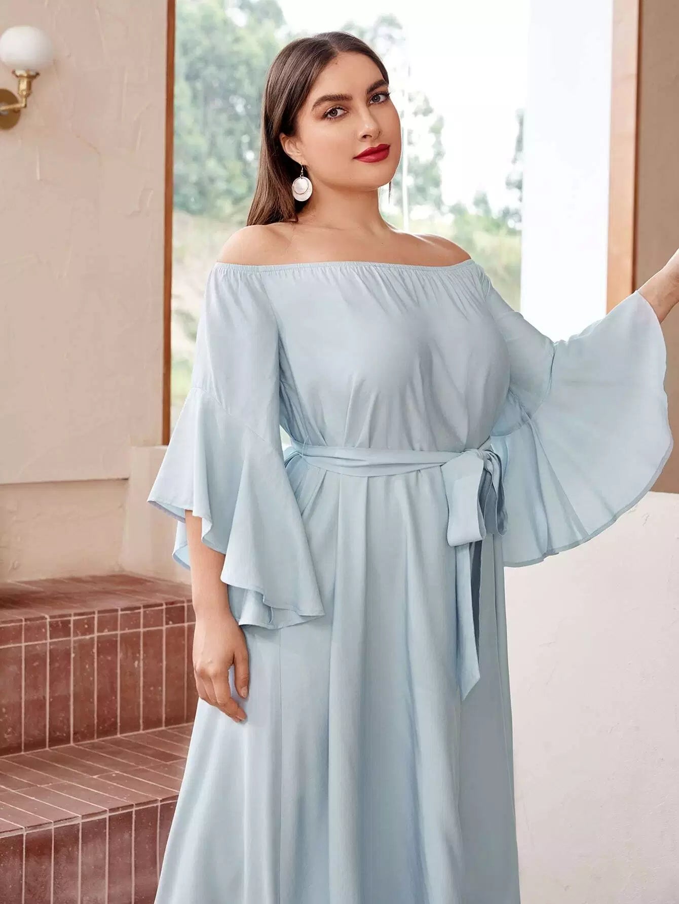 بالإضافة إلى فستان بدون أكتاف وأكمام واسعة وحاشية غير متماثلة بدون حزام