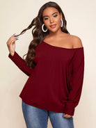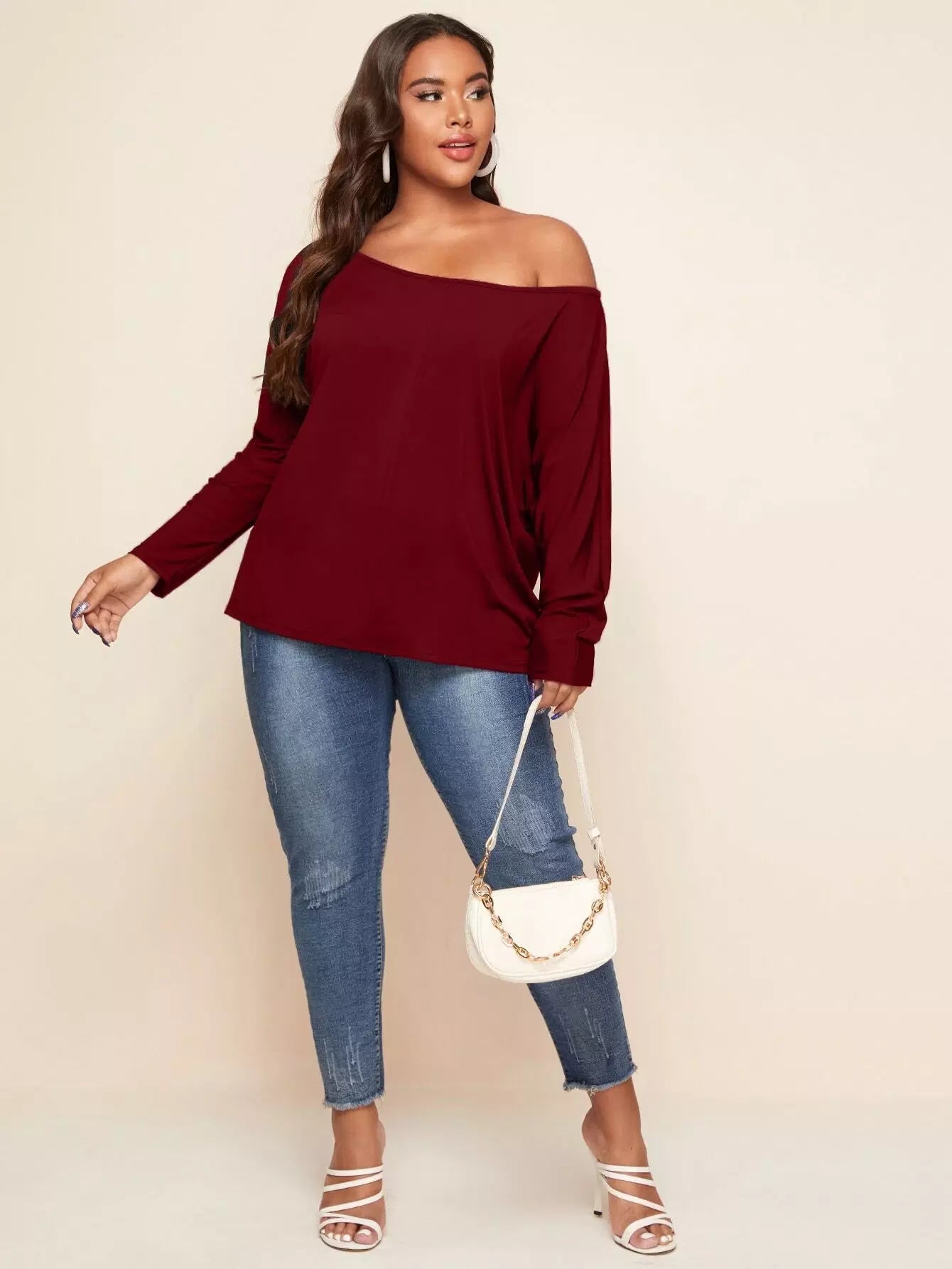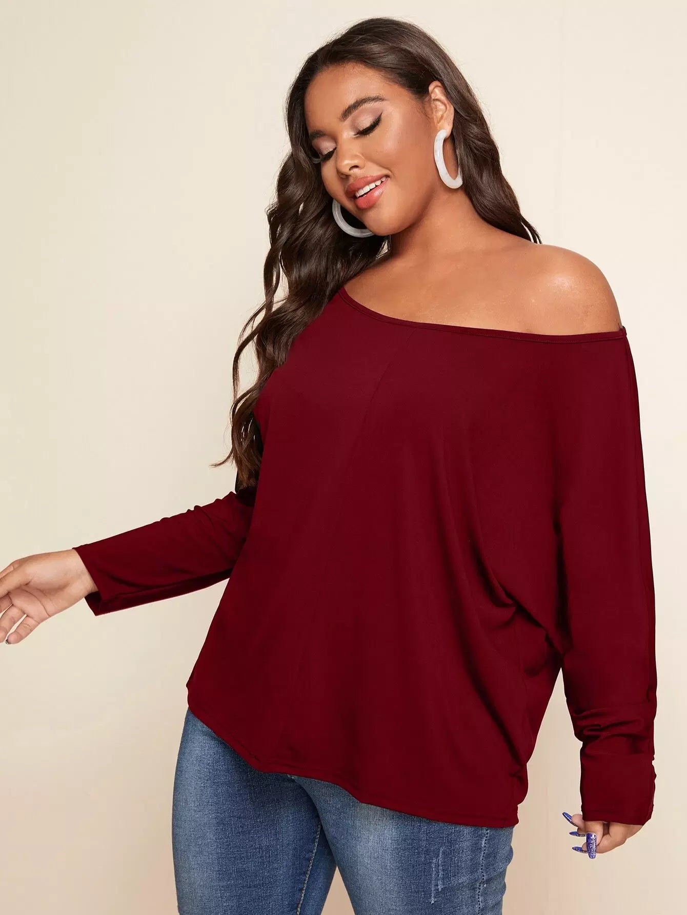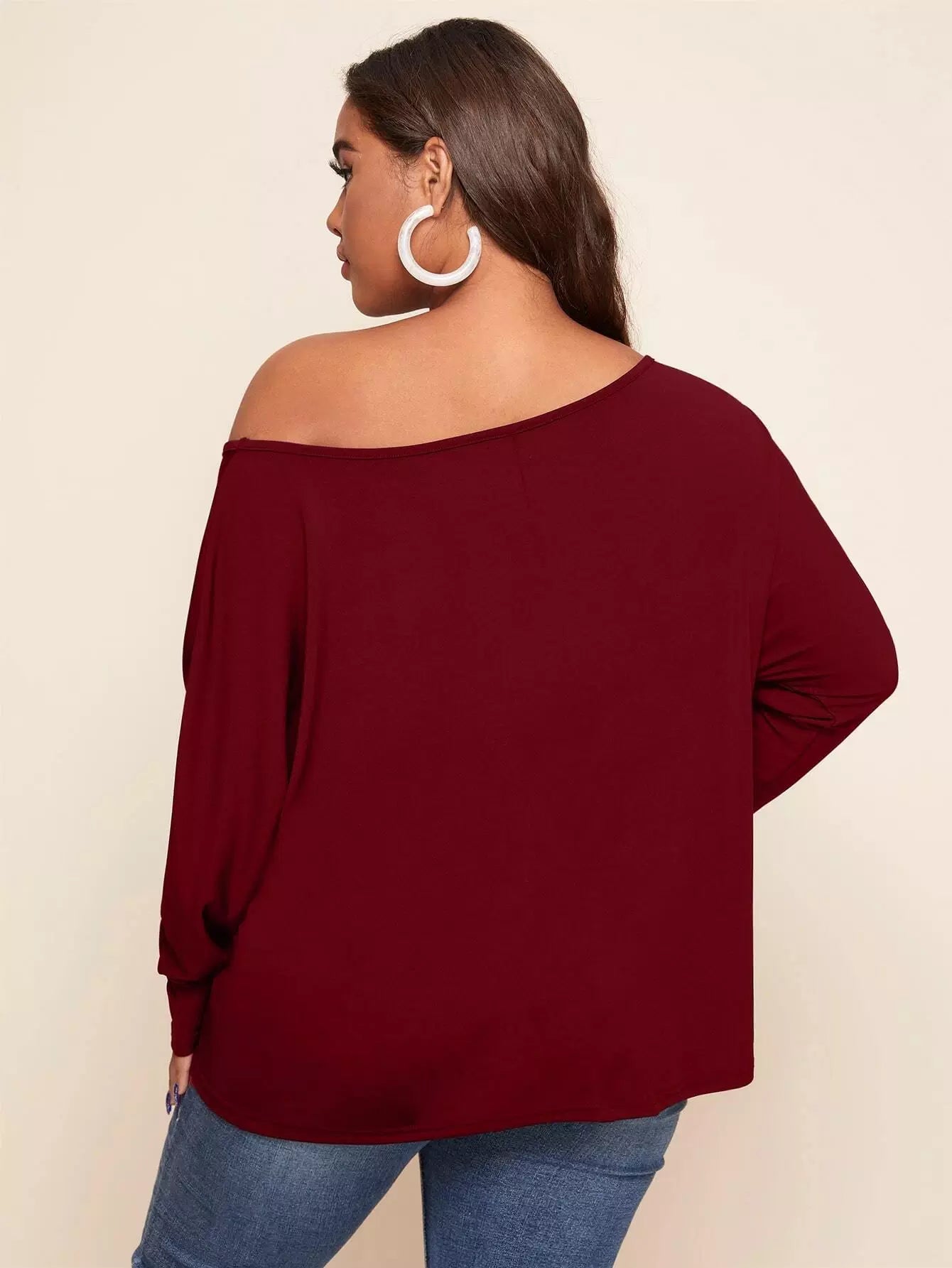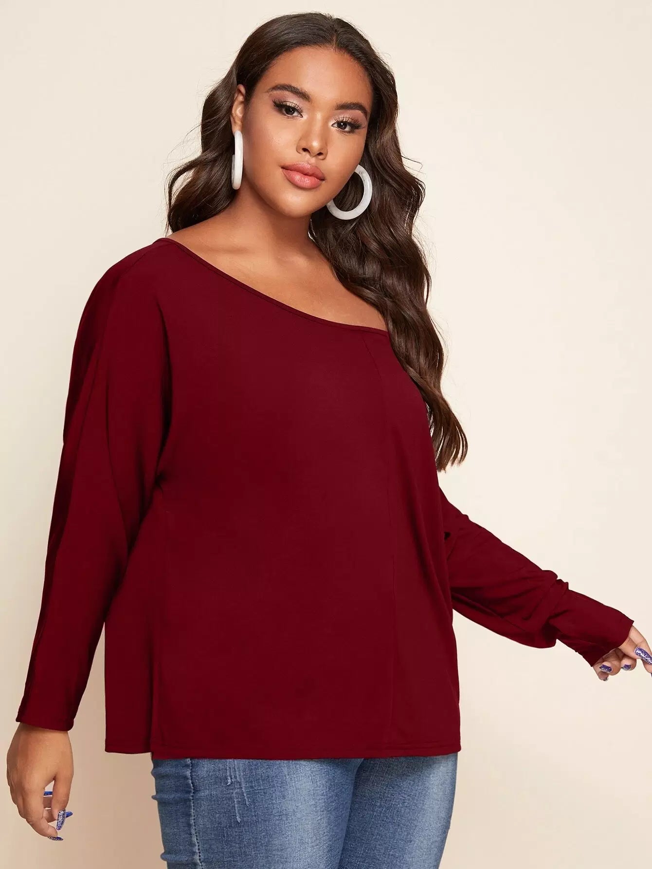 نحيف - مقاس كبير تي شيرت سادة برقبة غير متماثلة