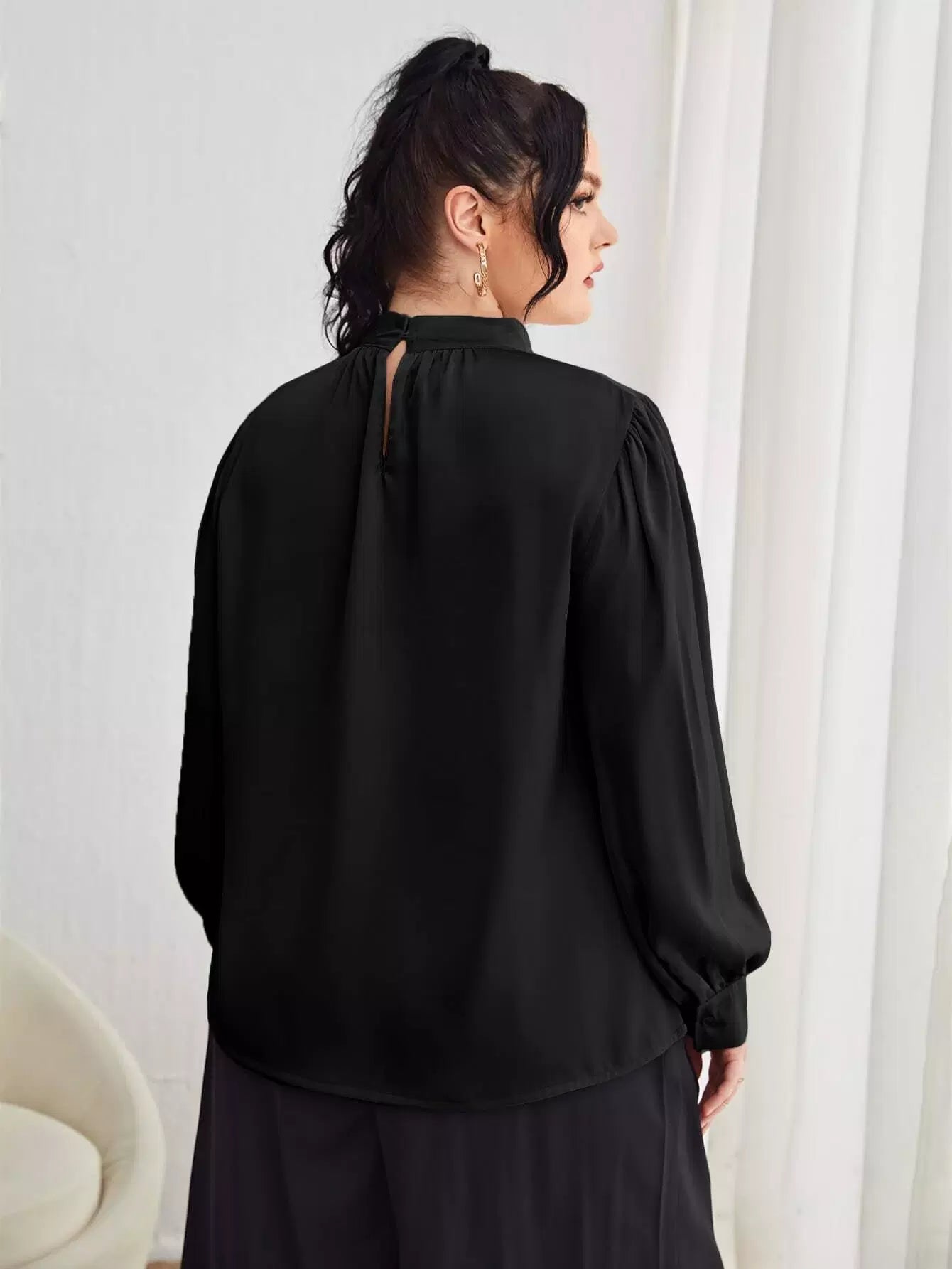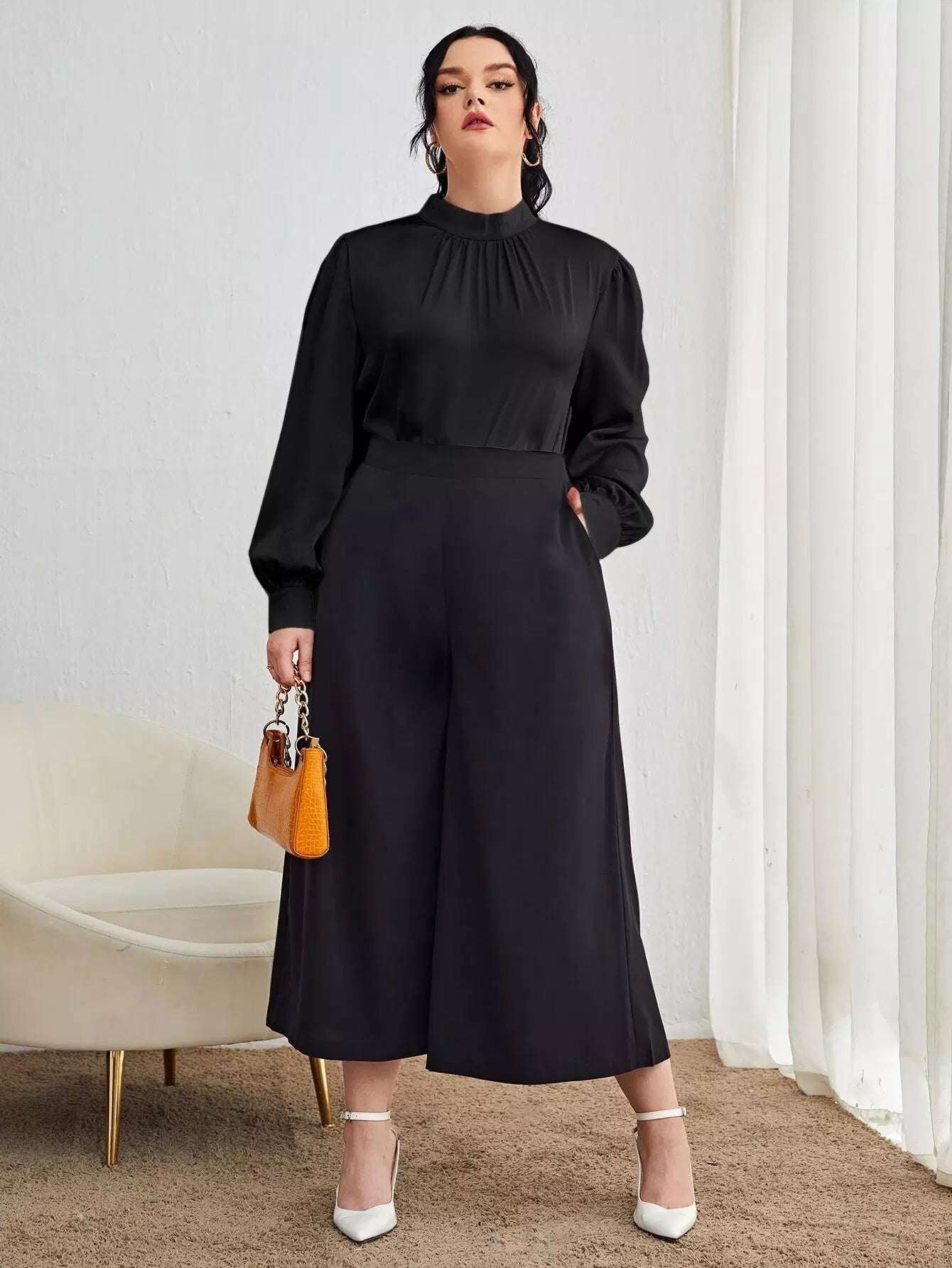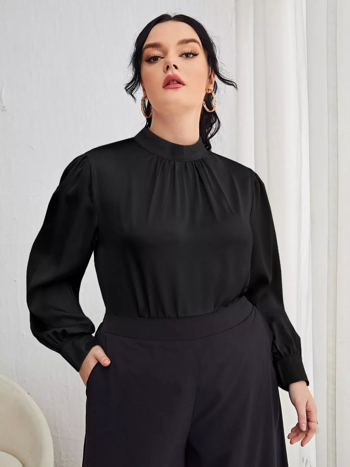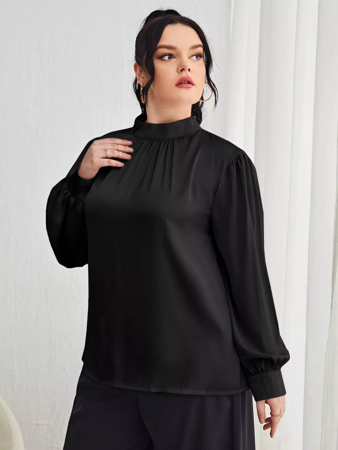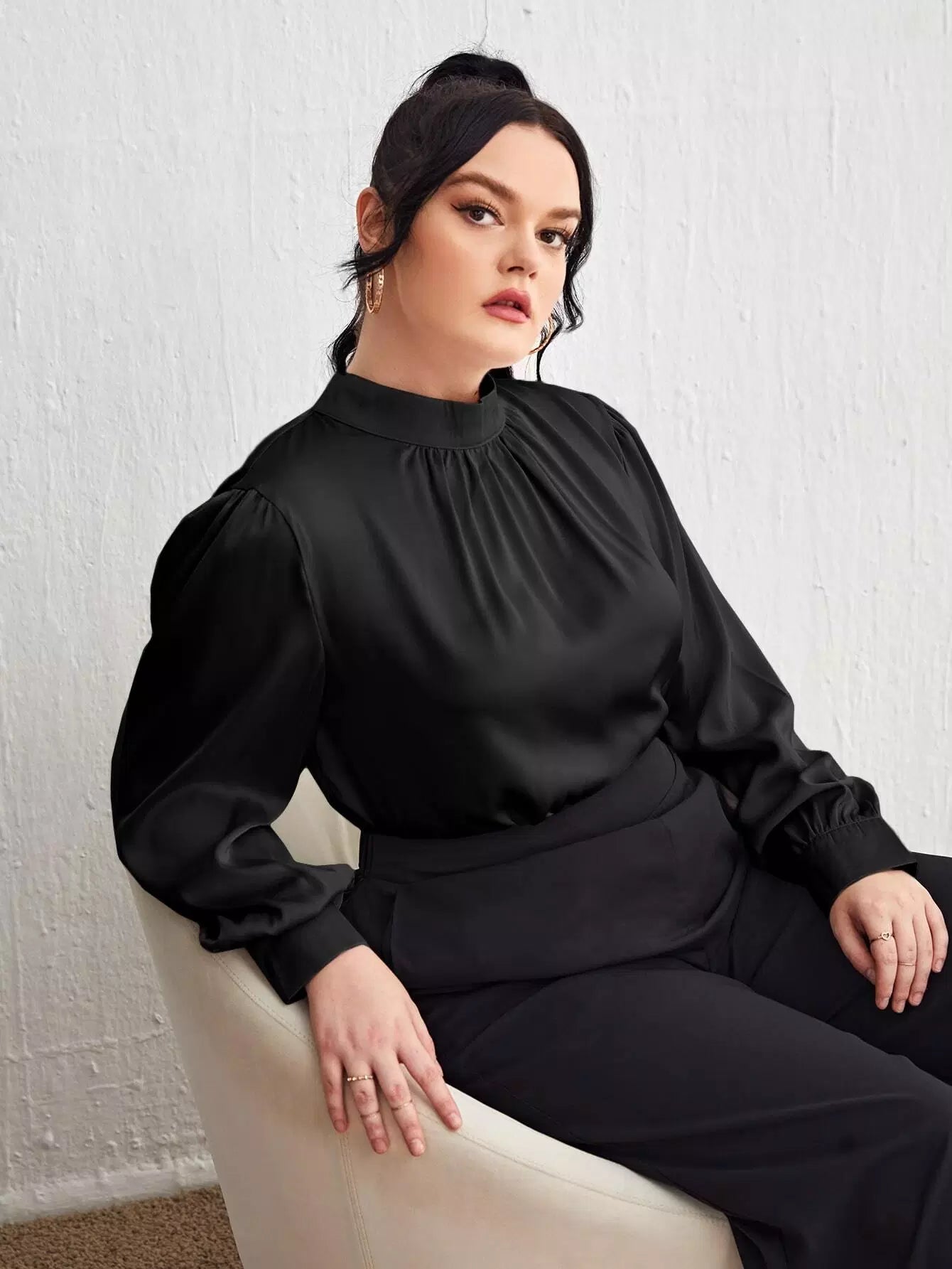 بلوزة ساتان مكشكشة برقبة مستقيمة برقبة زائد
