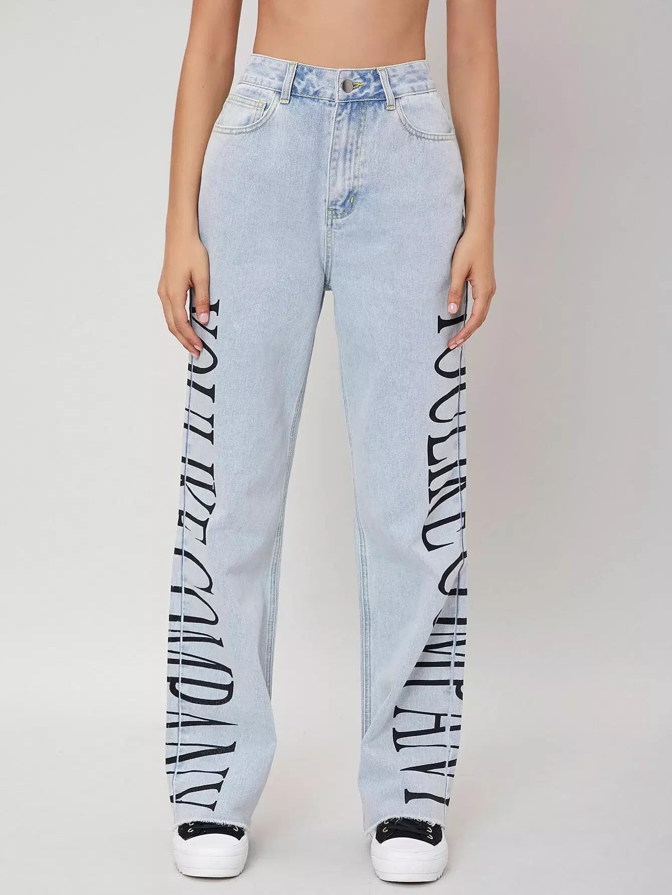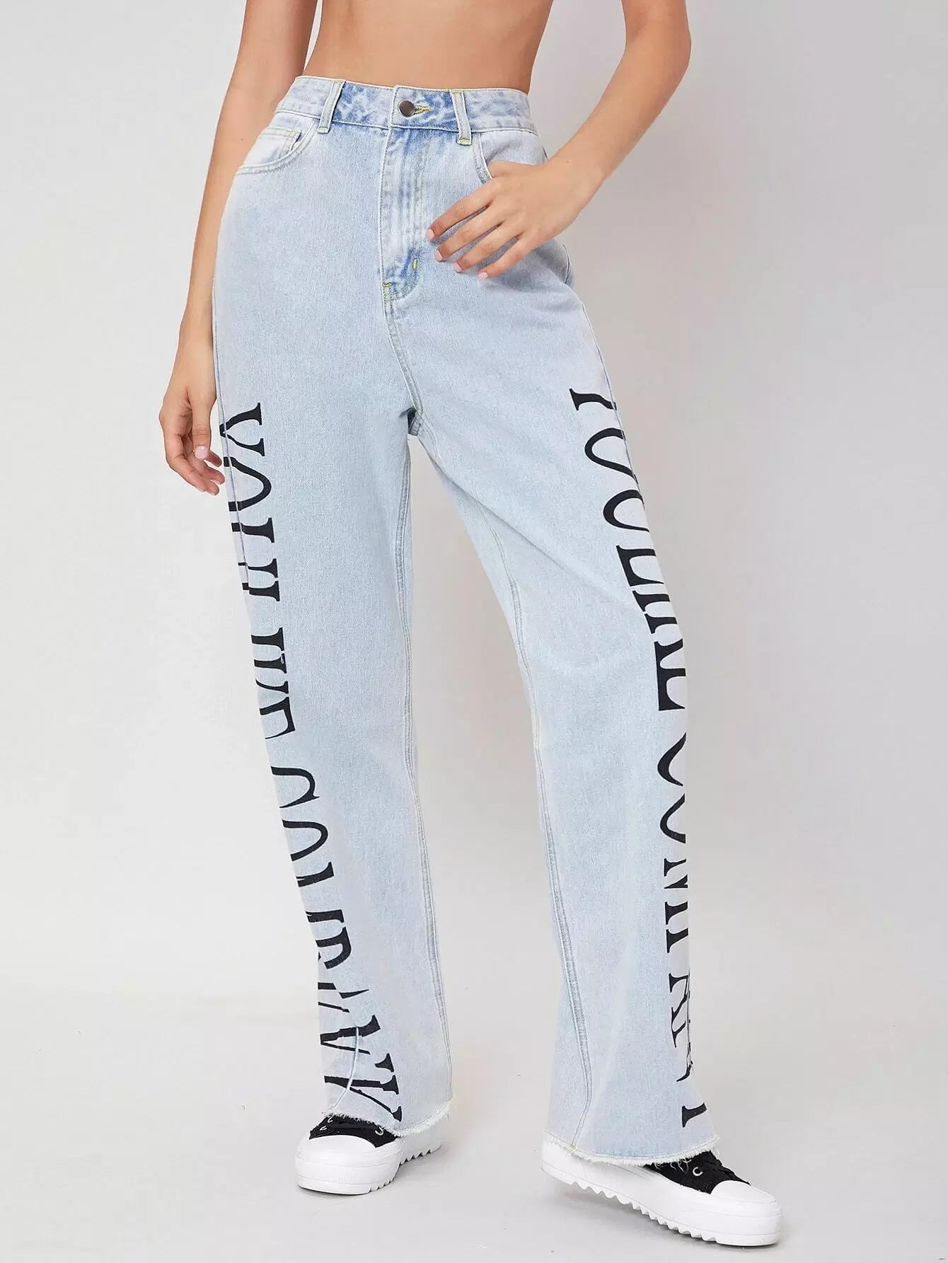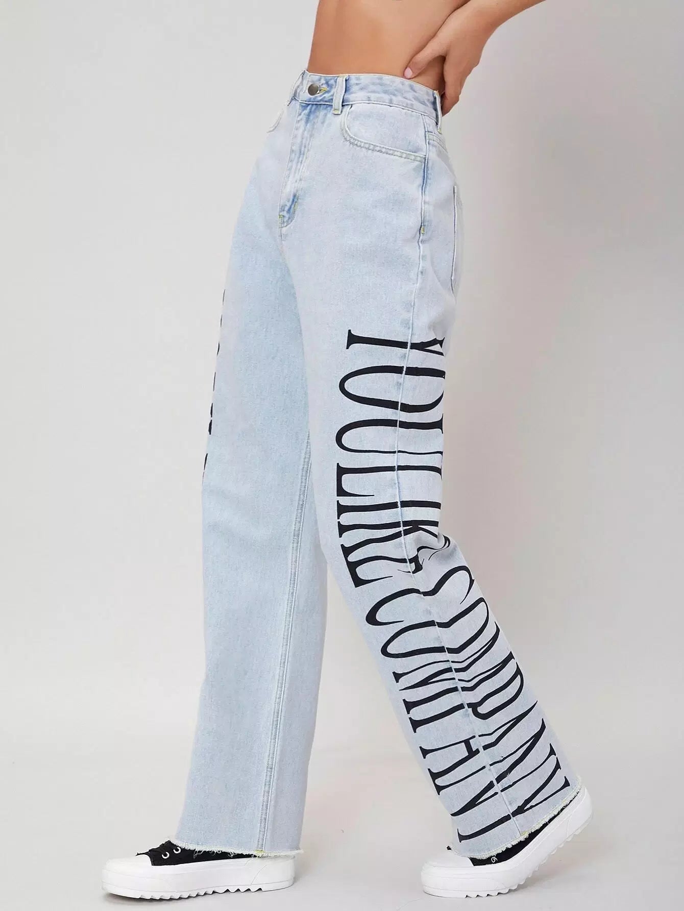 للنساء - بنطال جينز برسومات مغسولة خفيفًا وبحواف خام