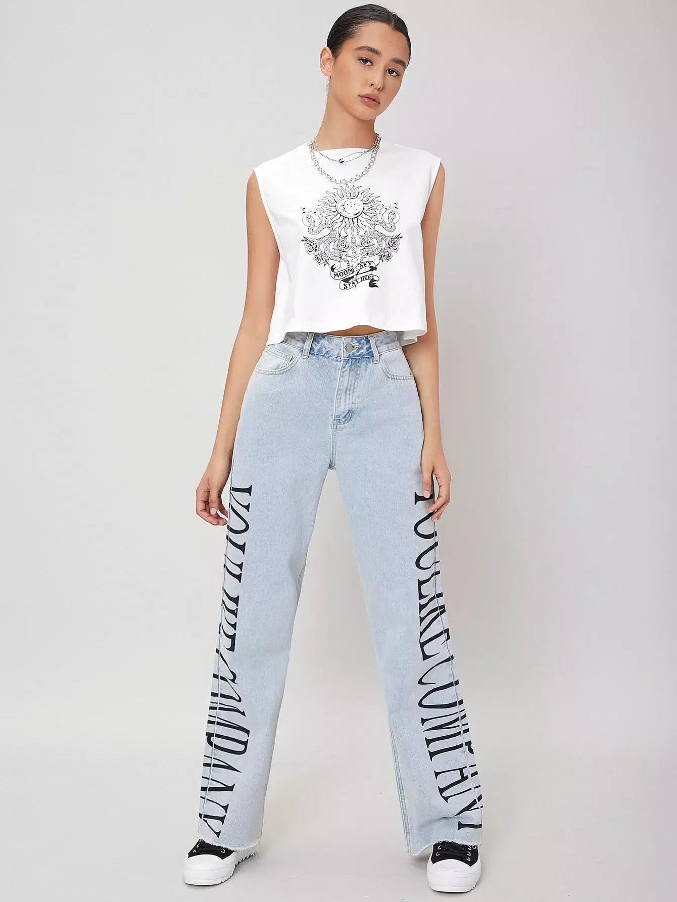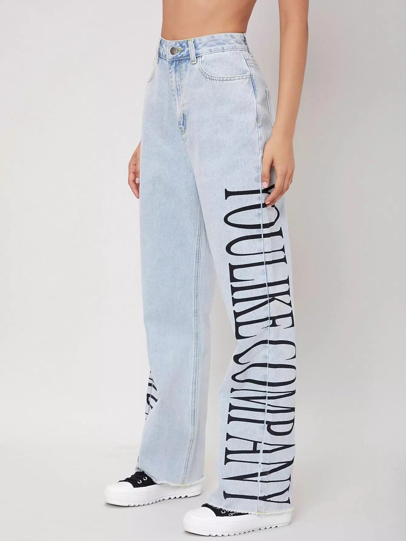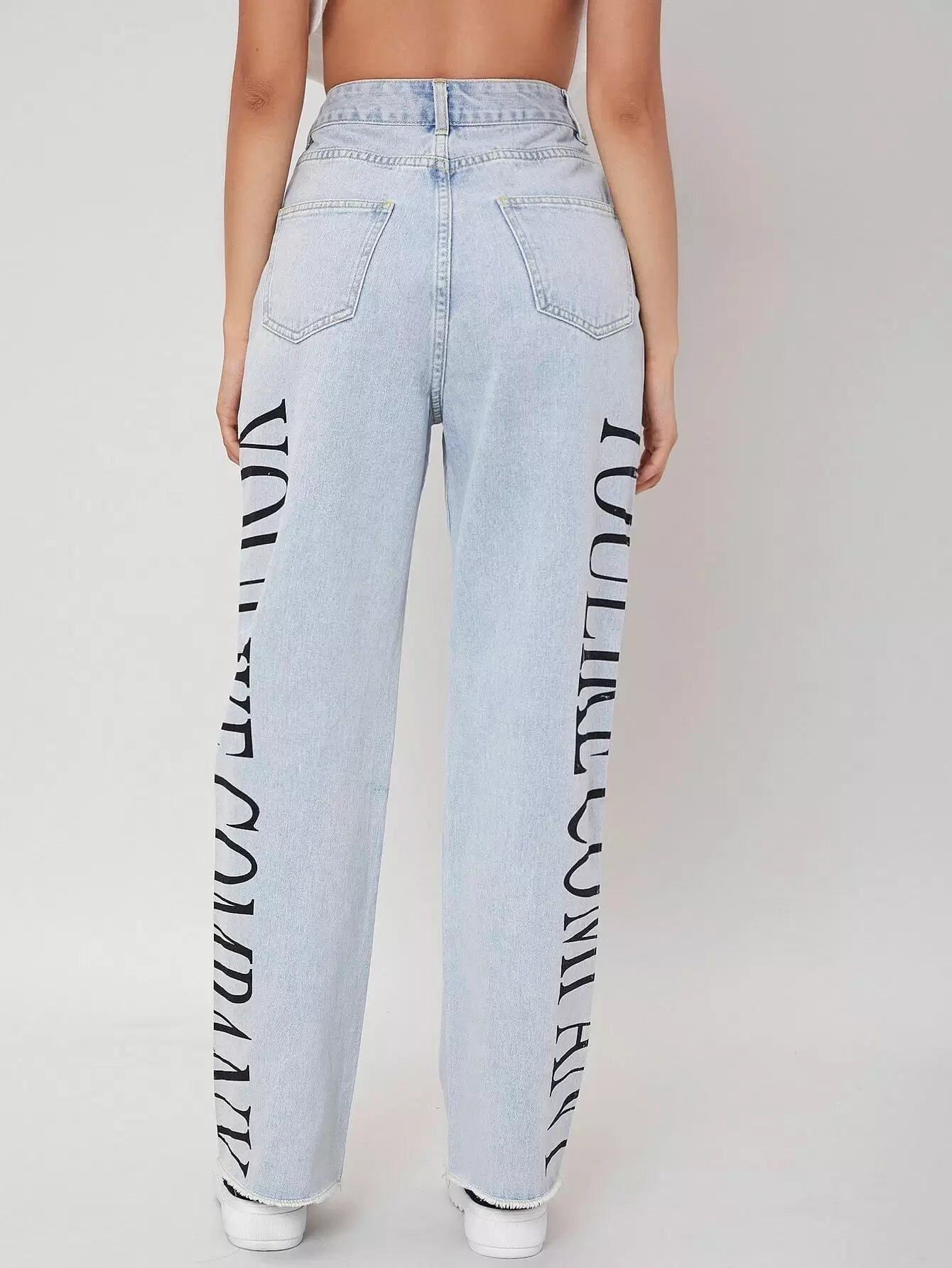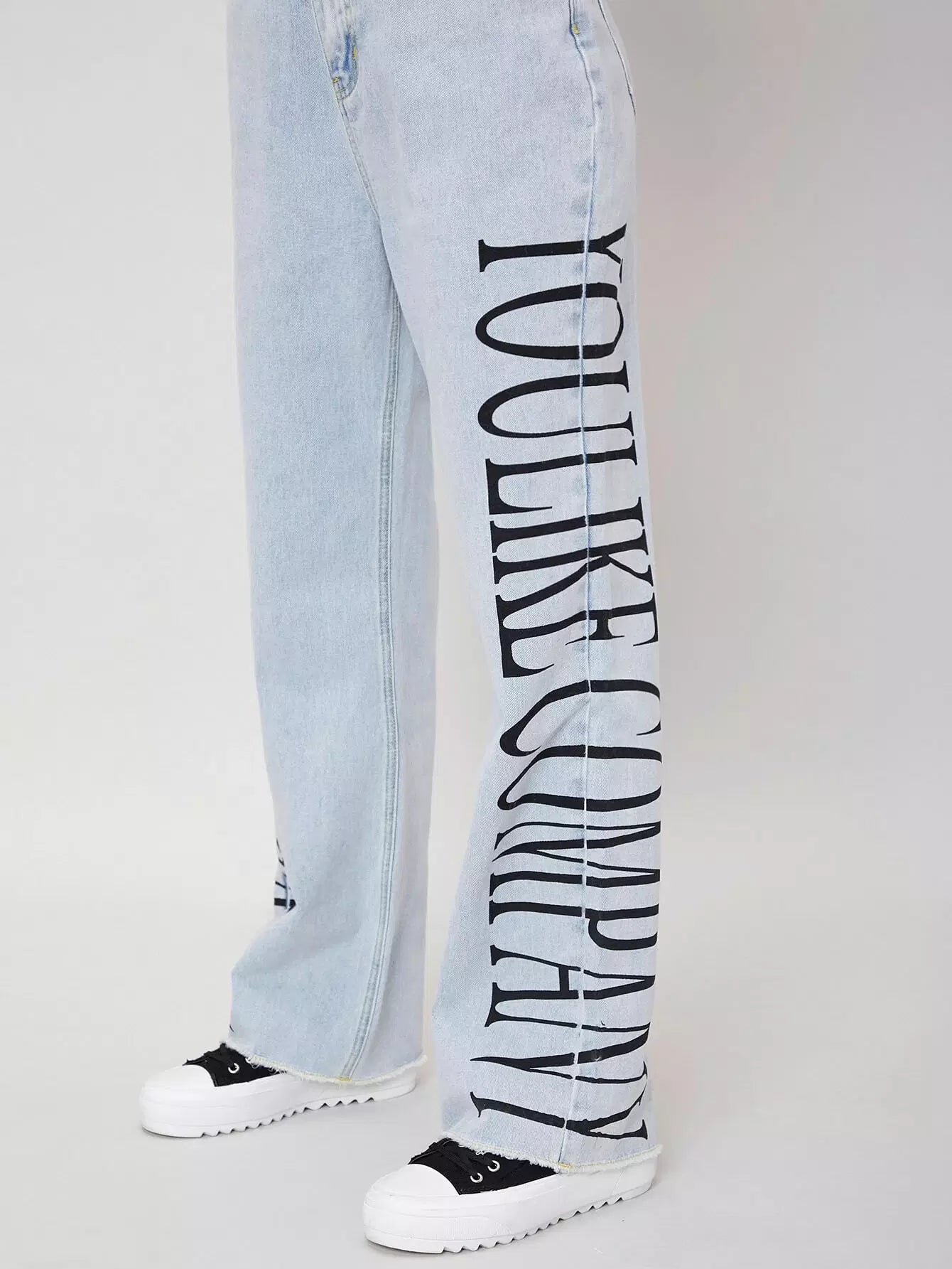 للنساء - بنطال جينز برسومات مغسولة خفيفًا وبحواف خام