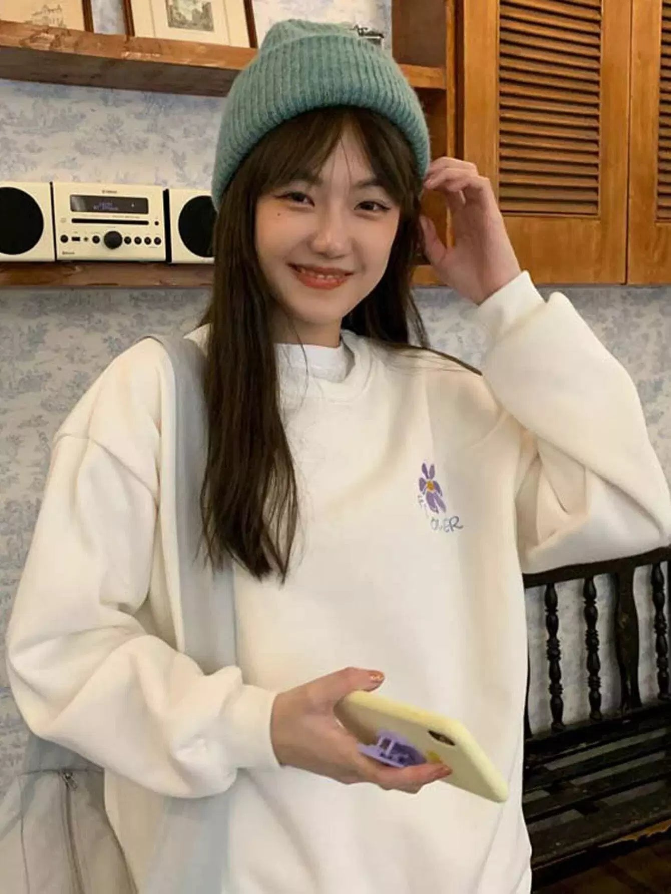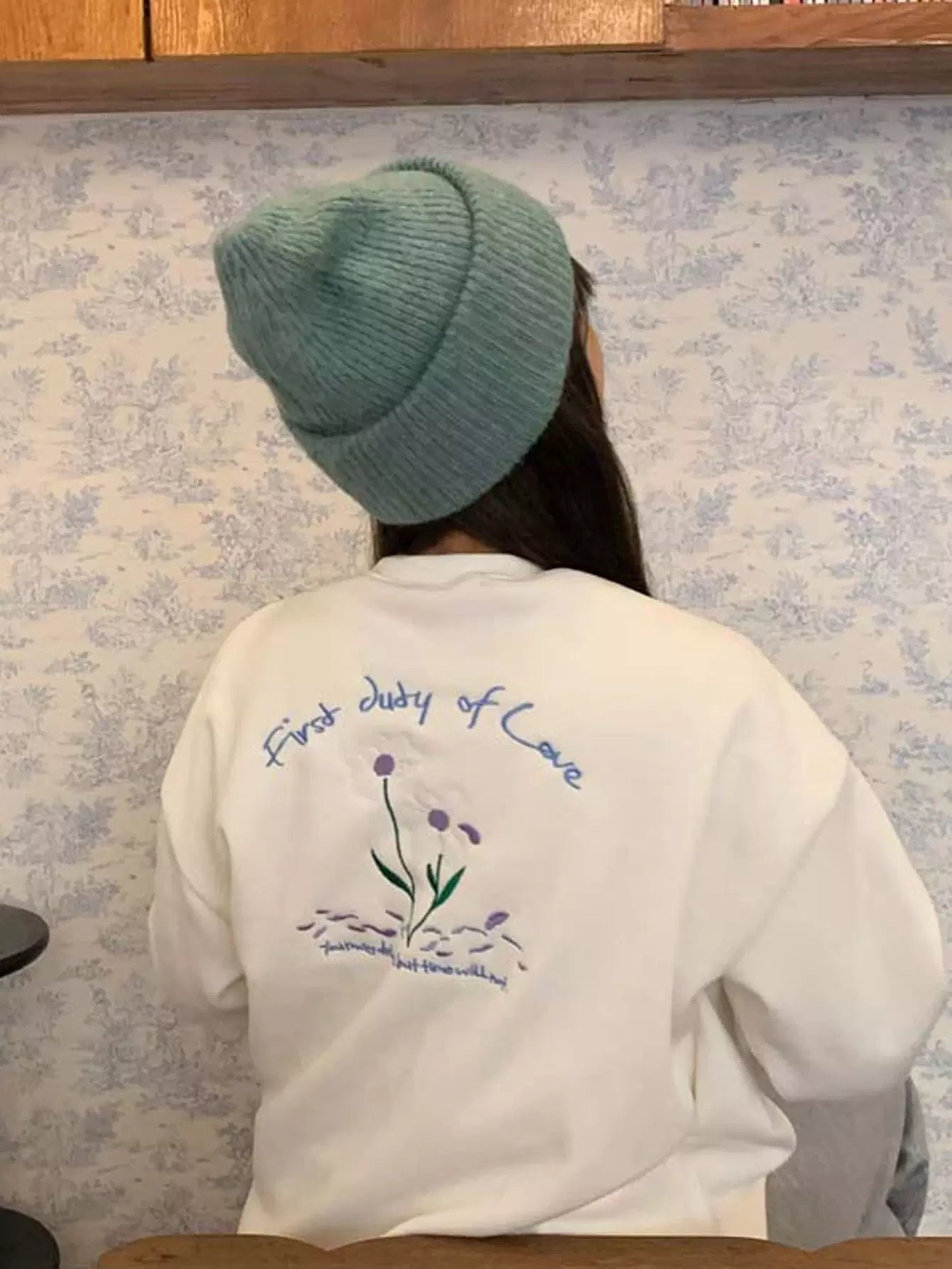 كنزة صوفية منسدلة الكتف مطرزة بتطريزات زهرية وشعار