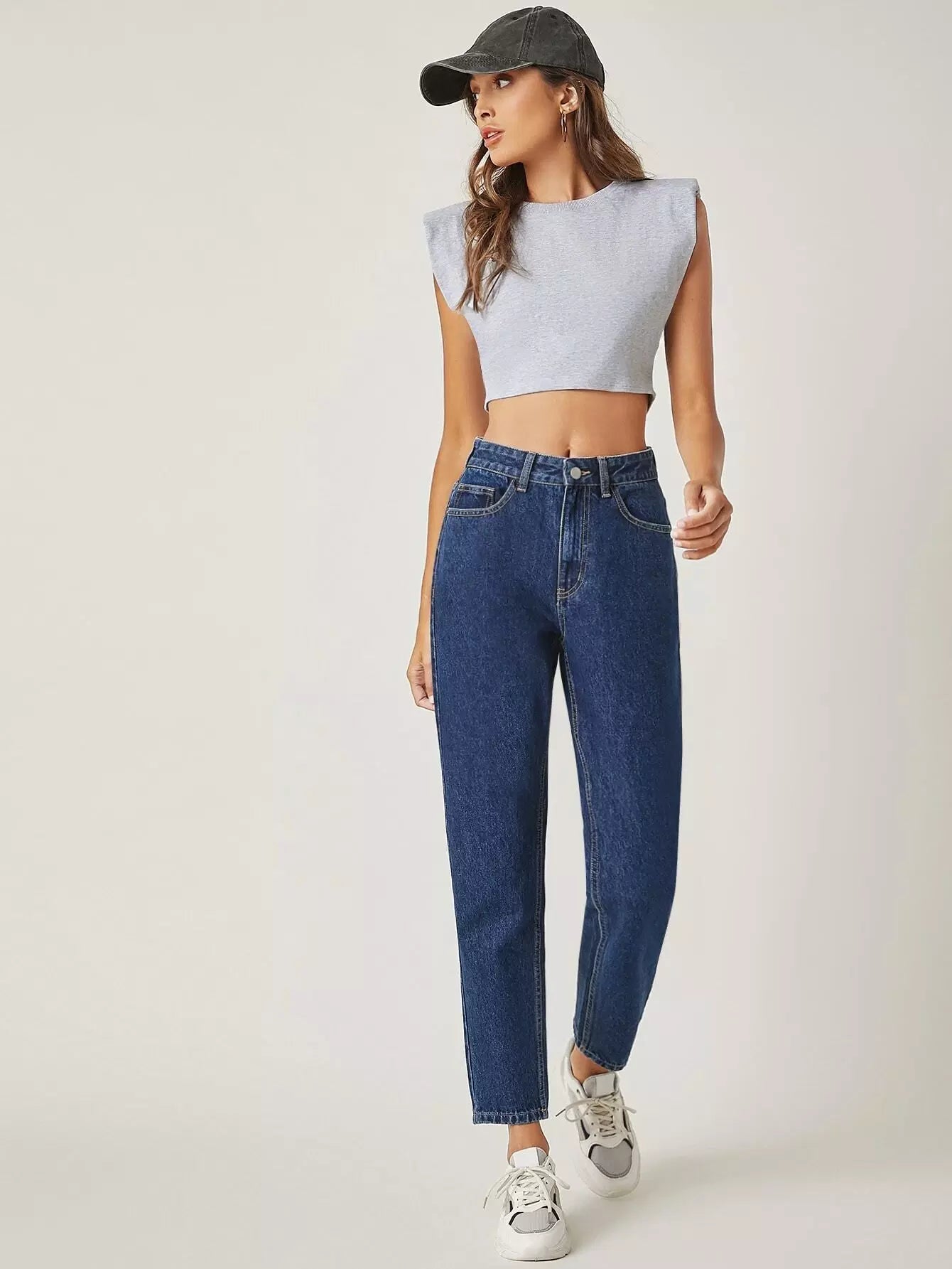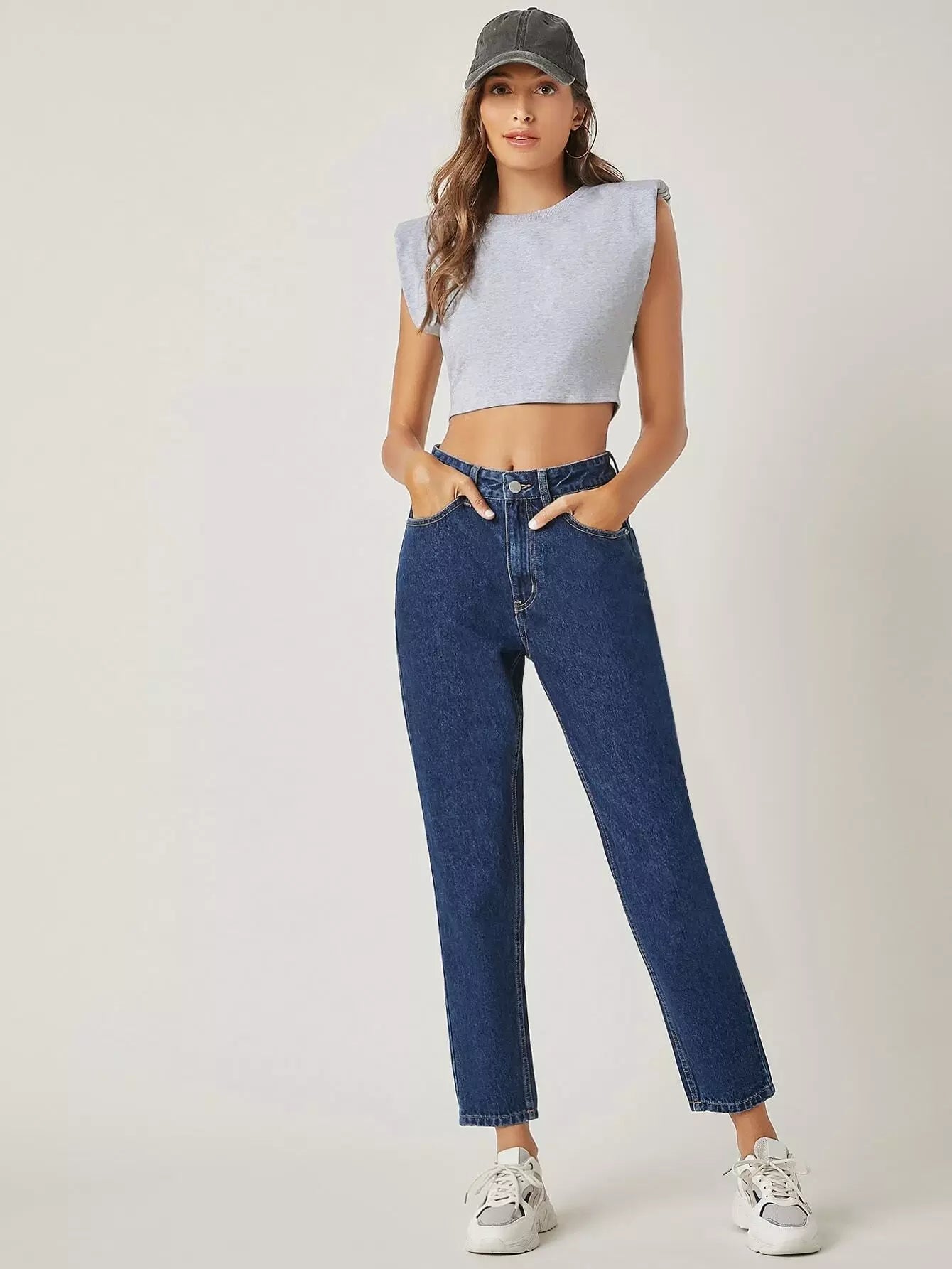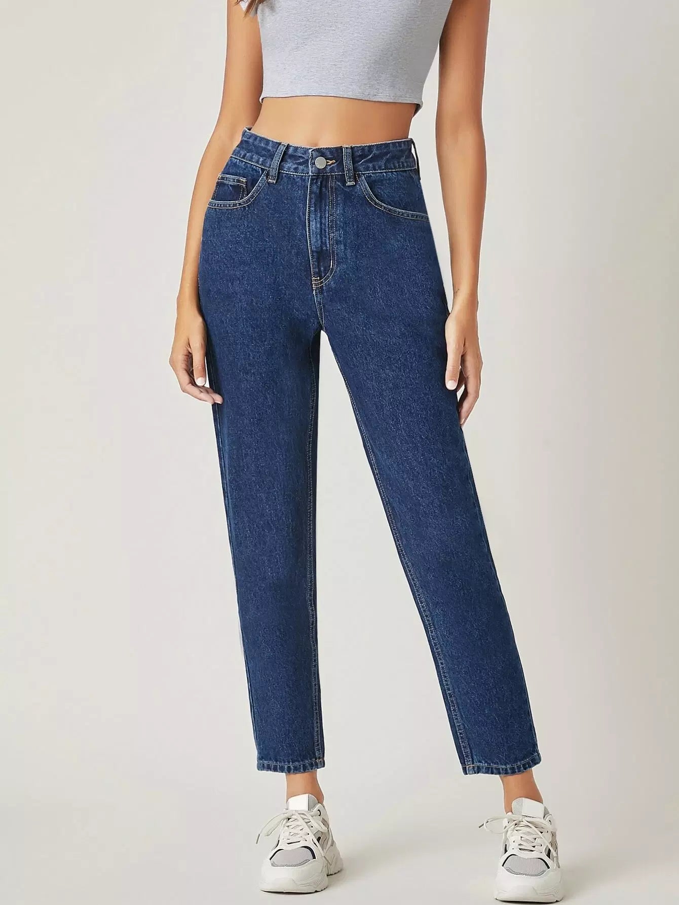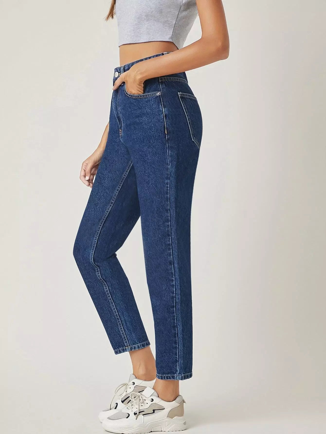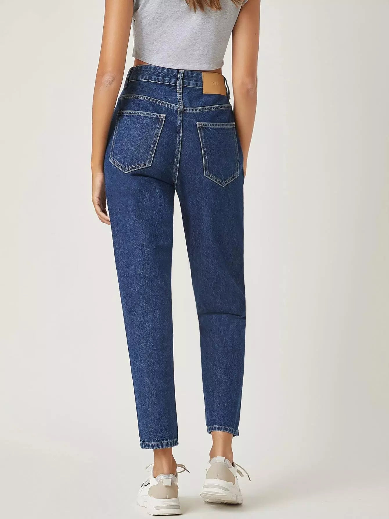بنطلون جينز جينز للأمهات متوسط الخصر مغسول بالحجر