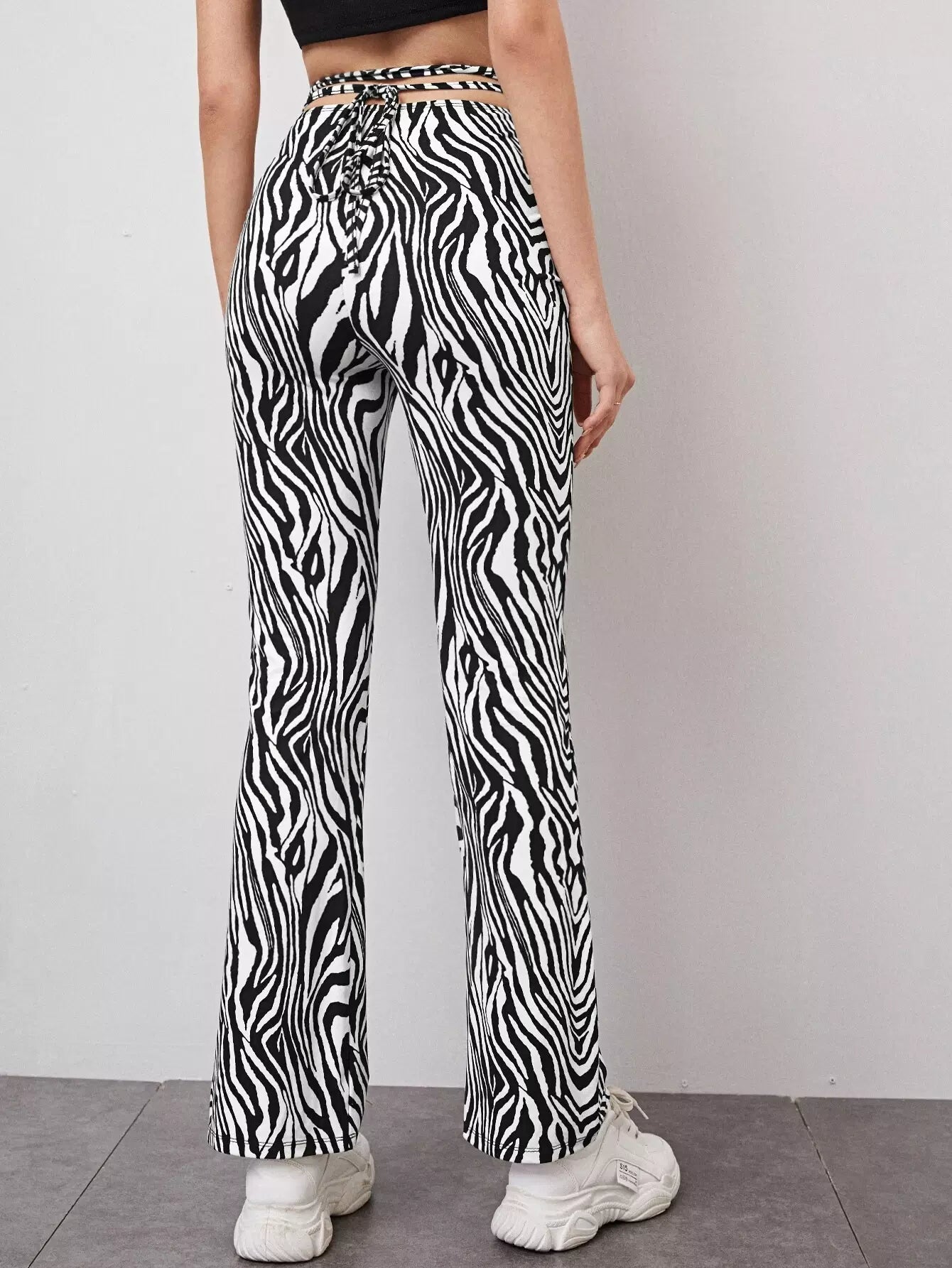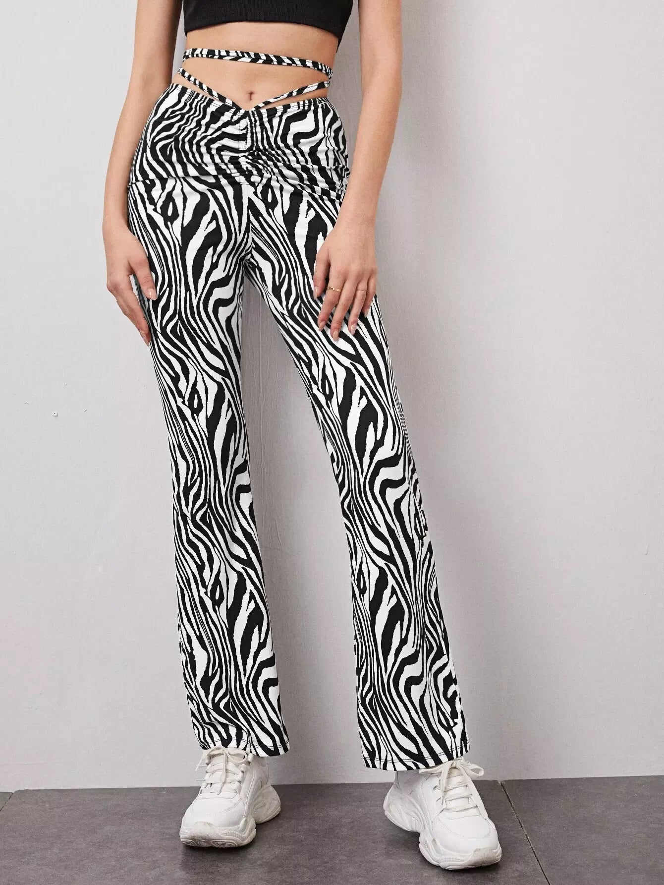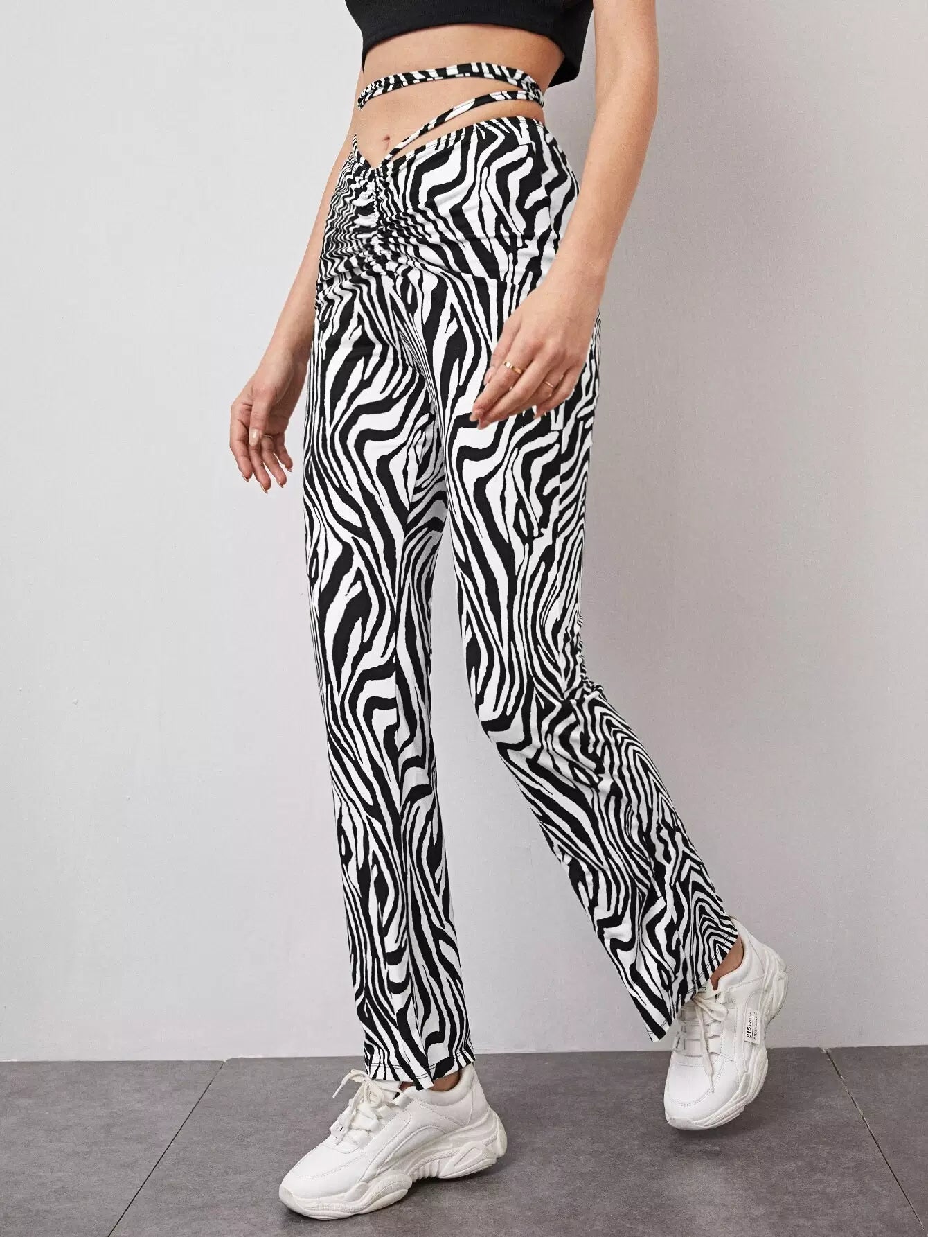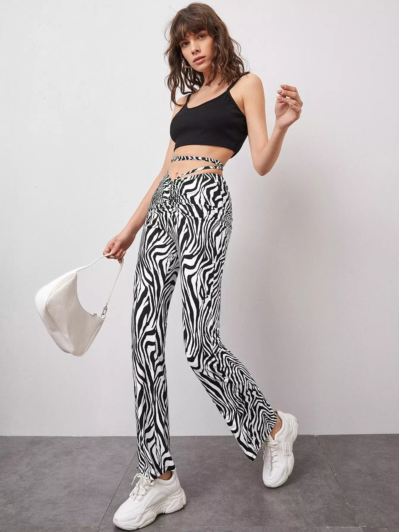 بنطلون مخطط بخط زيبرا ومزخرف بربطة عنق على الخصر وخصر واسع