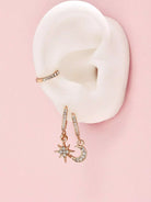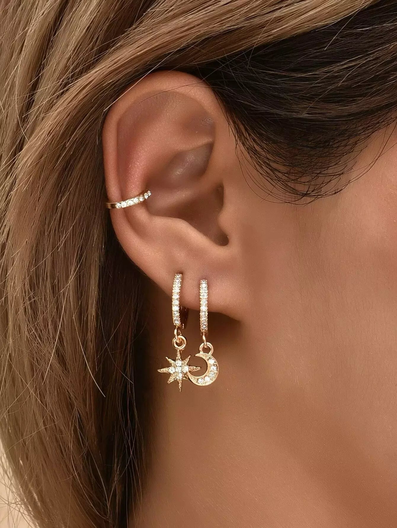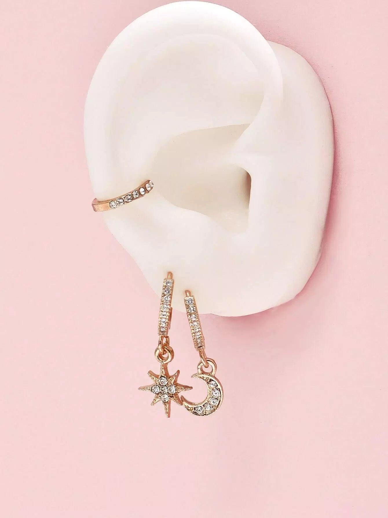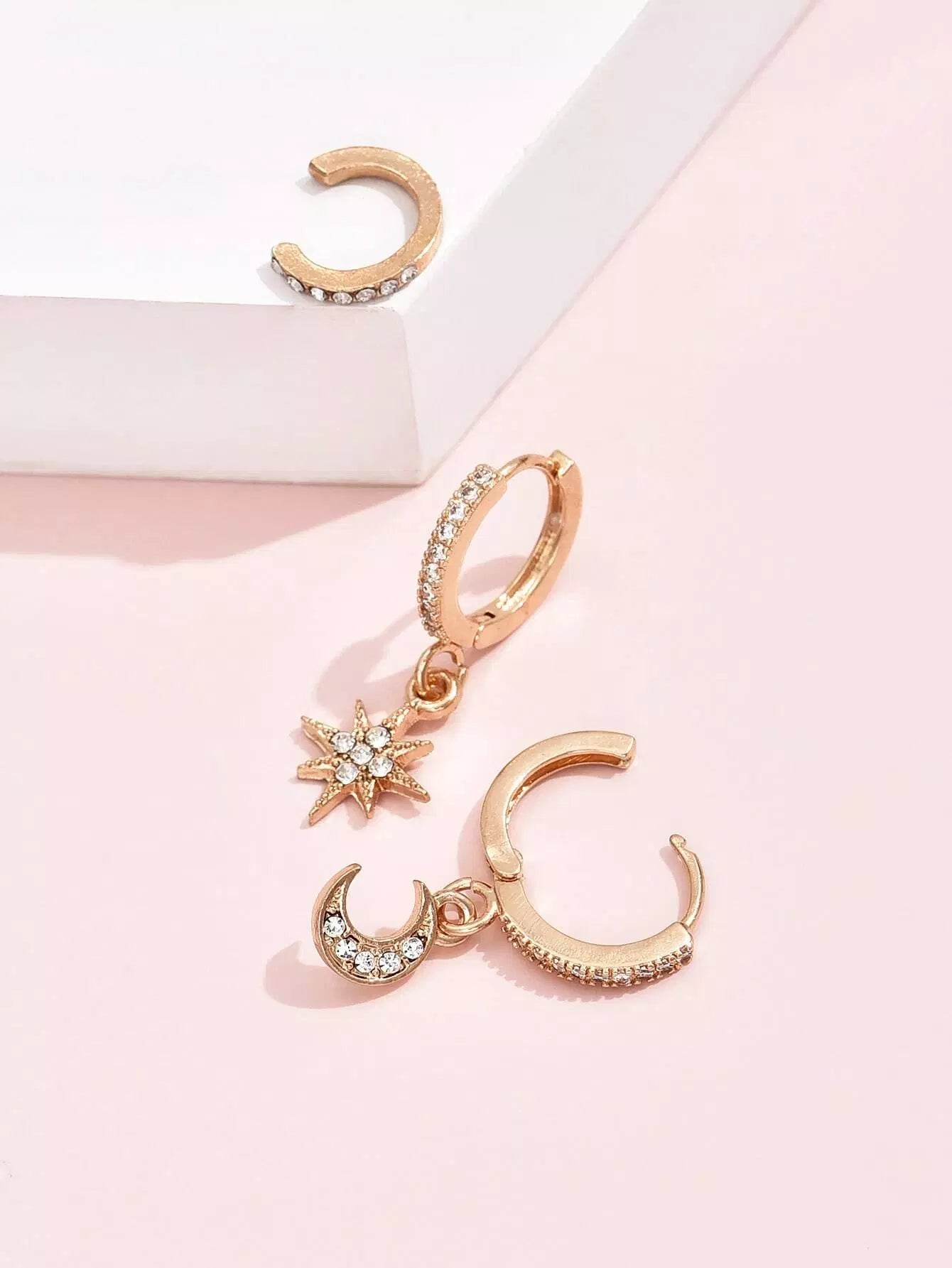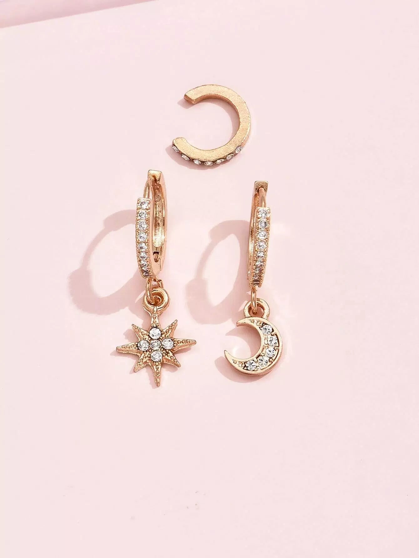 3 قطع من أقراط الأذن المزخرفة بأحجار الراين على شكل قمر