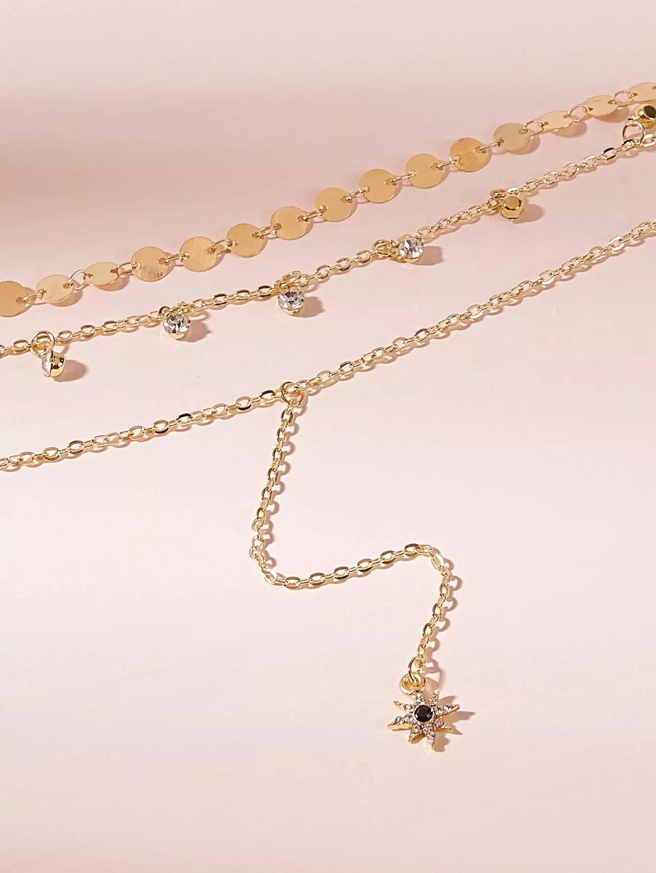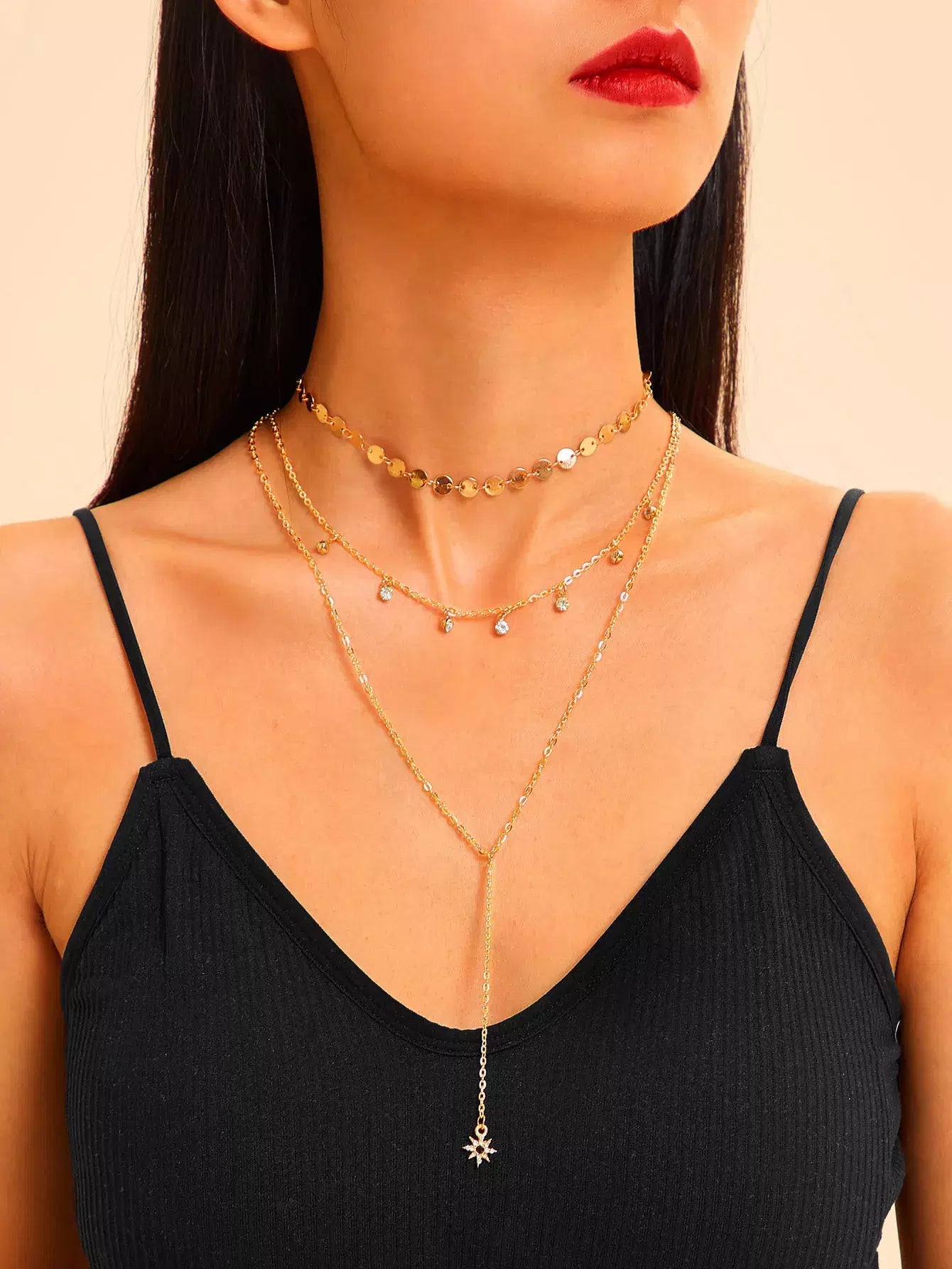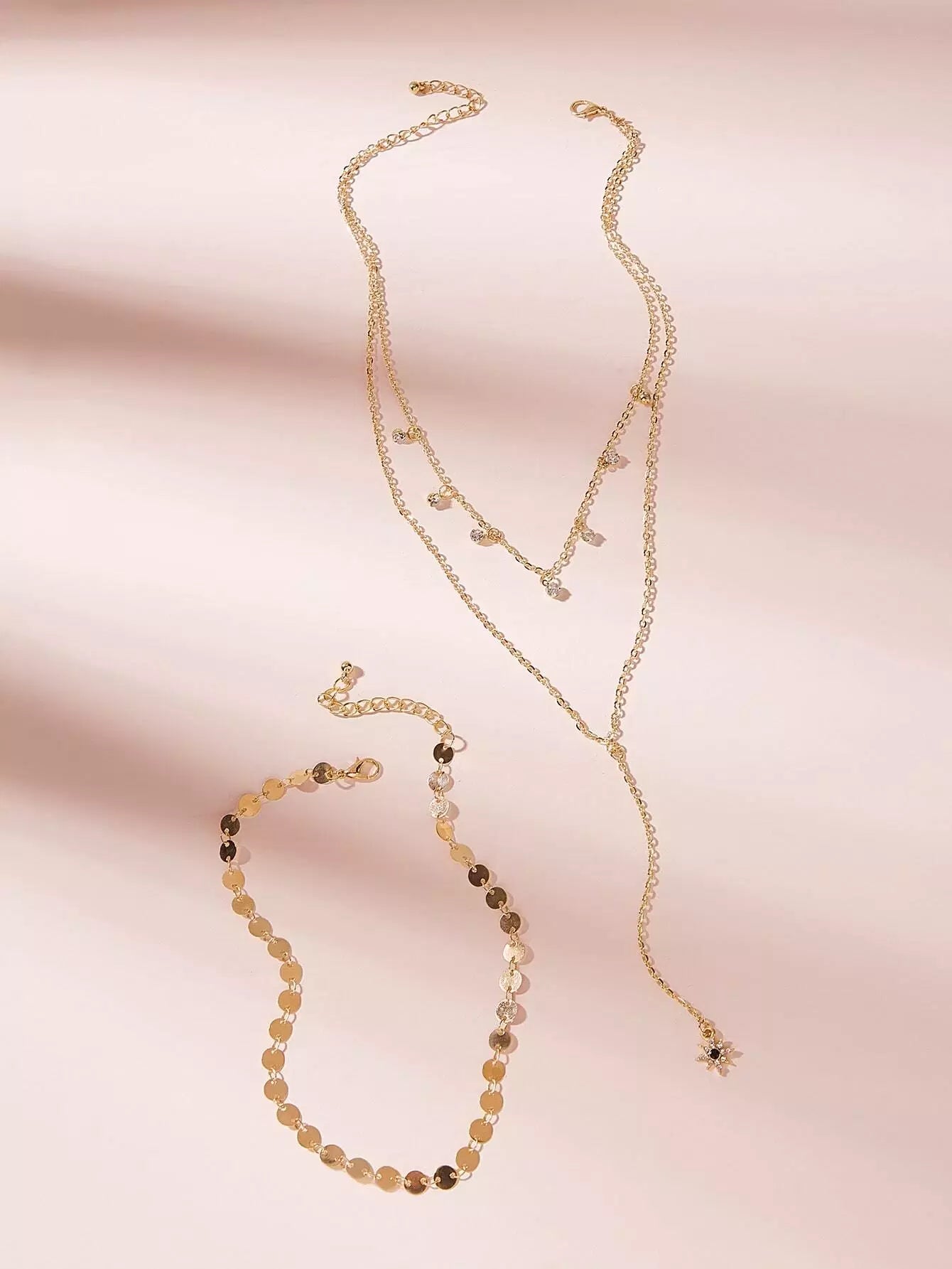للنساء - قلادة سلسلة الوهق ذات طبقات مزخرفة بحجر الراين والقرص قطعتين
