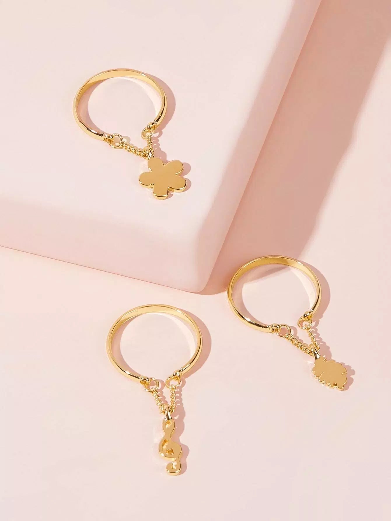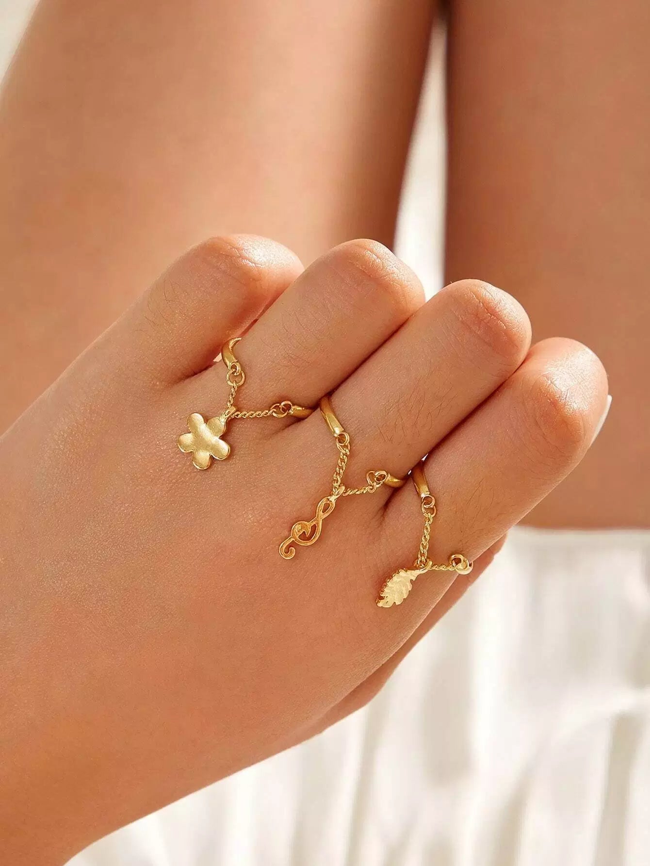 للنساء - خاتم حلية على شكل زهرة وأوراق شجر 3 قطع