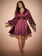 Allurite Plus Size Plain V-Neck Long Sleeve Casual Short Shift Dress, Everyday Wear, For Christmas Burgundy
