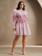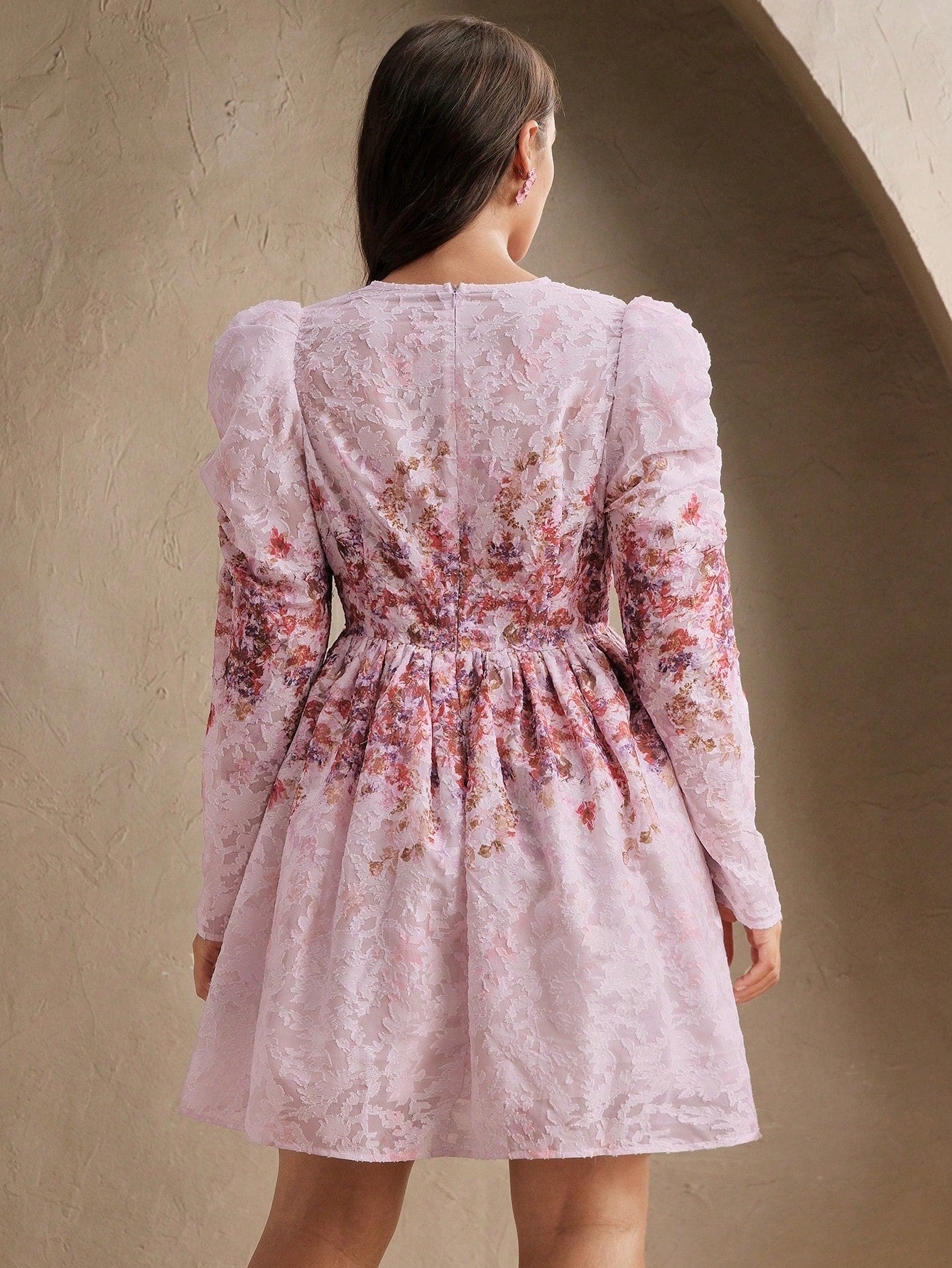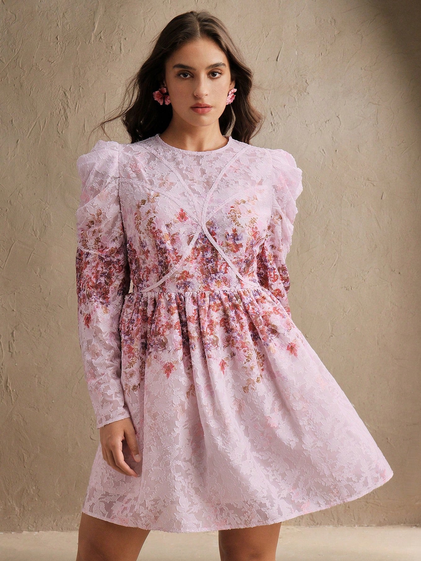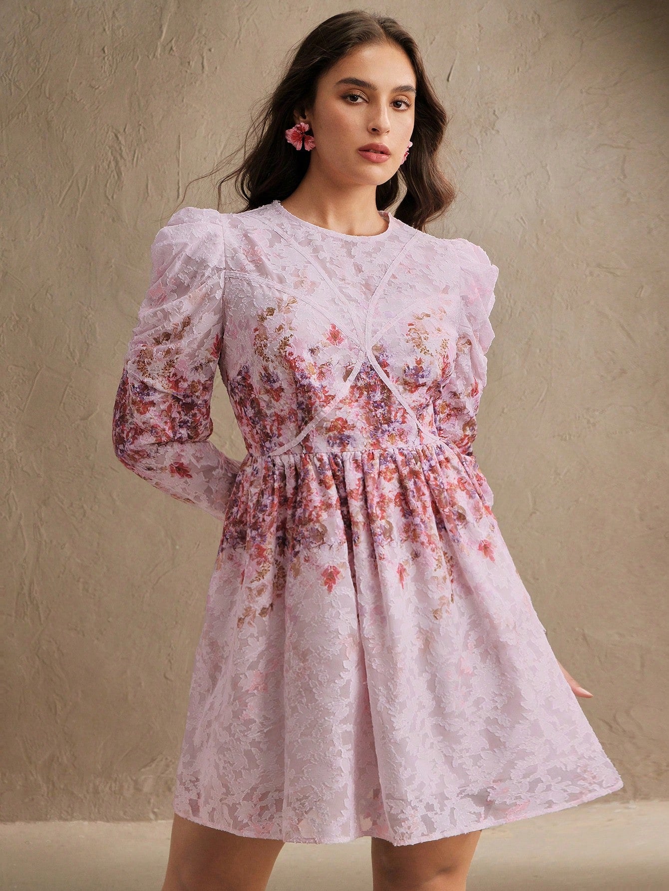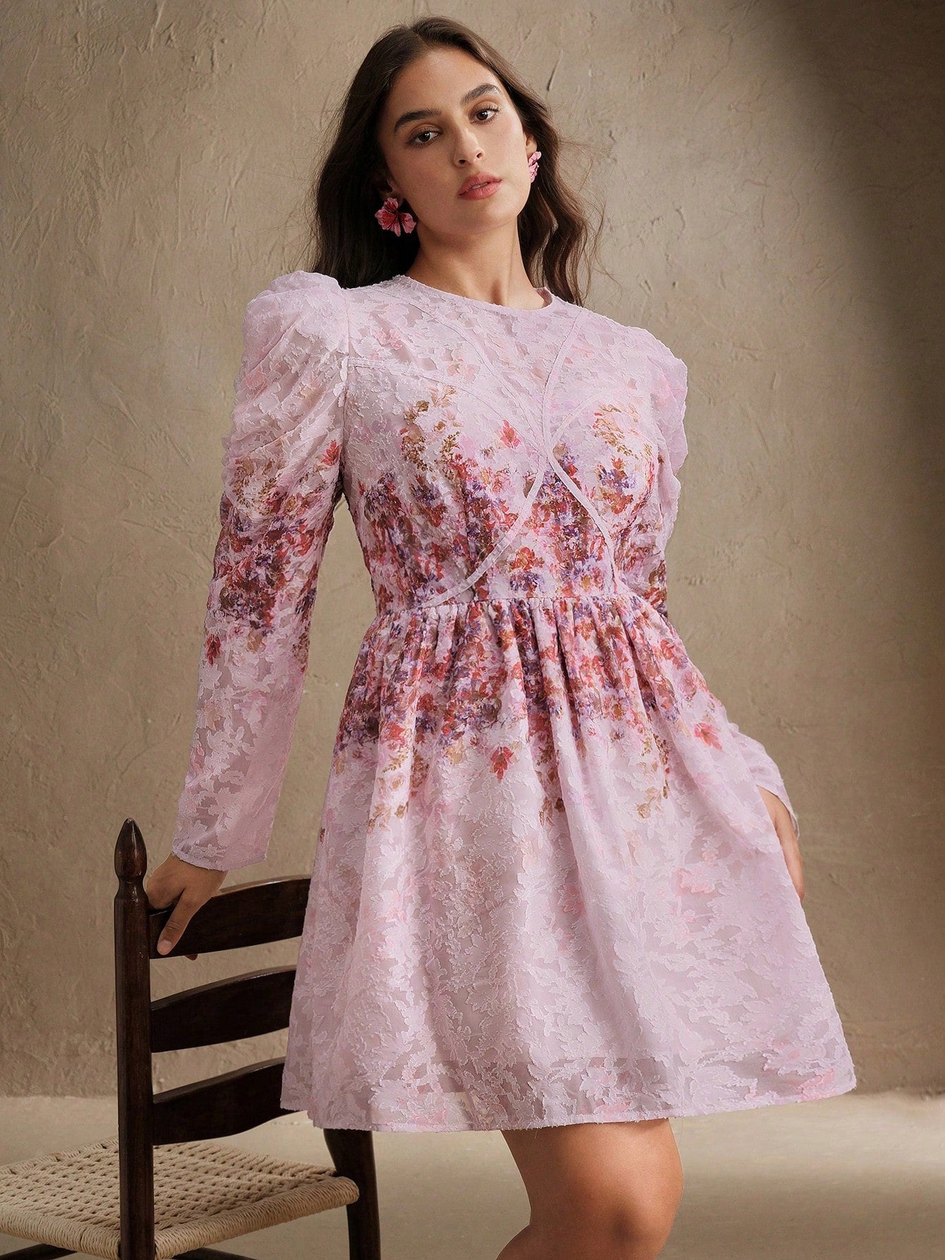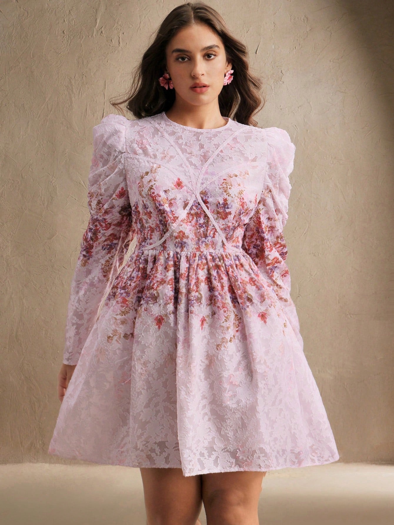 Anewsta Elegant, Chic Waist-Cinched Puff Sleeve Floral Print A-Line Dress, Suitable For Spring/Summer,