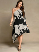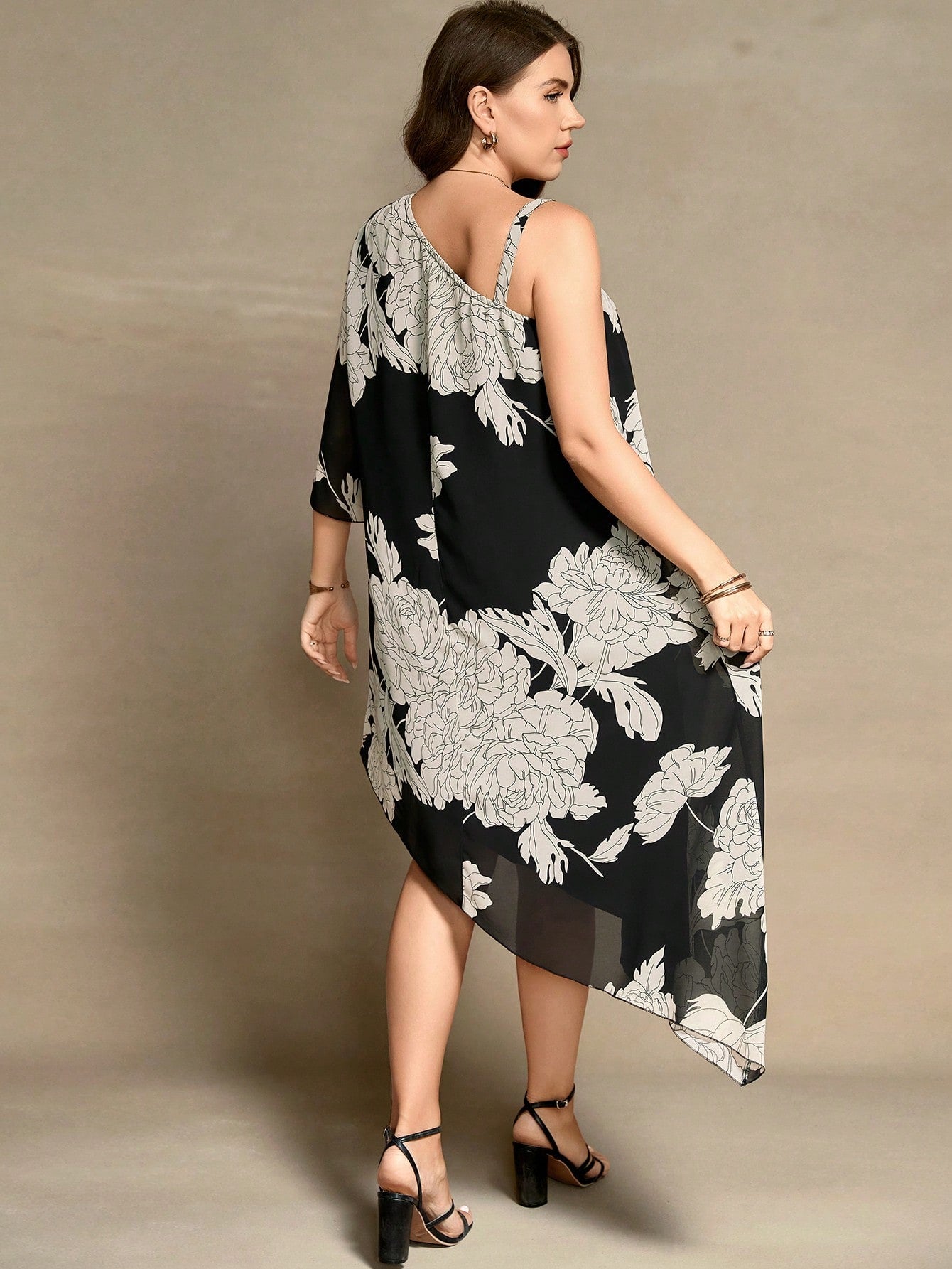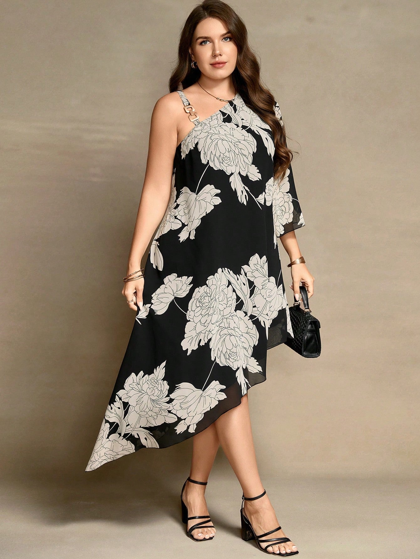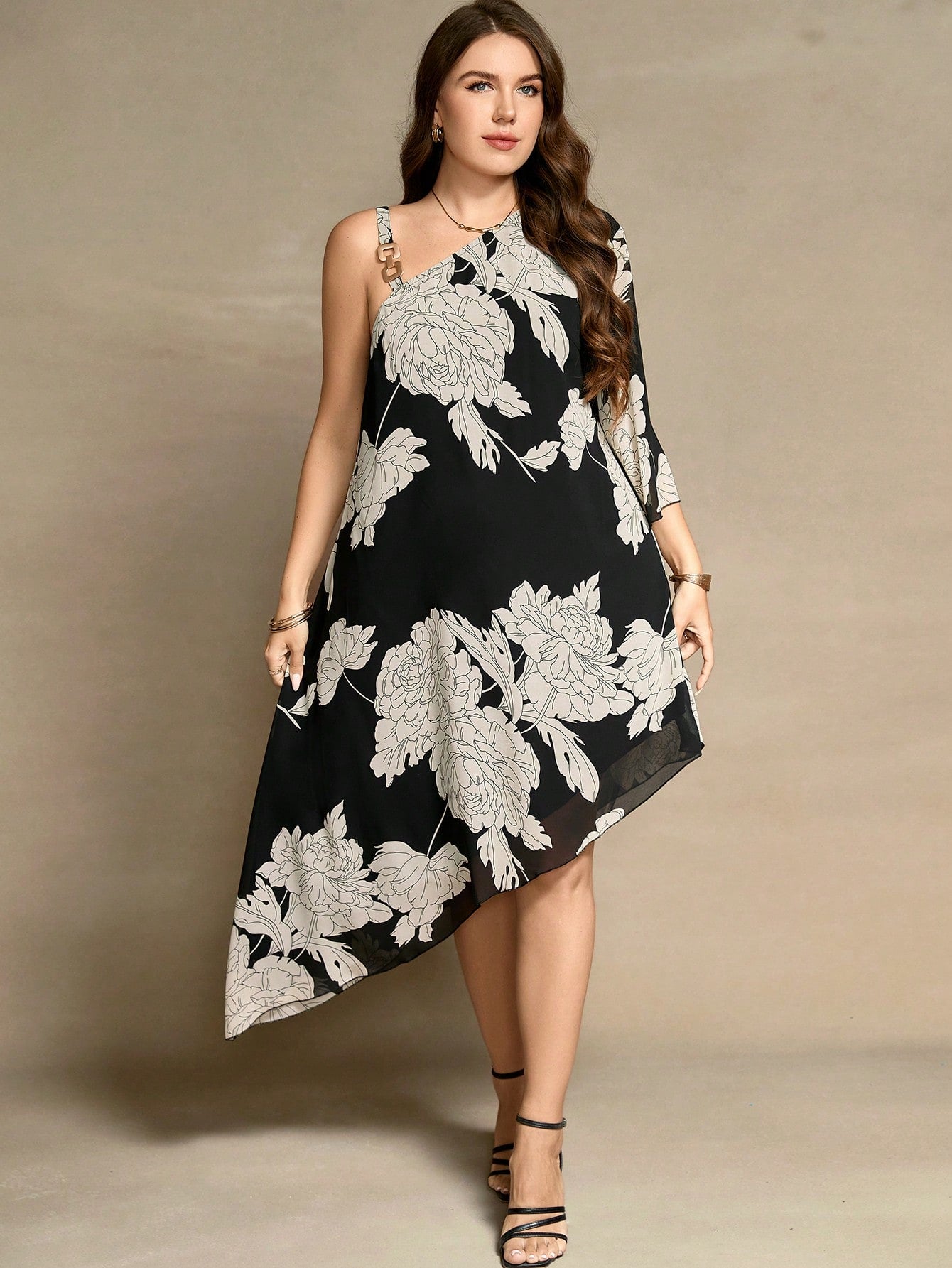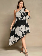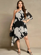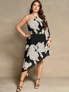 EMERY ROSE Black & White Contrast Print Chiffon Asymmetric Shouldered Plus Size Dress, Elegant Spring/Summer