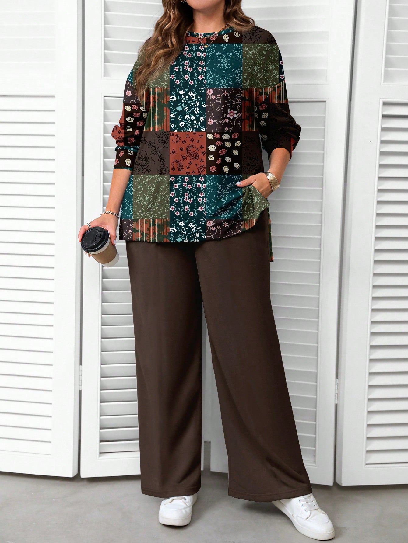 EMERY ROSE Plus Size Casual Minimalist Allover Print Sweatshirt Set