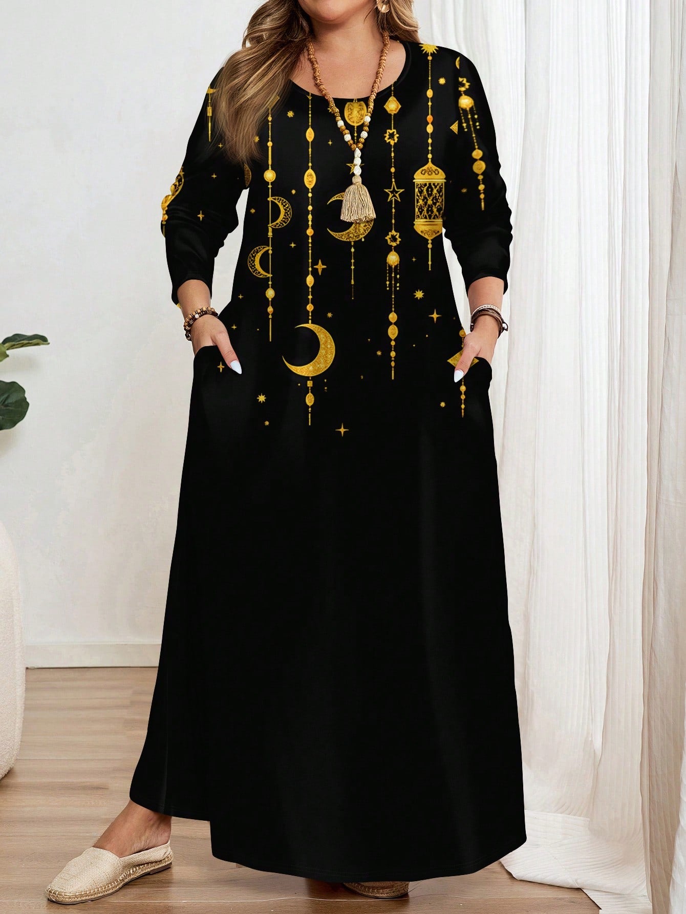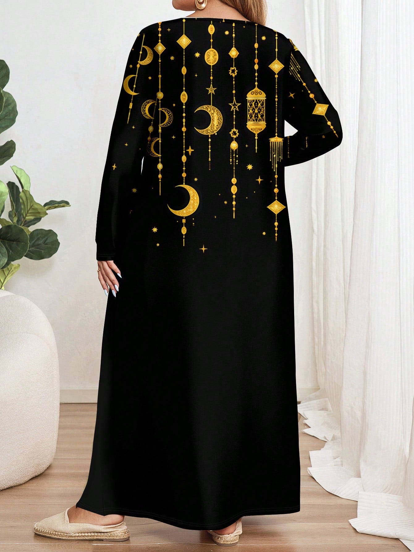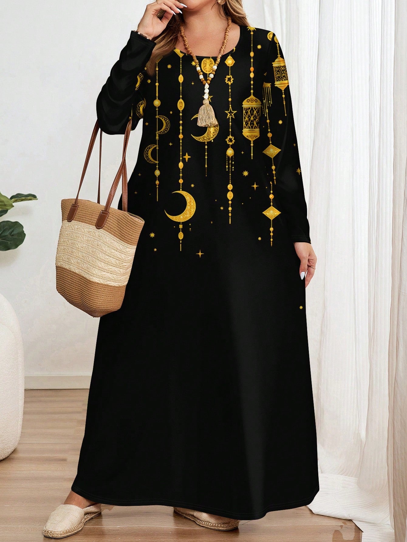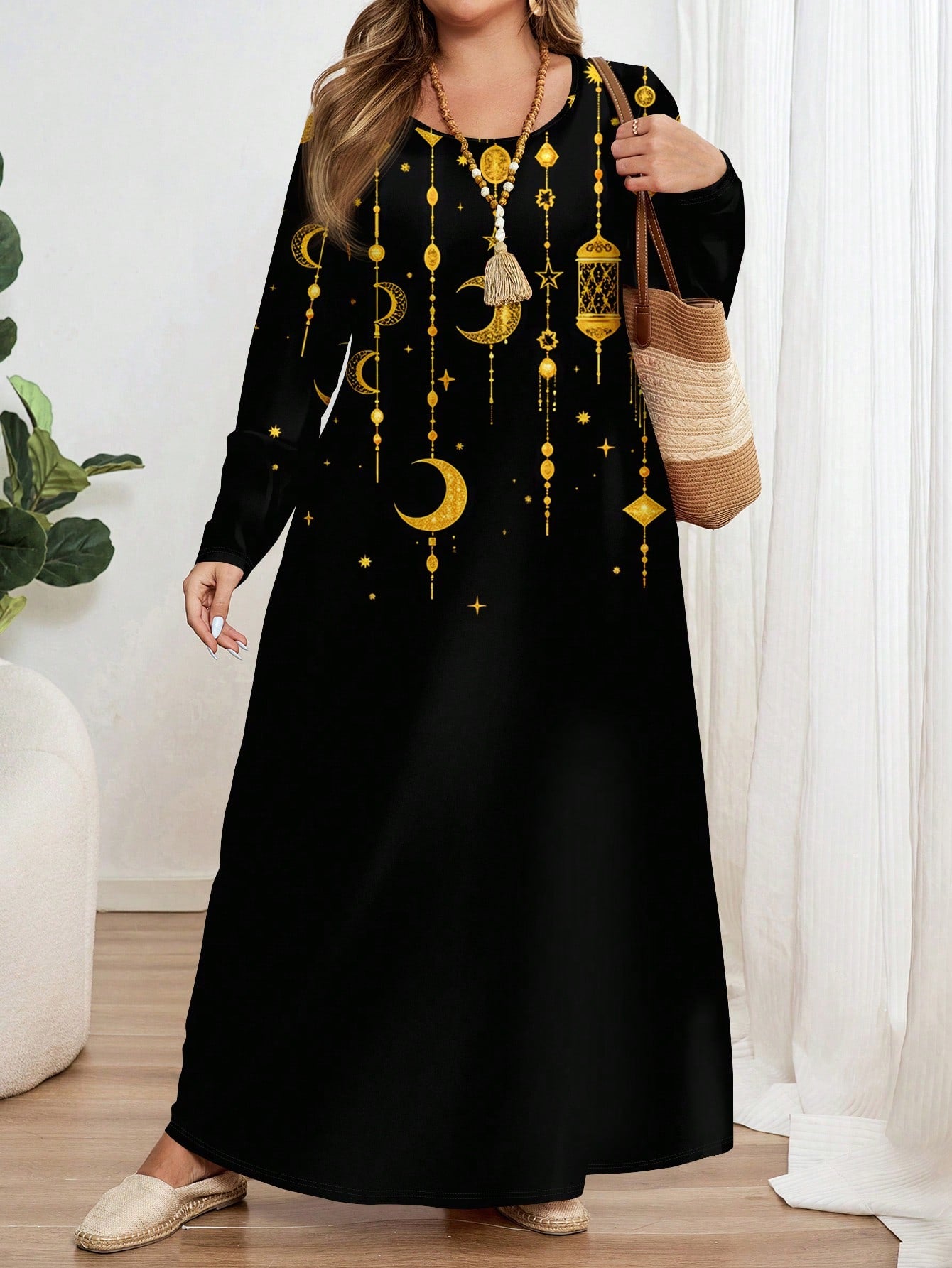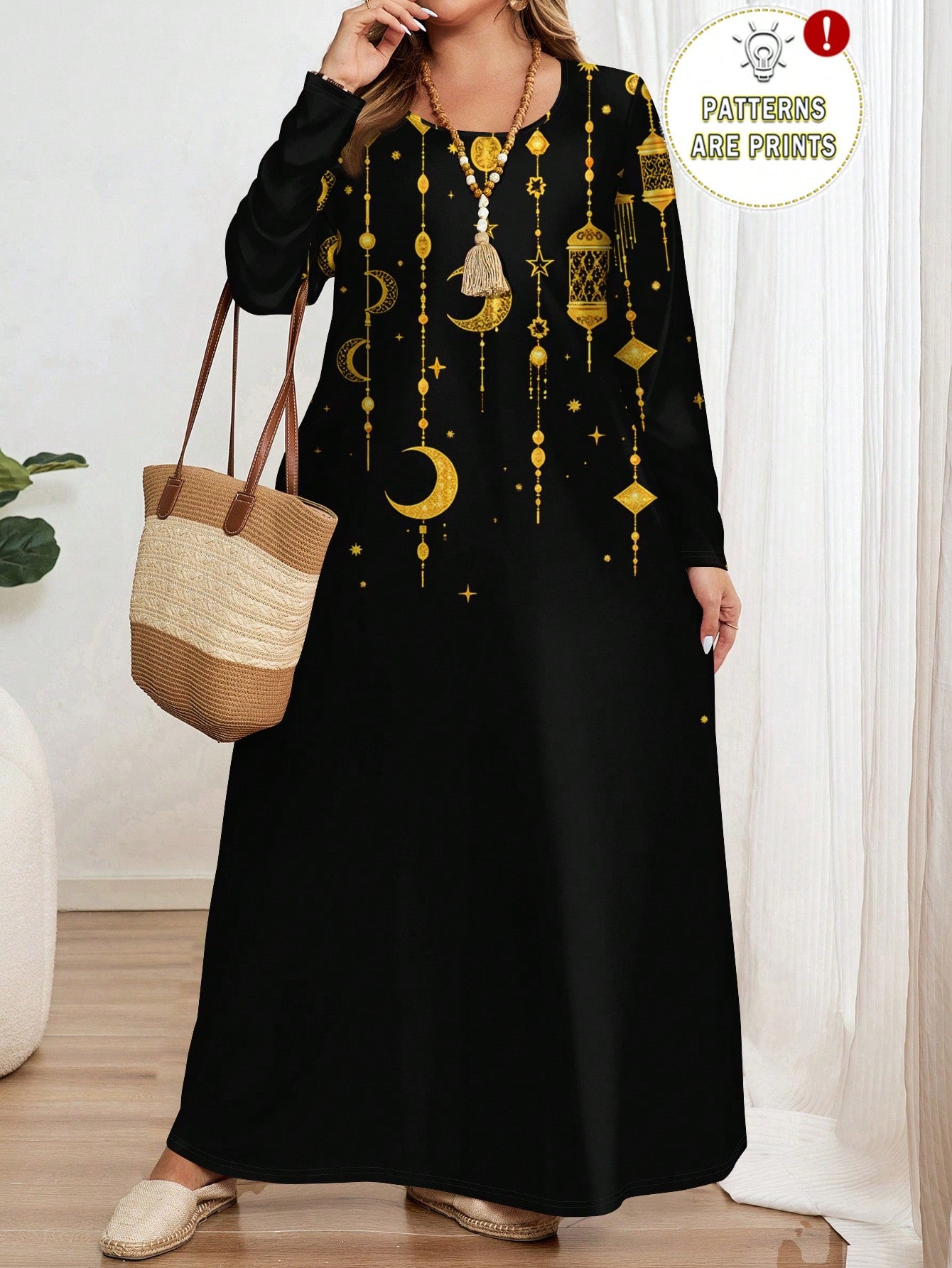 EMERY ROSE Plus Size Ramadan Moon Lamp Graphic Print Round Neck Long Sleeve Dress, Suitable For Spring