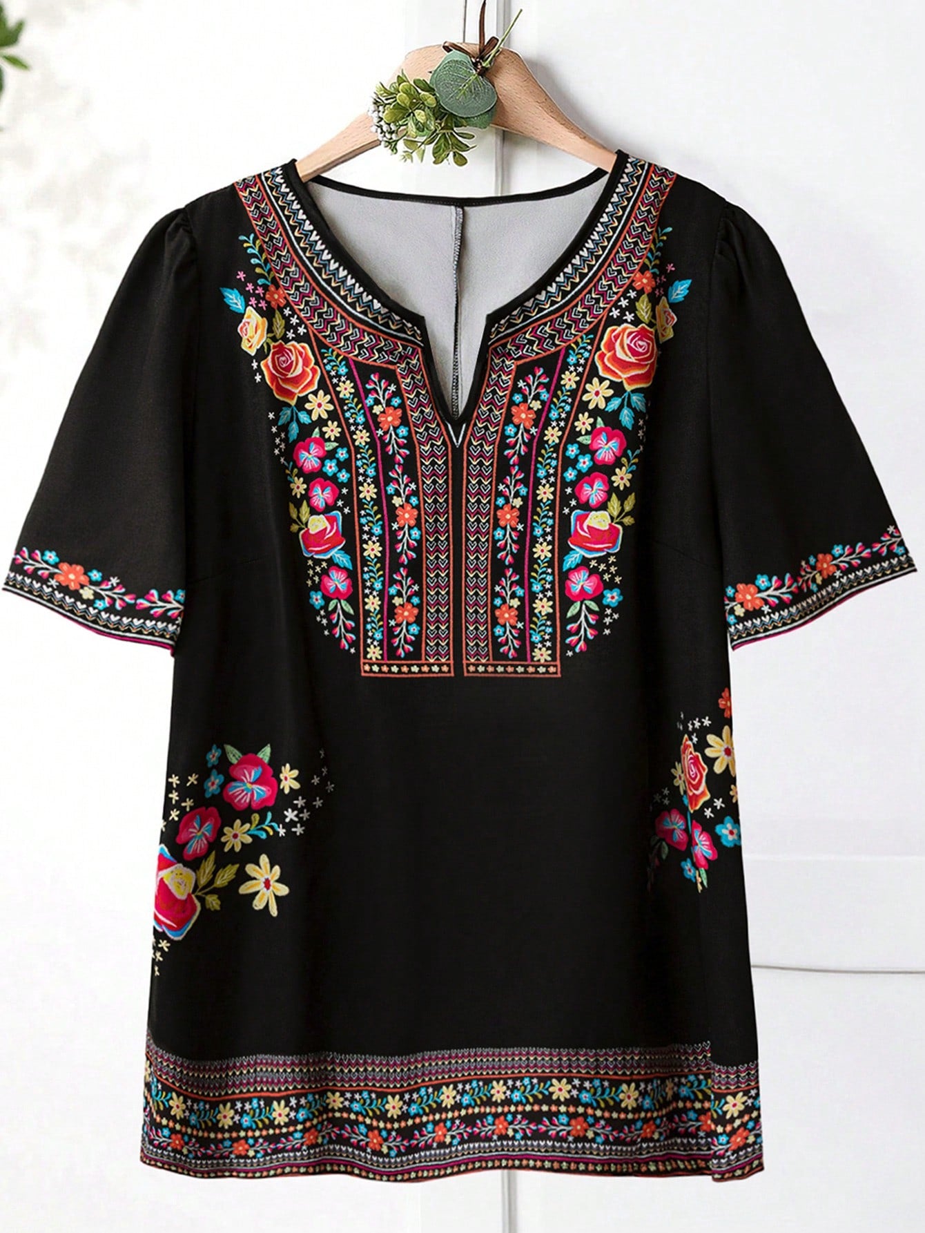 EMERY ROSE Women's Shoulder Gathered Short Sleeves Country Retro Vacation Bohemian Positioning Print