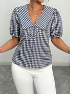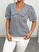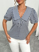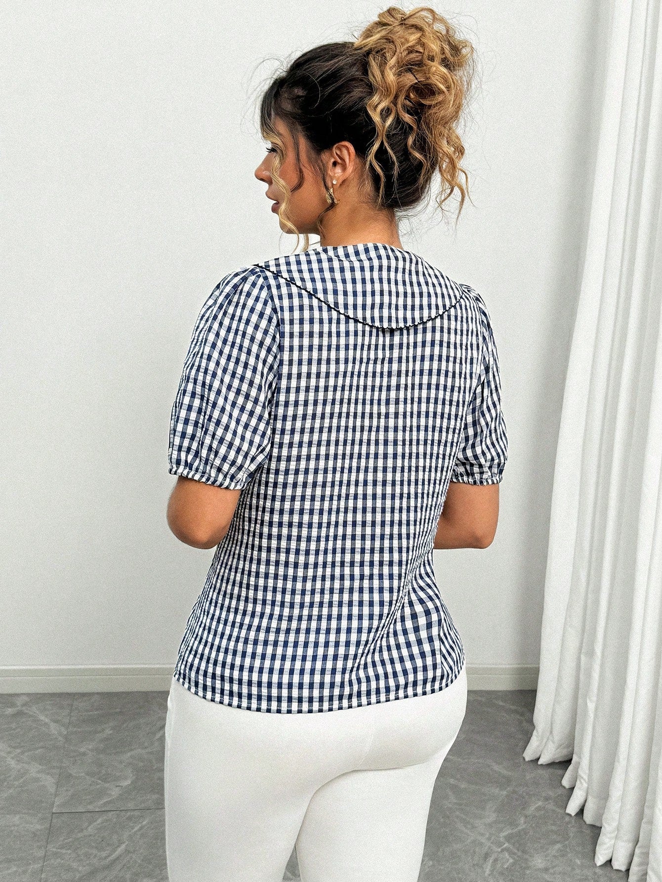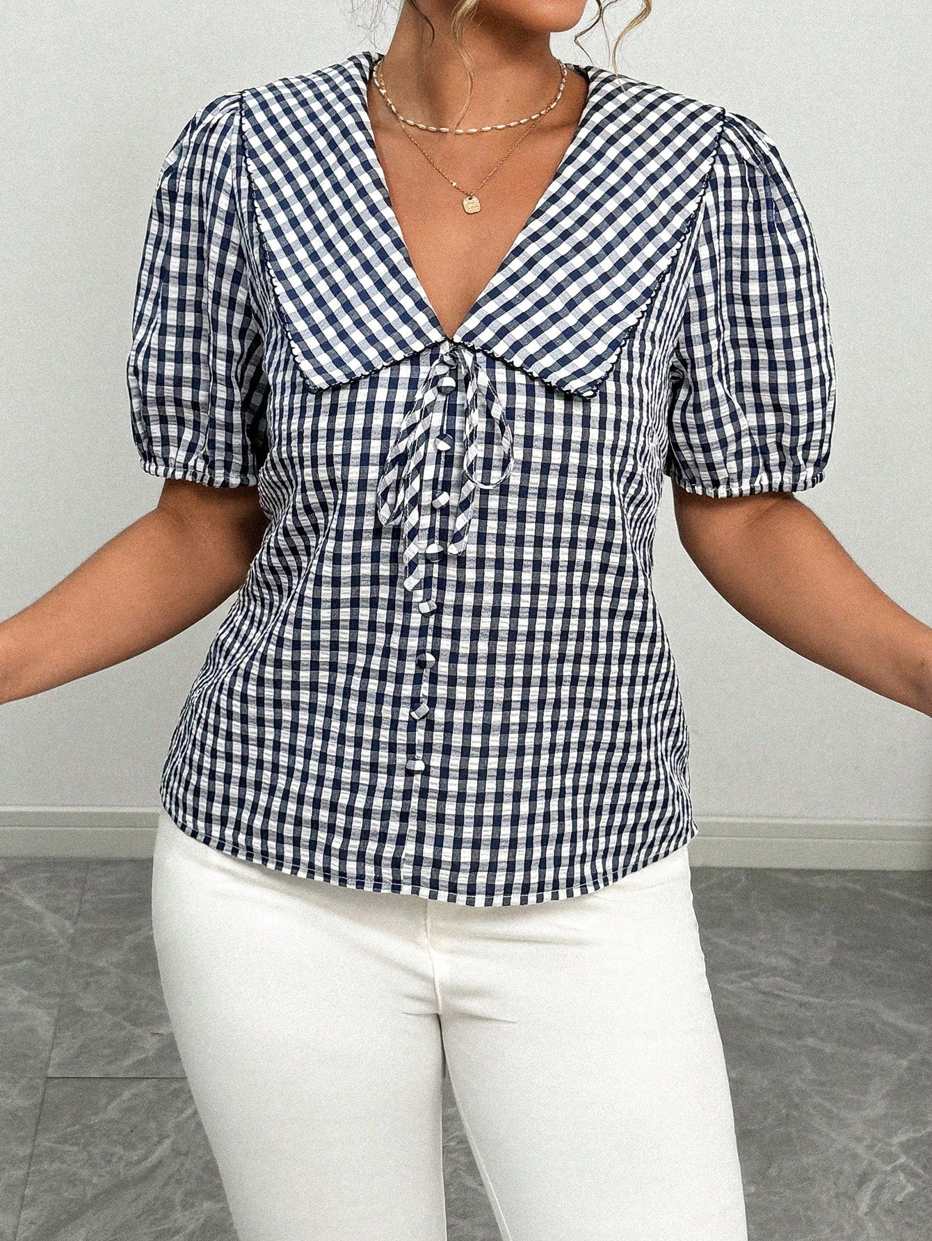 Flirla Plus Size Plaid Collar Puff Sleeve Single-Breasted Lace-Up Blouse, Summer