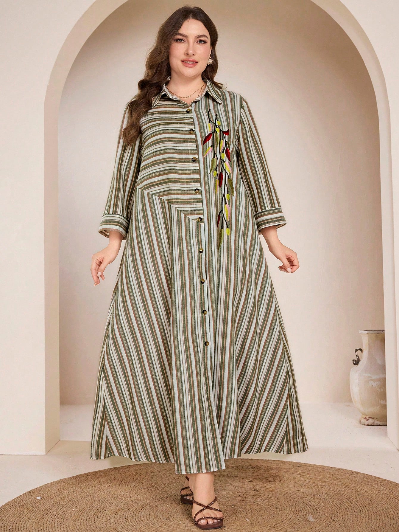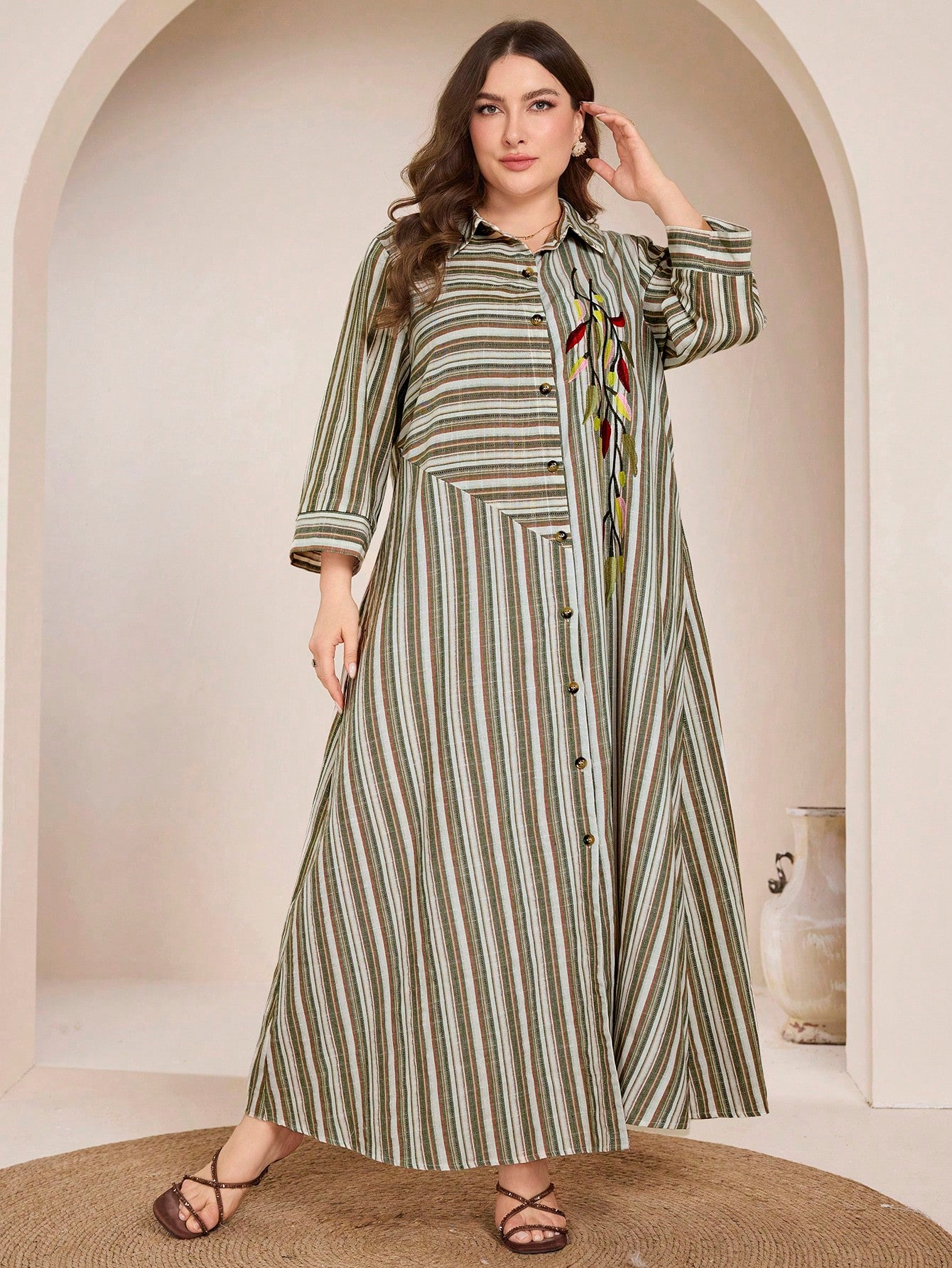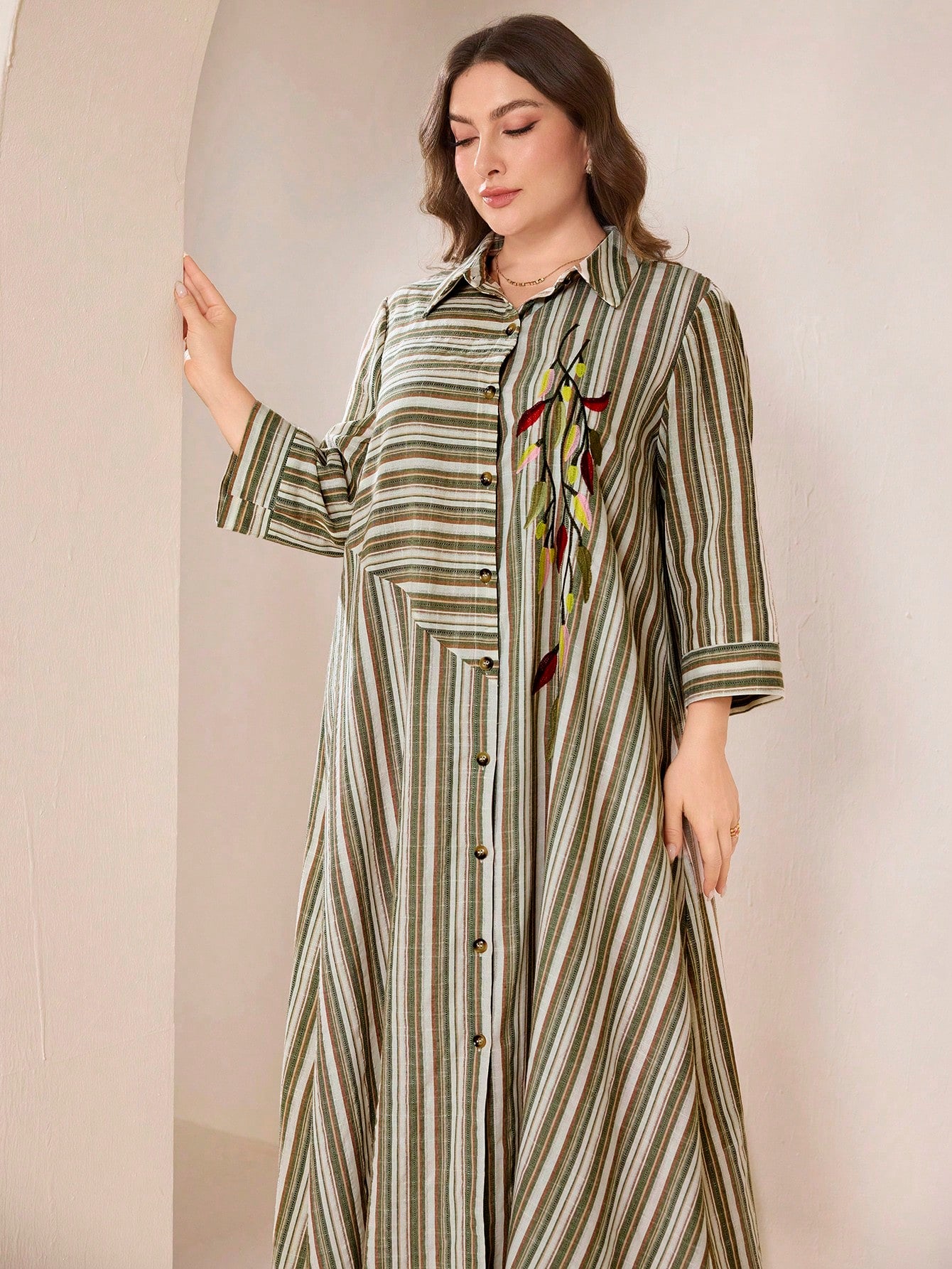 Graceveil Plus Size Women Embroidered Striped Collared Shirt Dress, Arabic Style