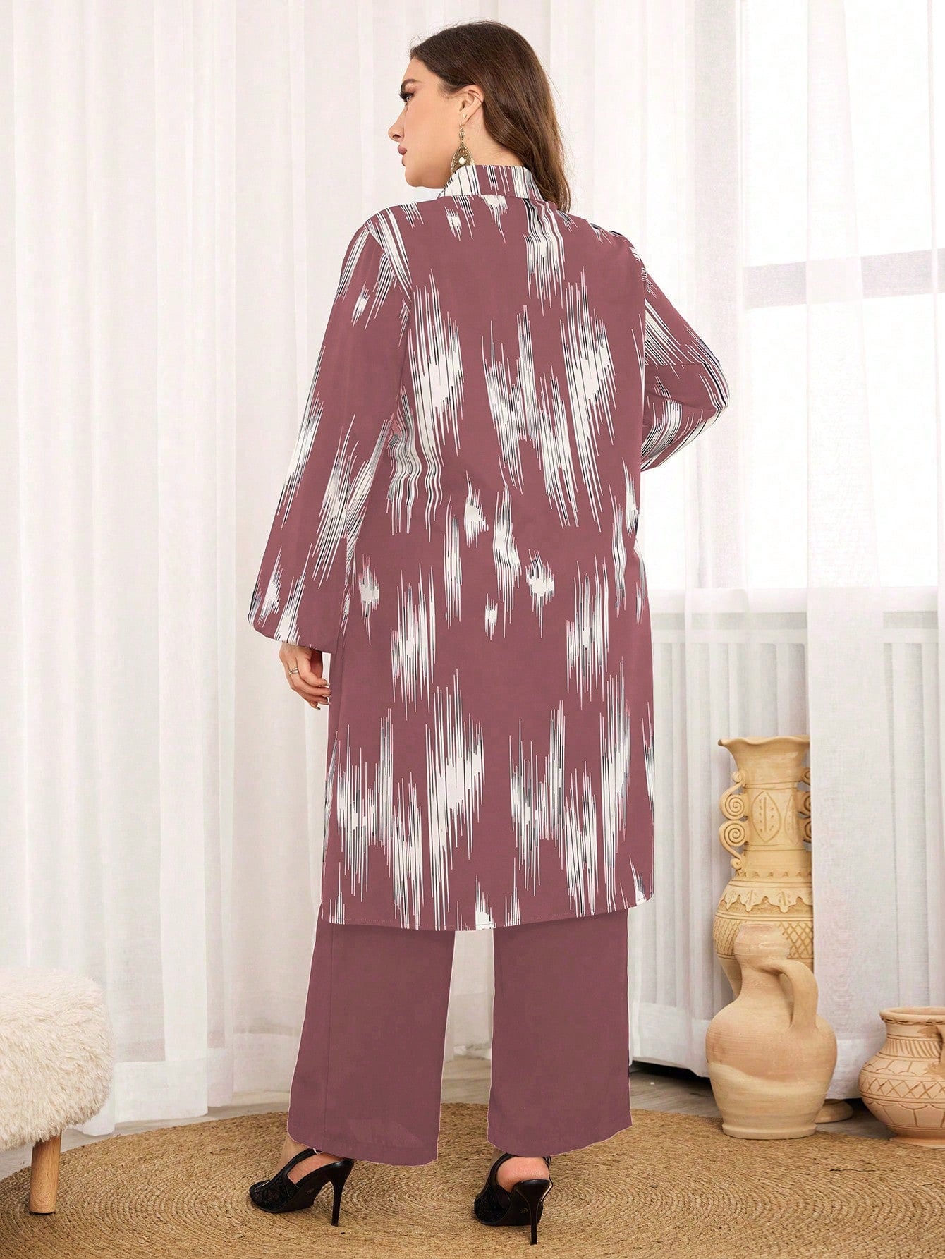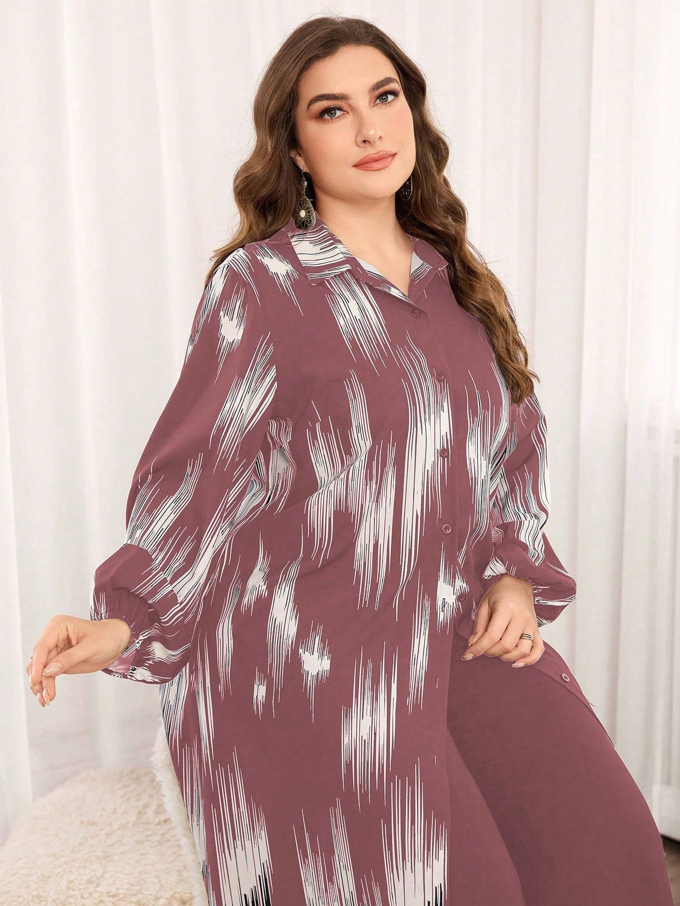 Lacomfia 2pcs/Set Plus Size Casual Commute Minimalist Long Shirt With Random Print, Stylish 2 Pieces