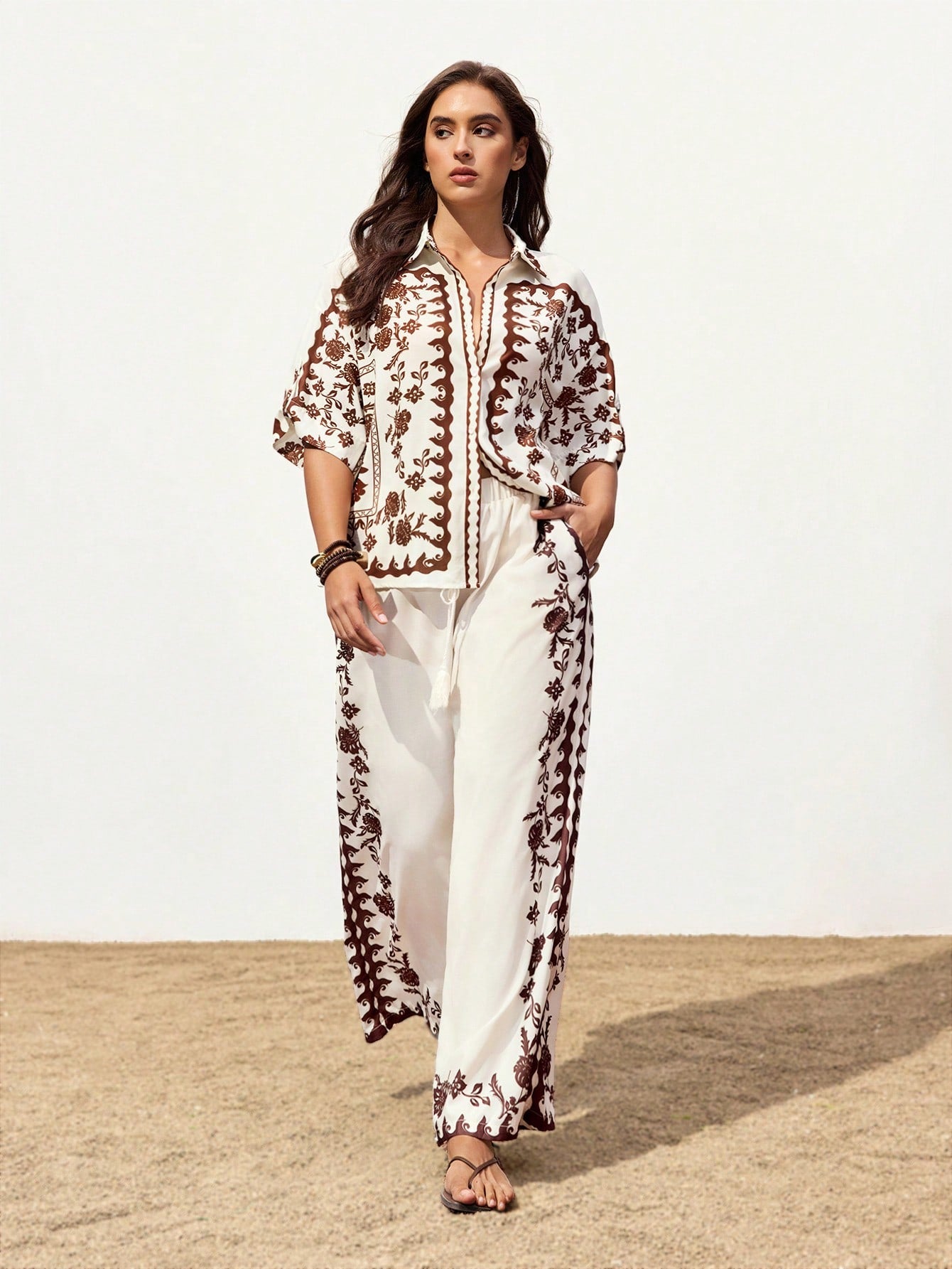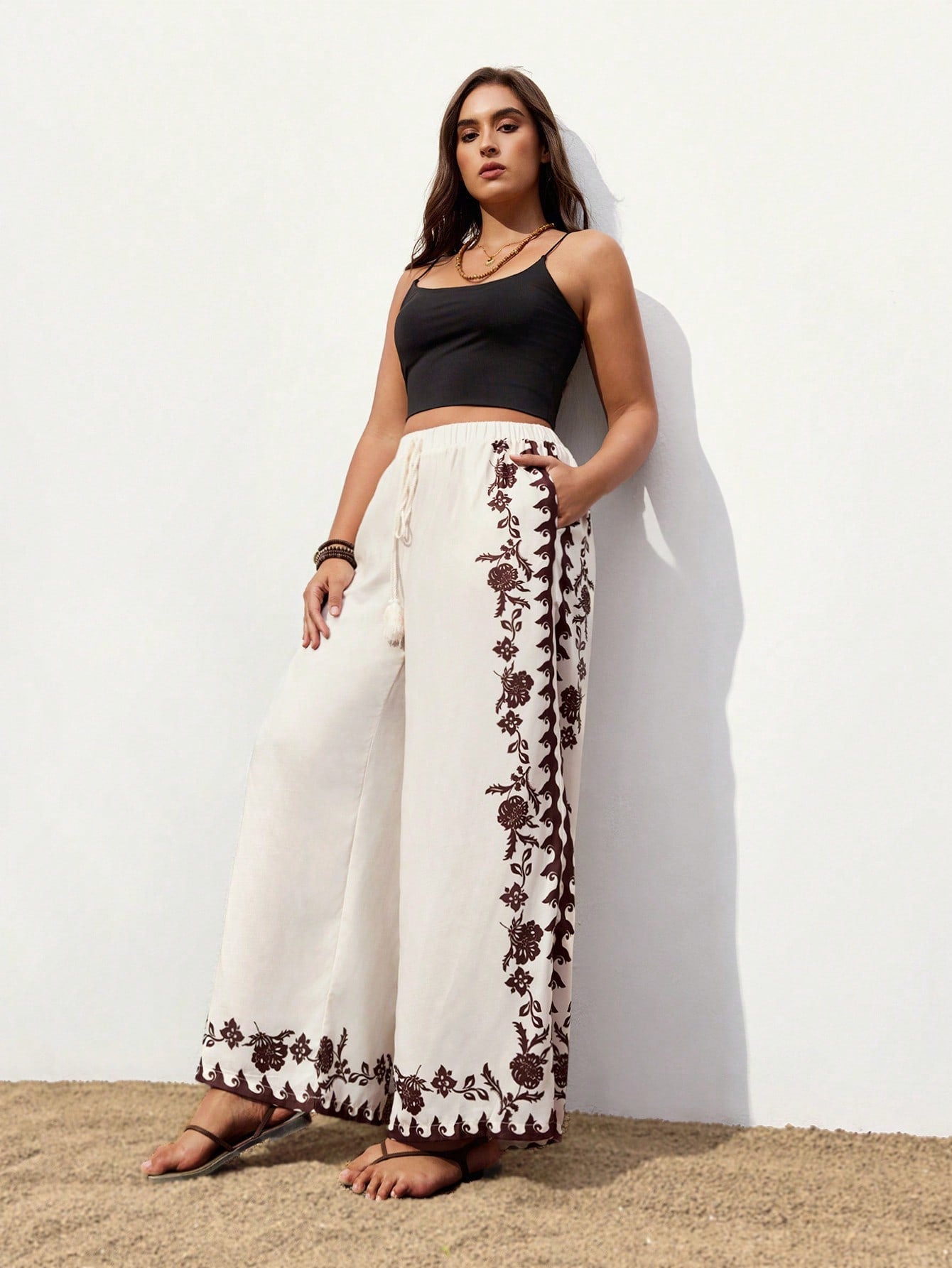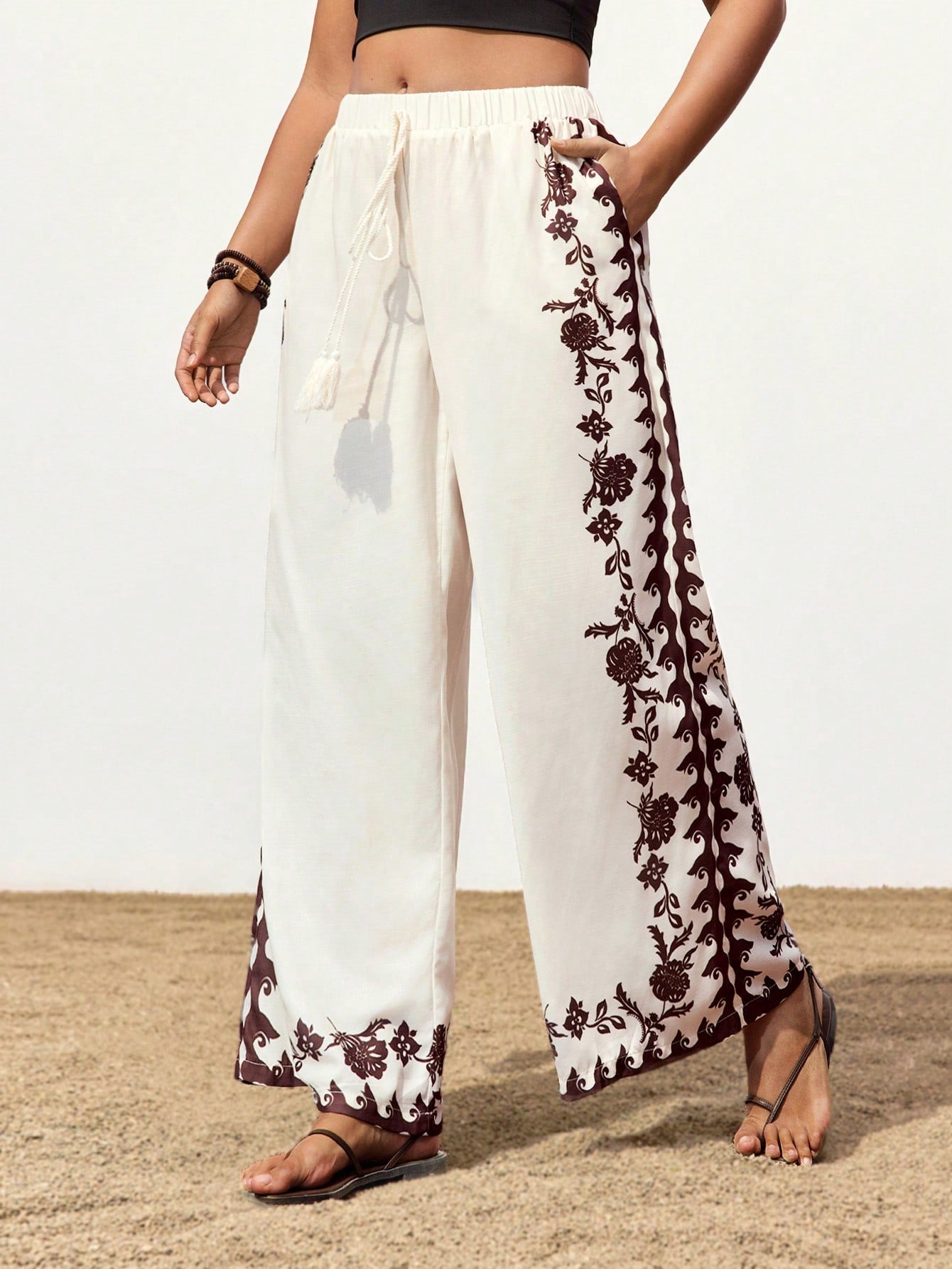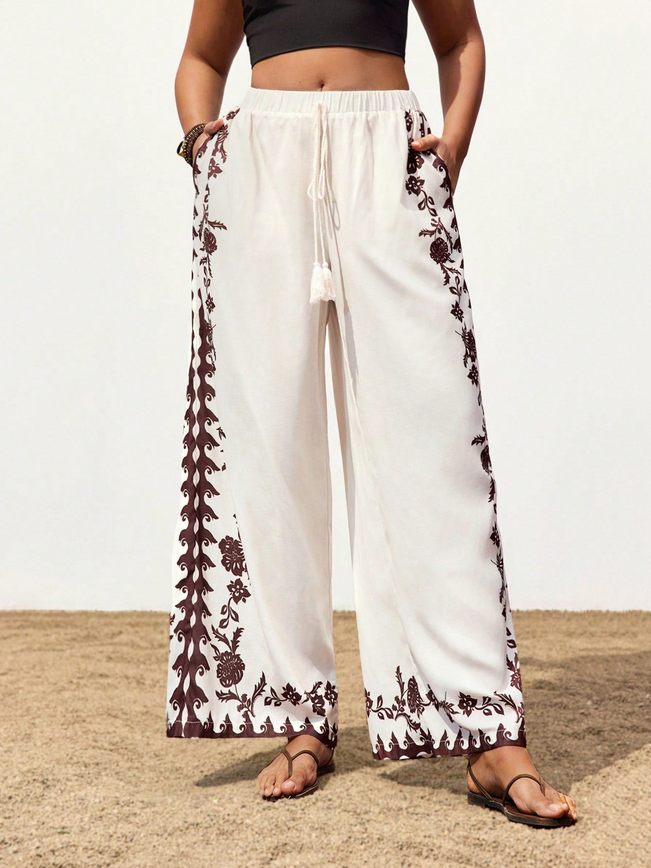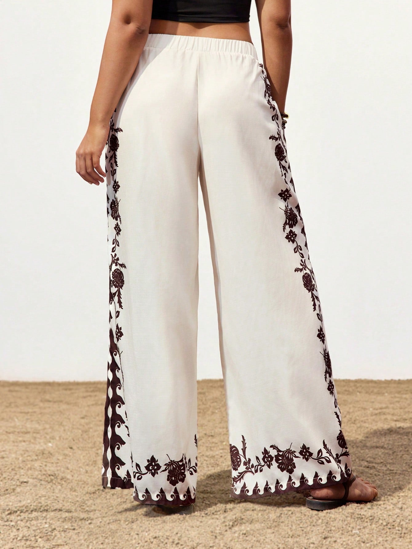 women Maija Plus Size Women Brown Floral Print Elastic Waist Side Pocket Pants