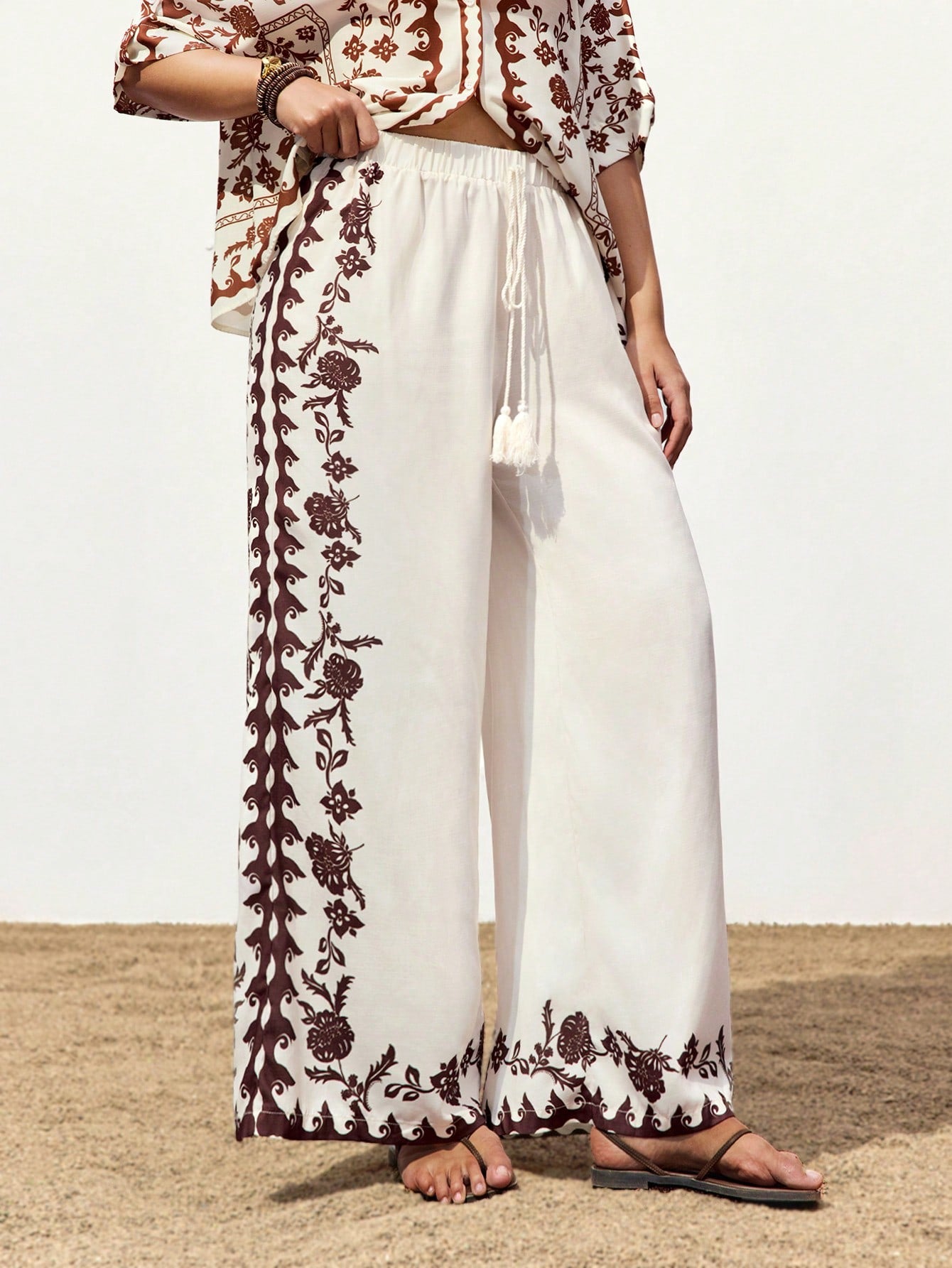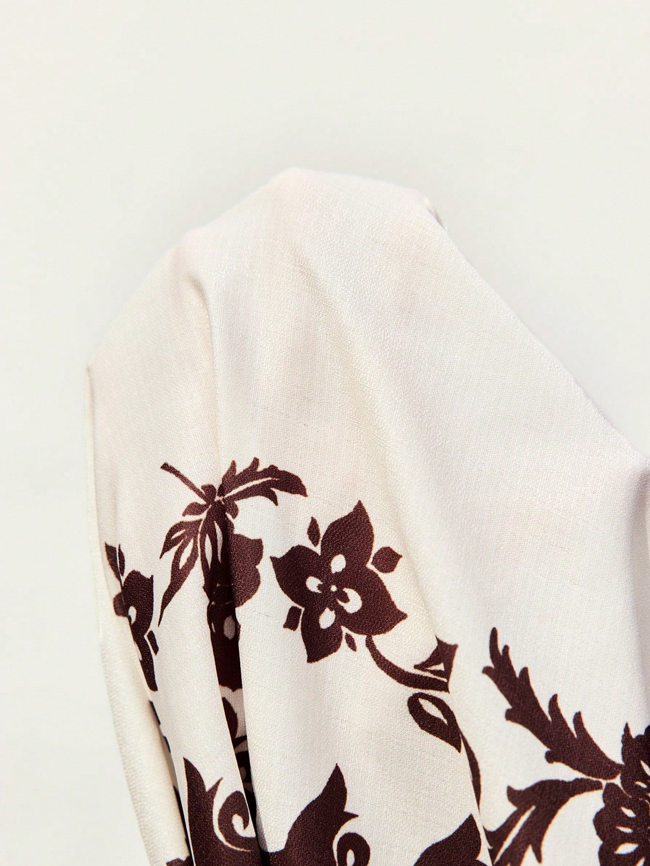 بنطلون مايا نسائي مقاس كبير بني بطبعة زهور وخصر مرن وجيوب جانبية