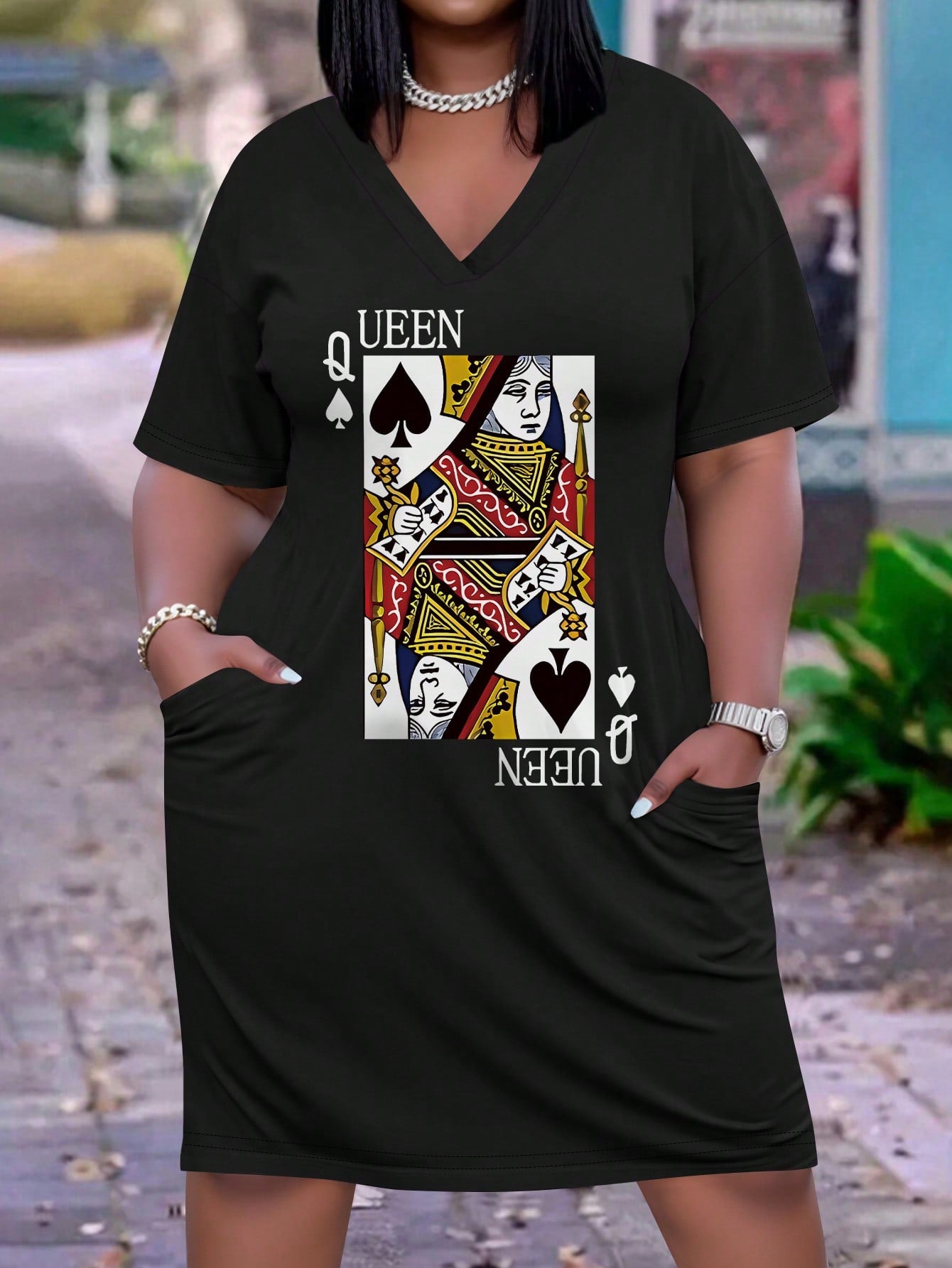 Maweii Plus Size Women Summer Creative Queen Of Cards Printed Casual Short Sleeve Dress