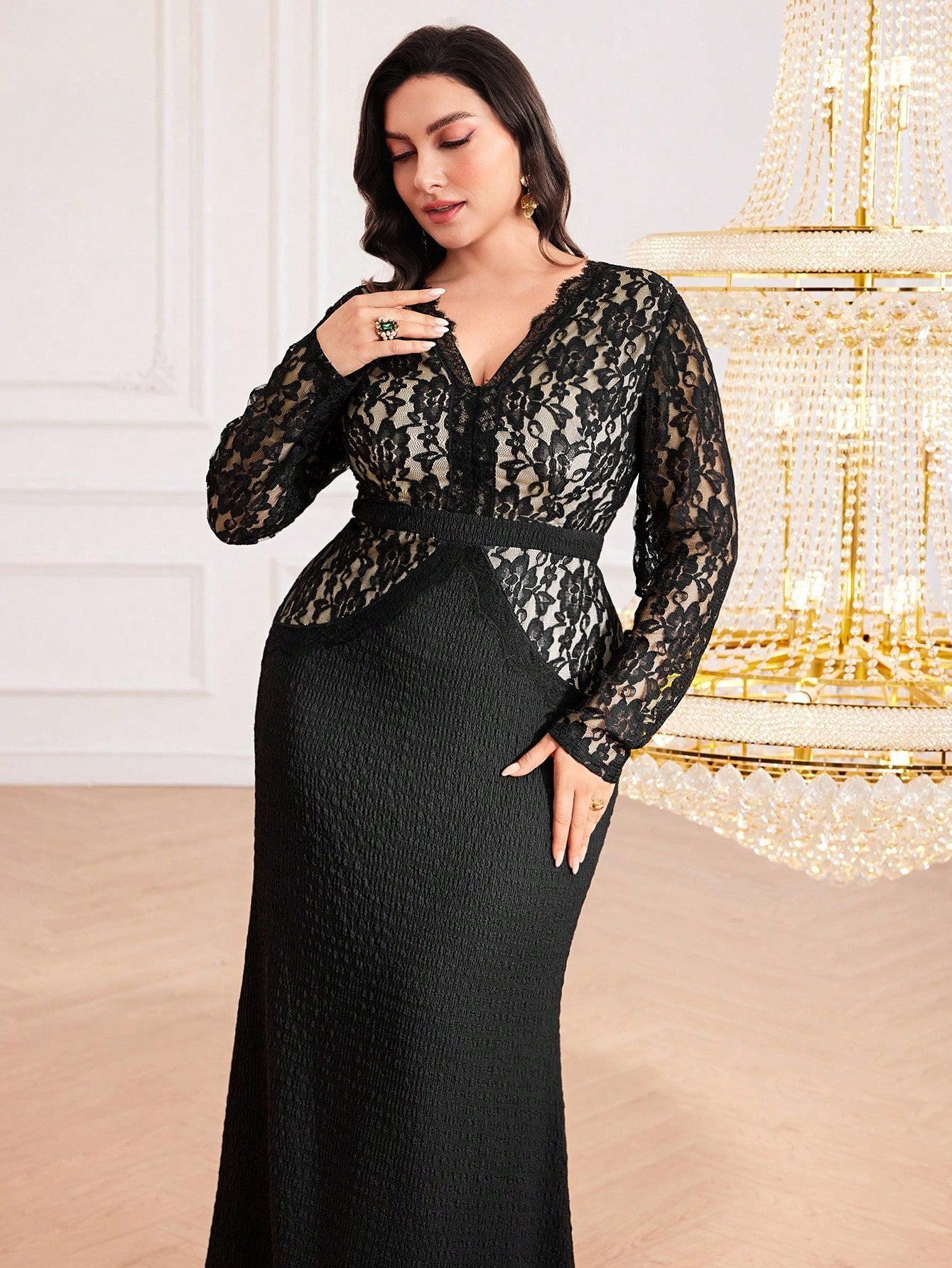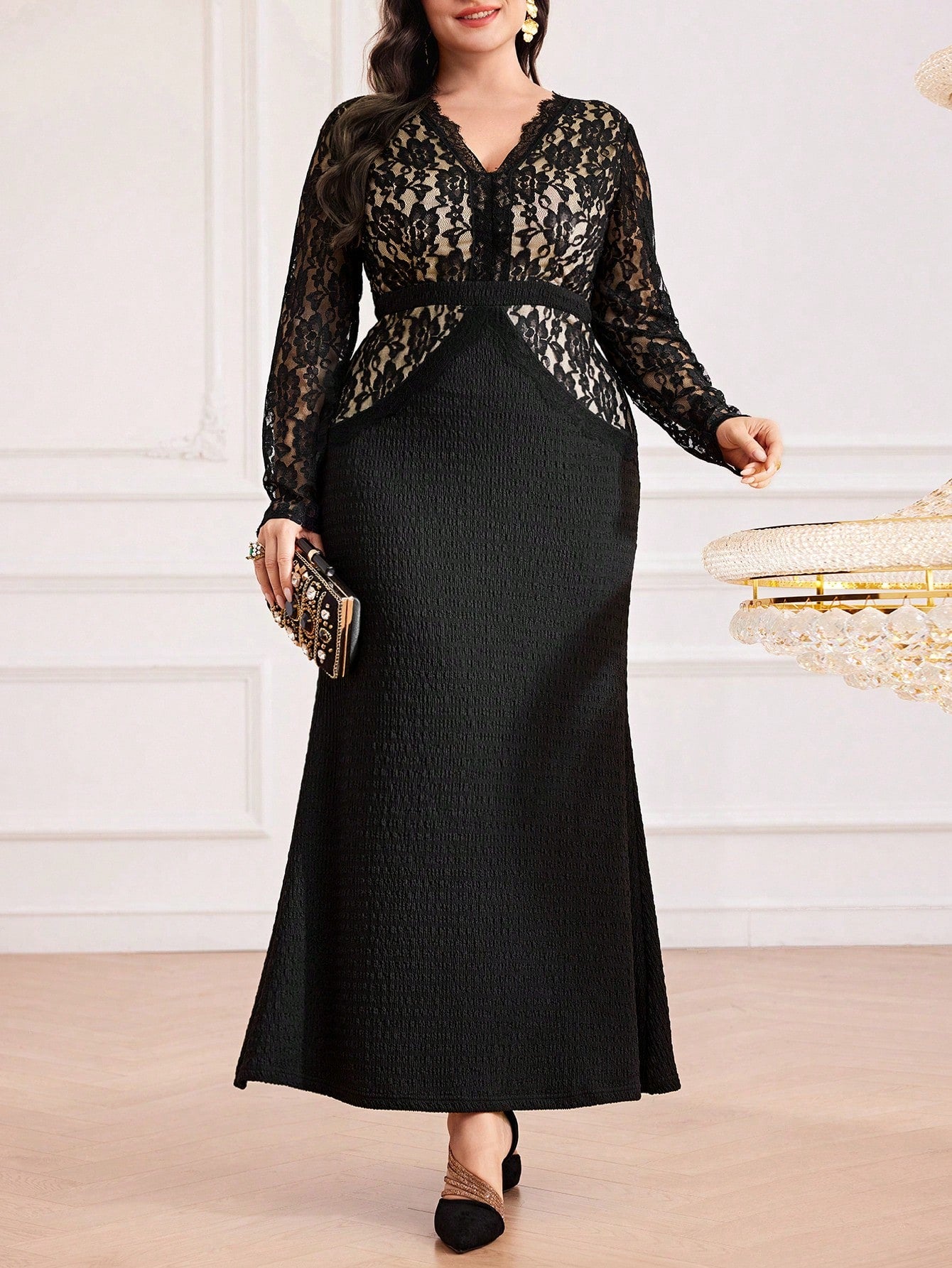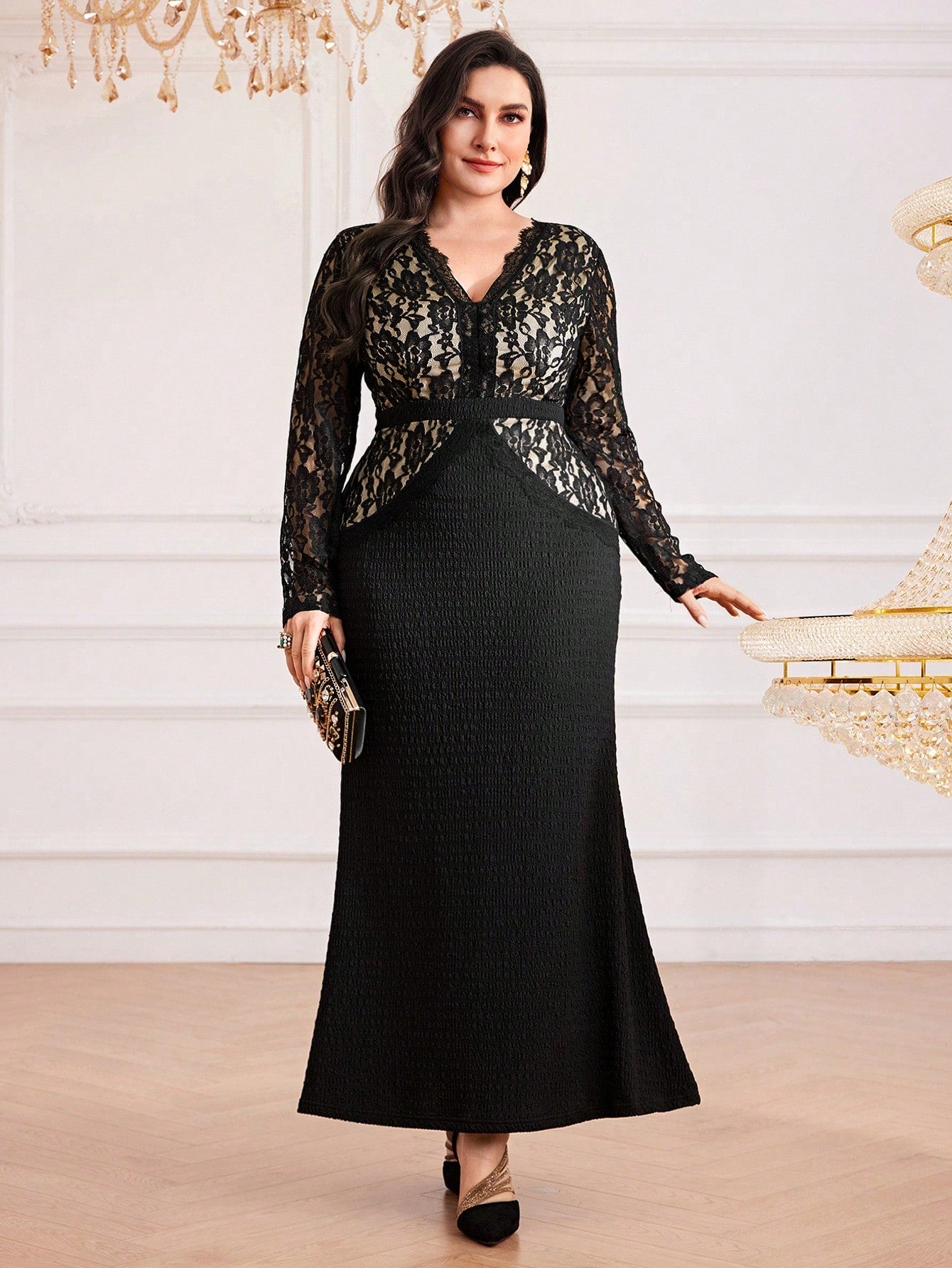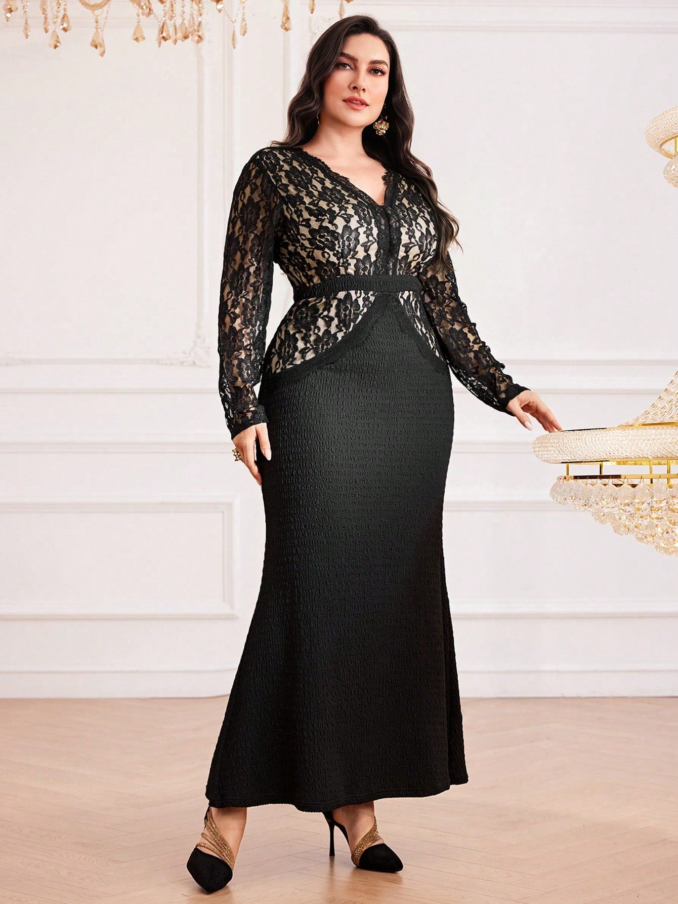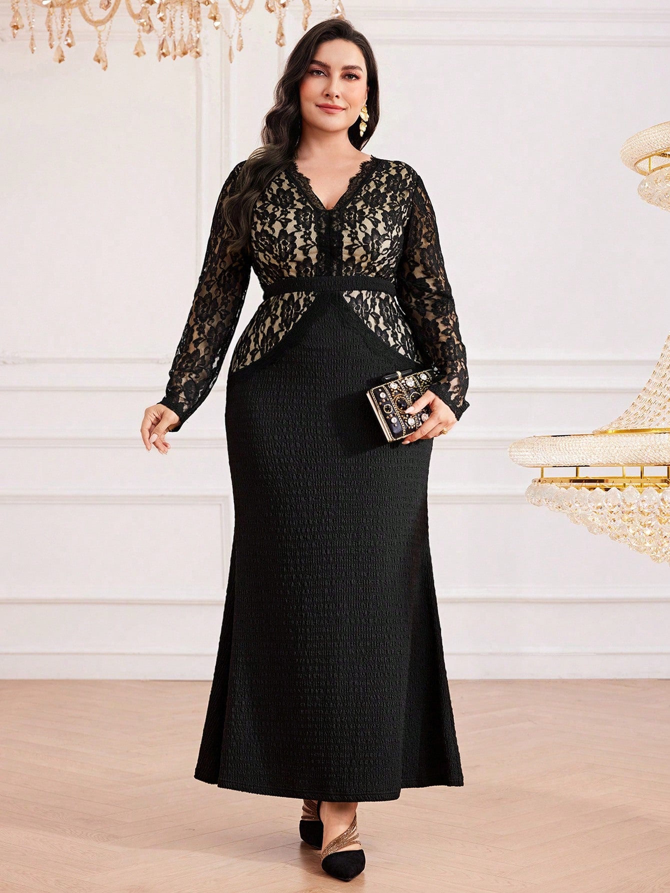 women Modelyn Plus Size Elegant Lace Splicing Fishtail Hem Dress Long Evening Dresses