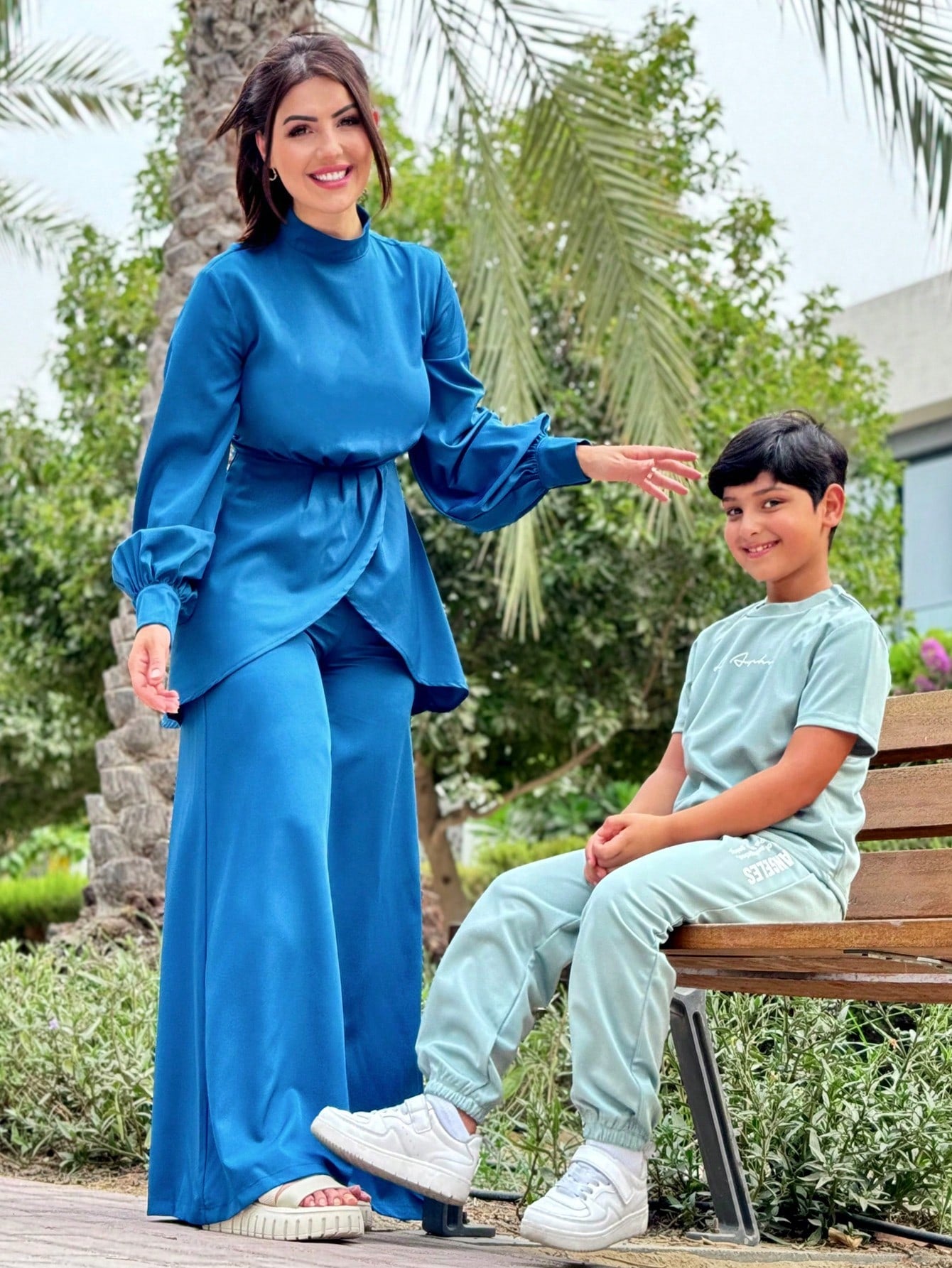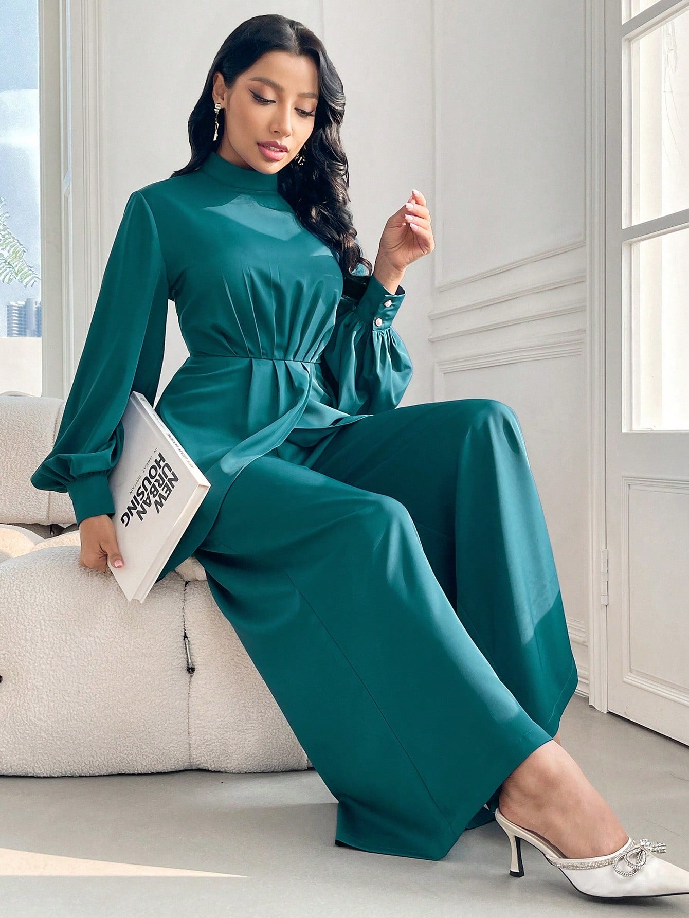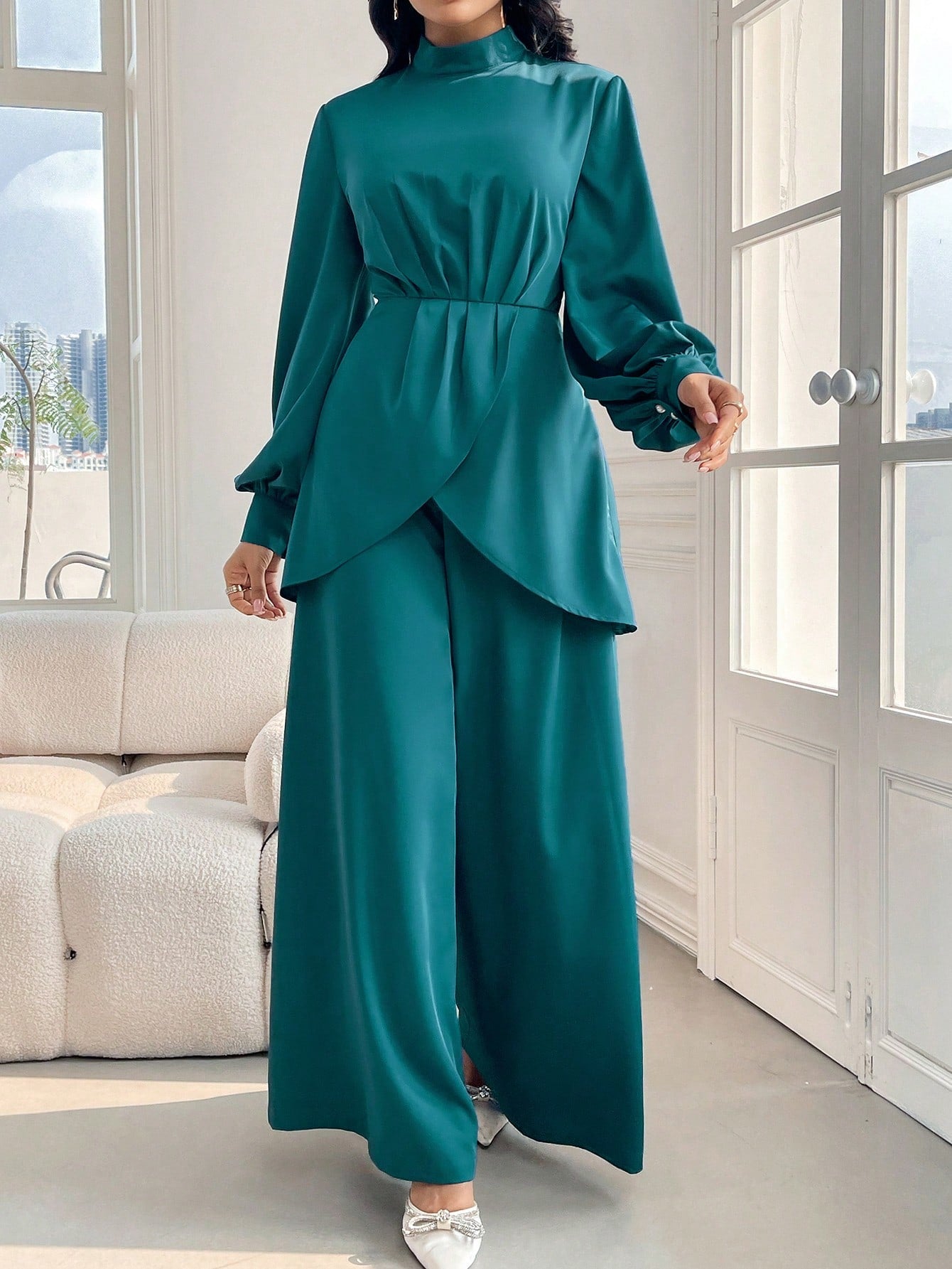 طقم موديلين نسائي ربيع/صيف، مكون من بلوزة بأكمام واسعة وحاشية غير متماثلة وياقة قائمة وبنطلون واسع الساق، طقم أنيق من قطعتين