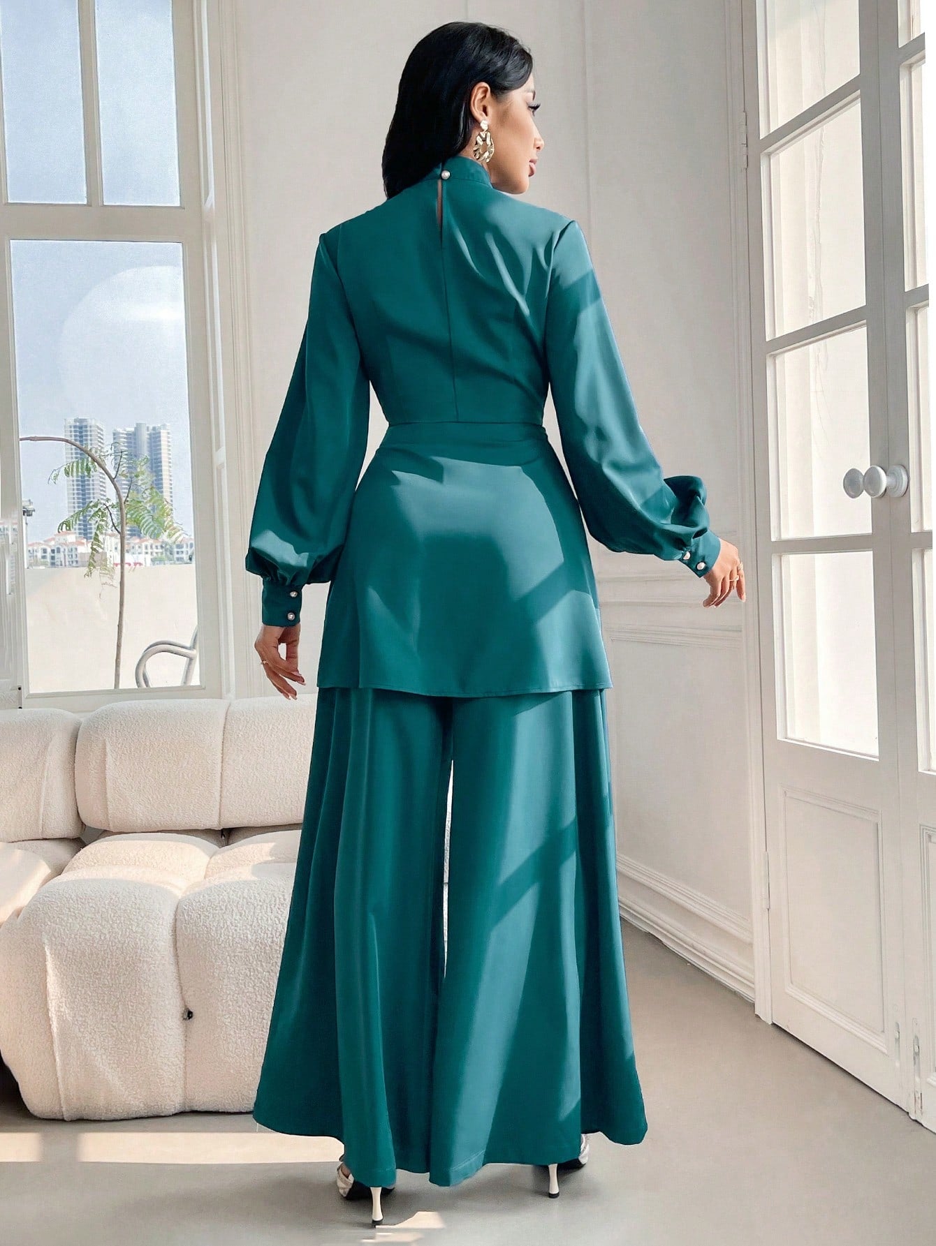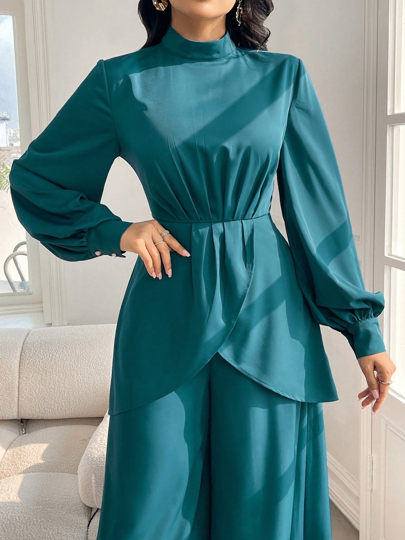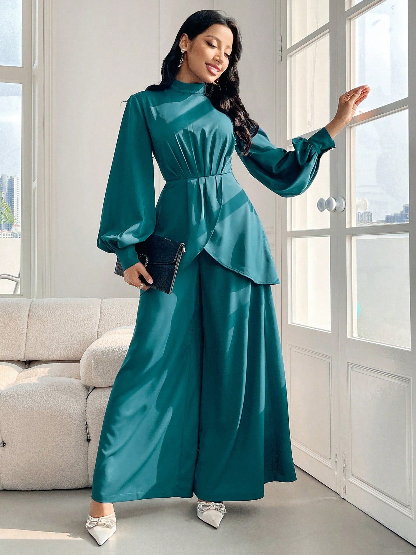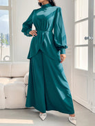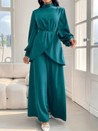 women Modelyn Women's Spring/Summer Stand Collar Lantern Sleeve Asymmetric Hem Top And Wide Leg Pants Elegant Two-Piece Set 2 Pieces Set