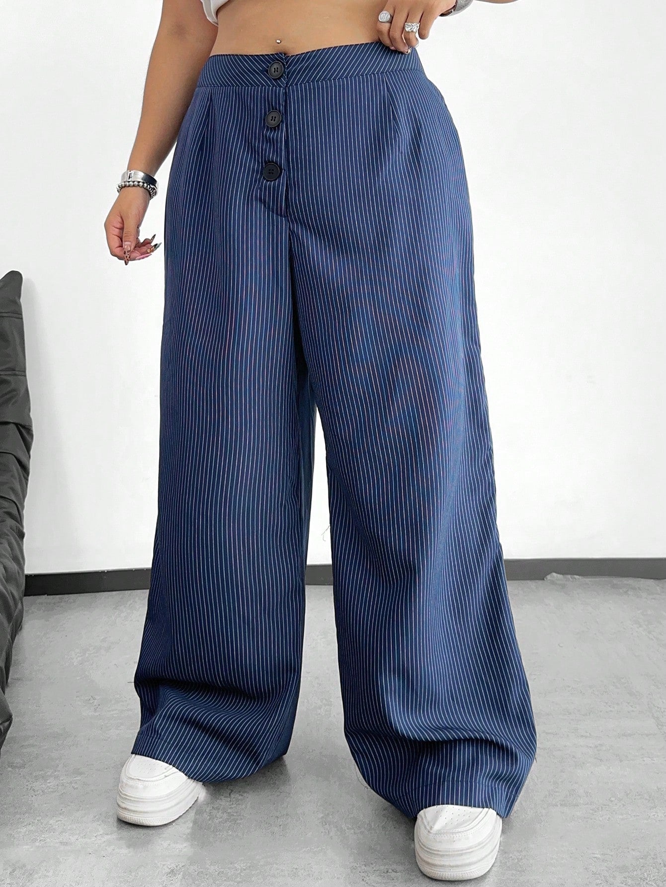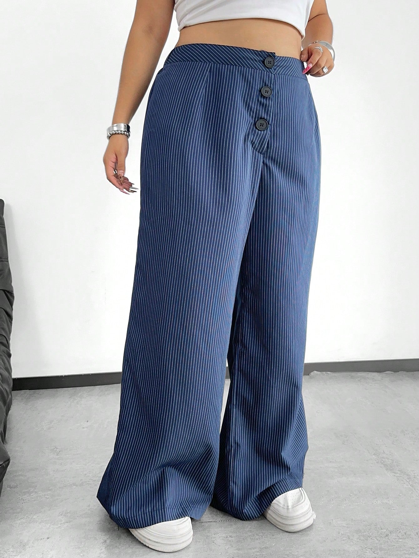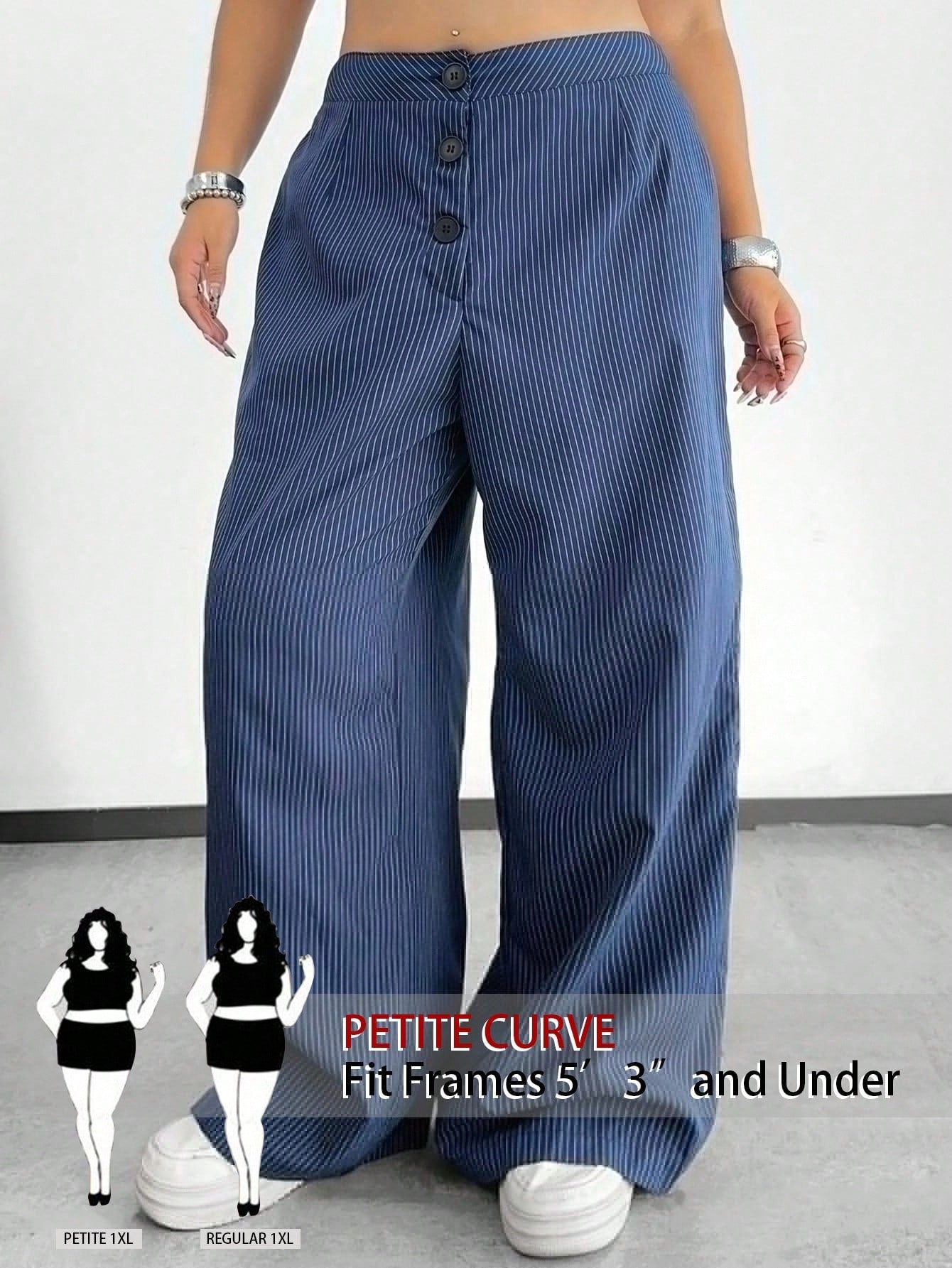 بنطلون نسائي فضفاض مخطط بسيط بأزرار مقاس كبير من PETITE