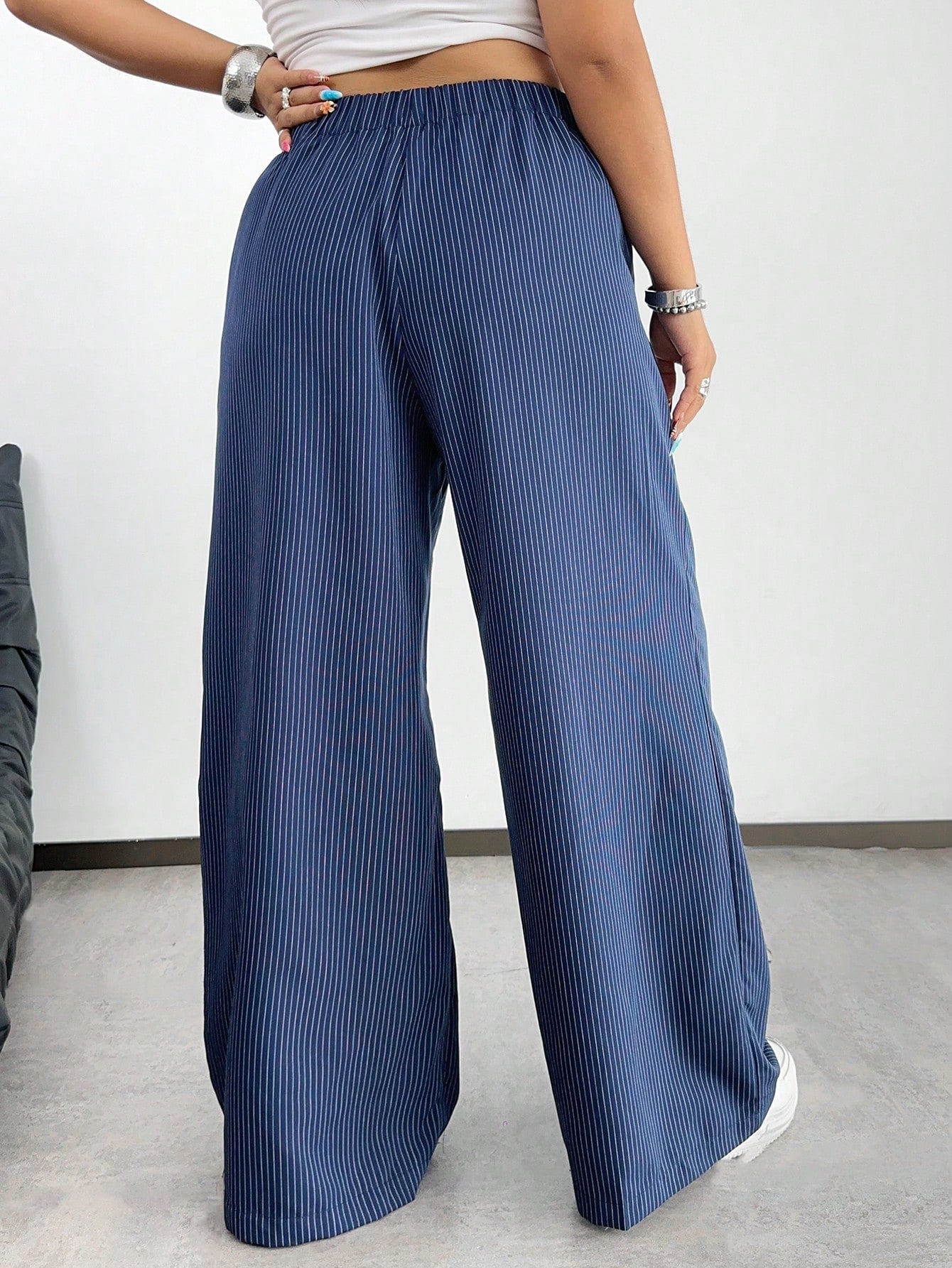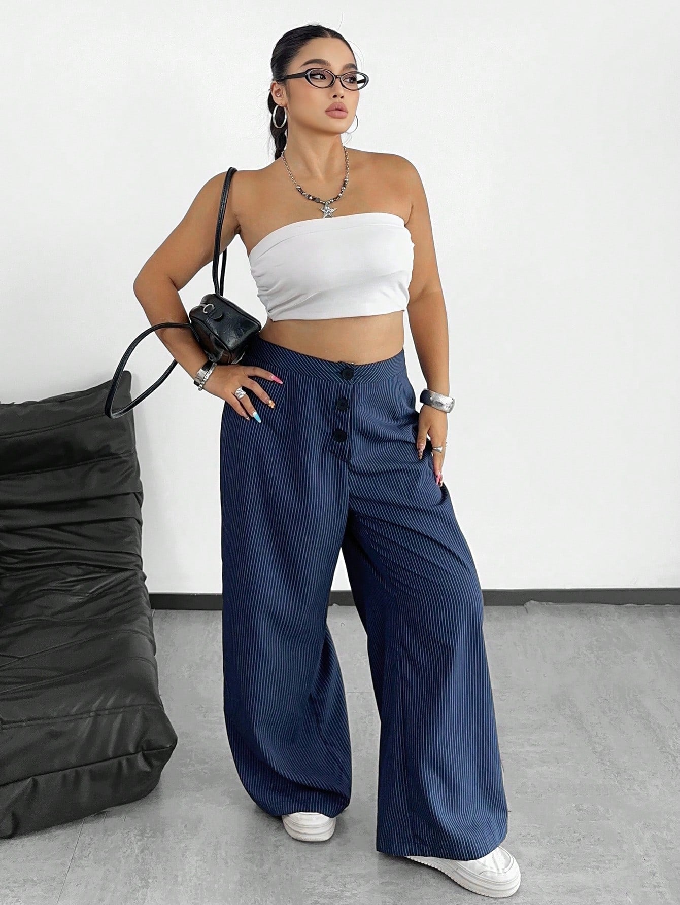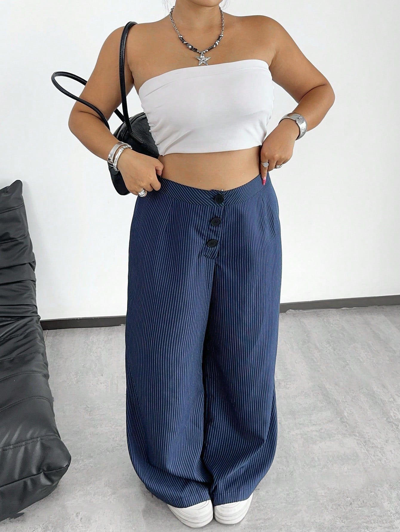 بنطلون نسائي فضفاض مخطط بسيط بأزرار مقاس كبير من PETITE