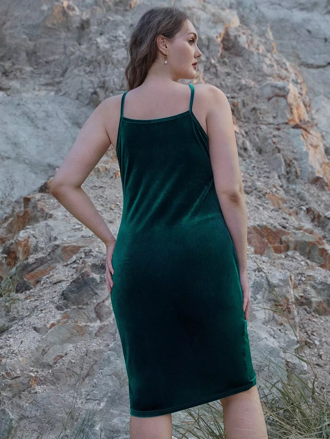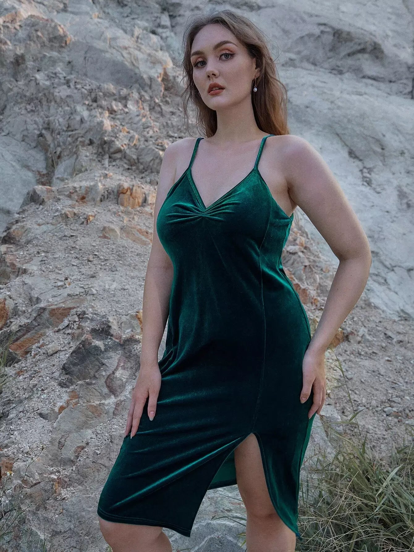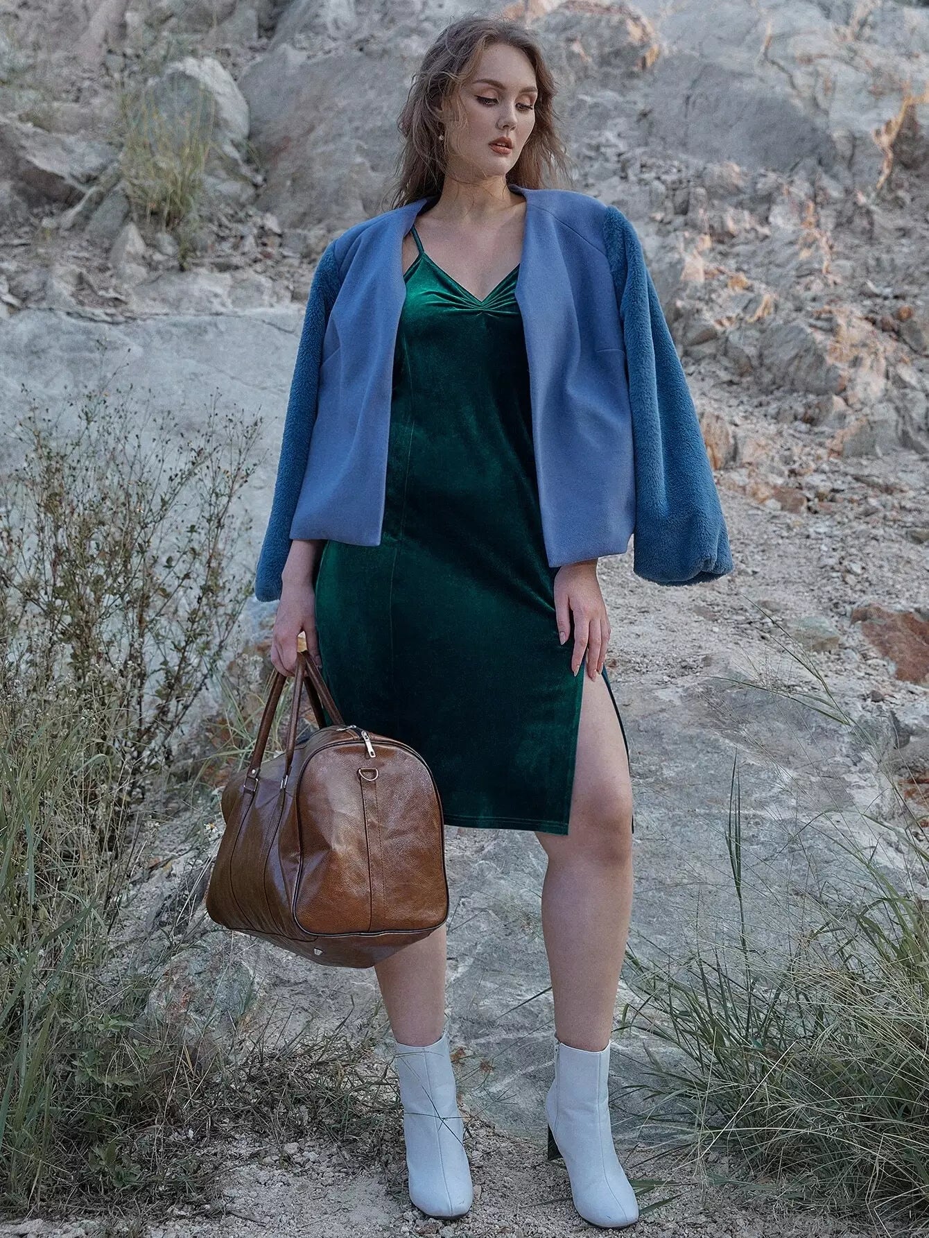 فستان كامي مخملي بفتحة منفوشة بحاشية مخملية زائد 1 قطعة