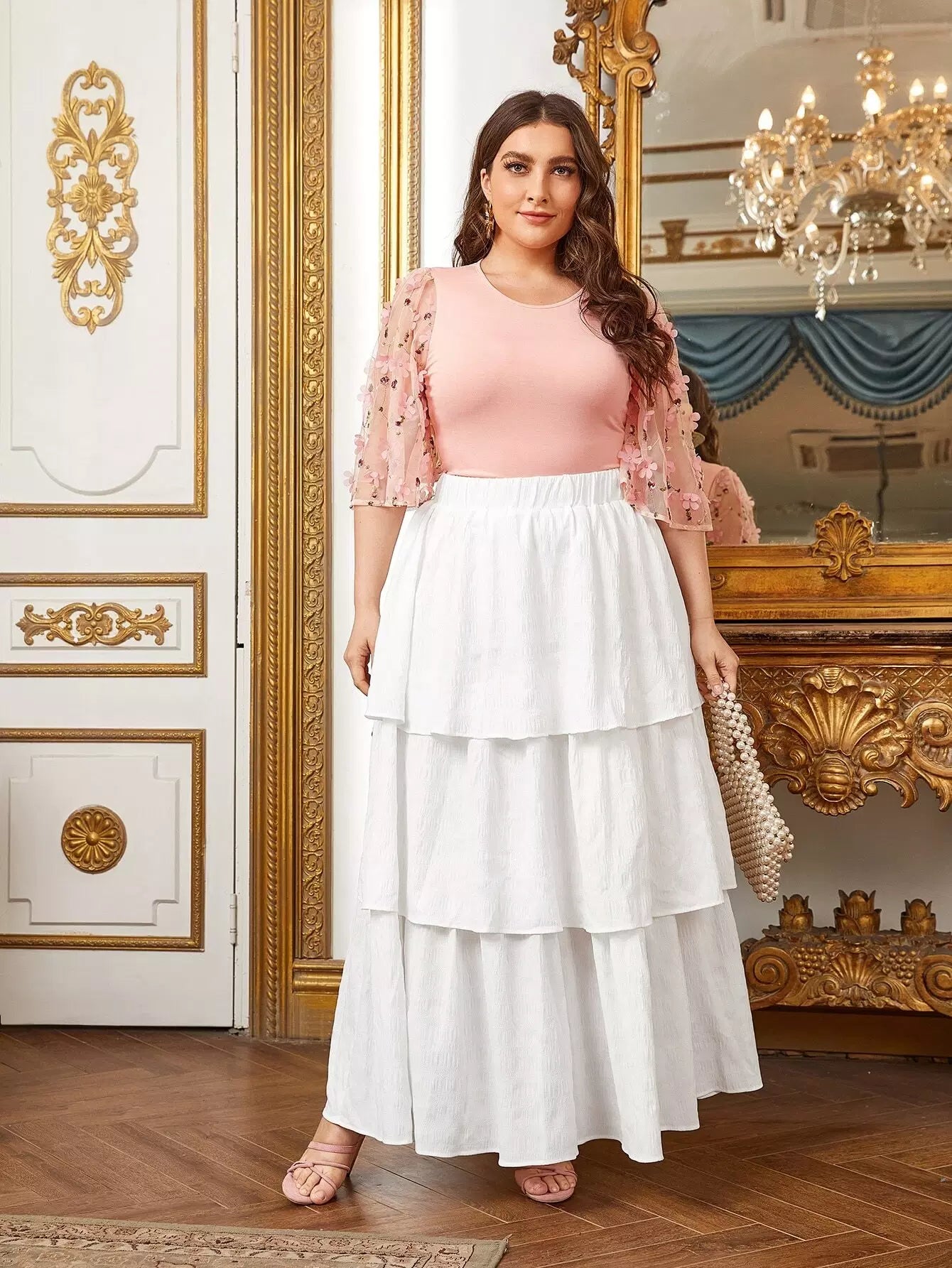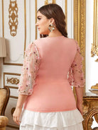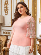 بلوزة بأكمام شبكية مزينة بالزهور ثلاثية الأبعاد بلس