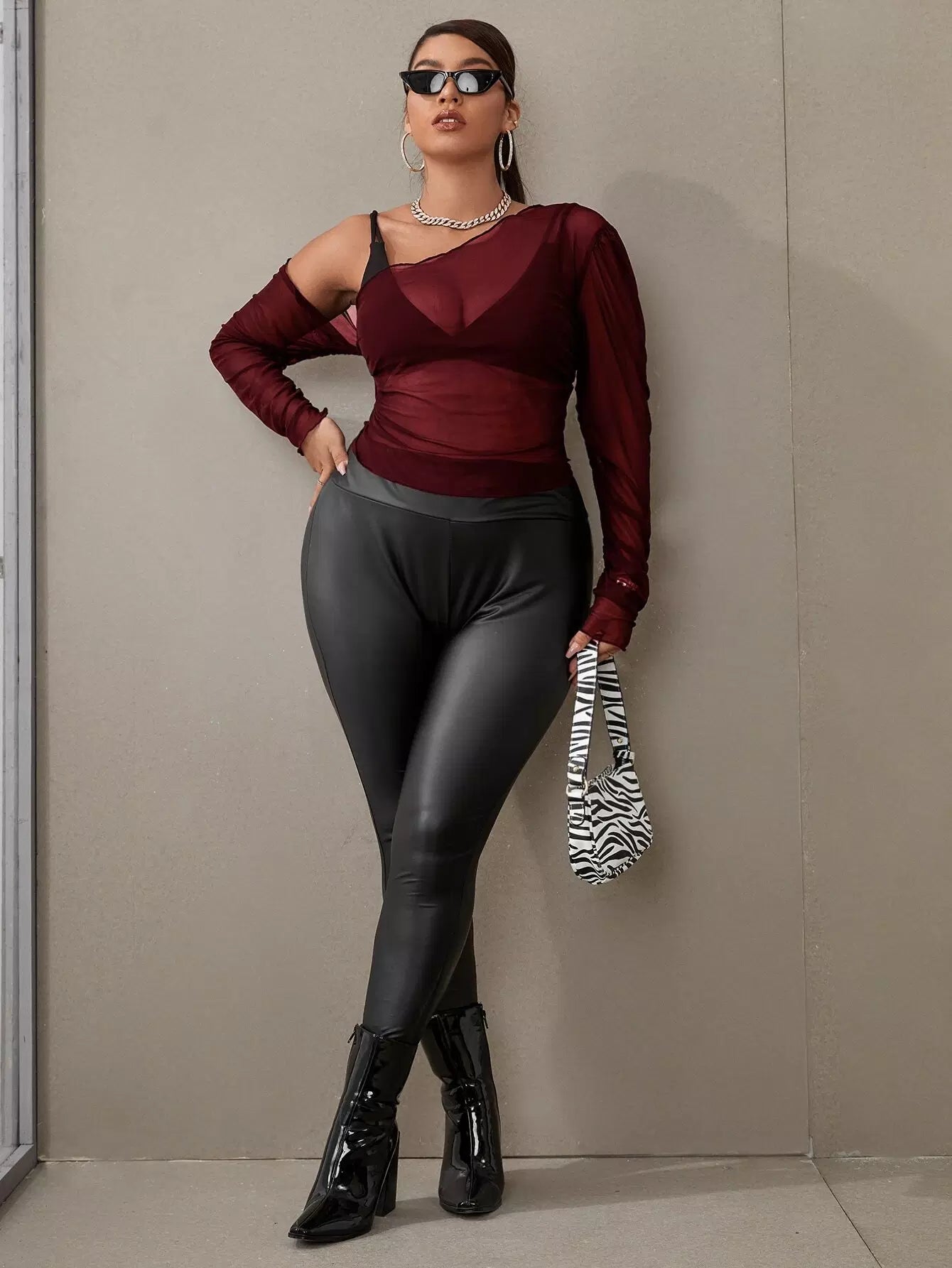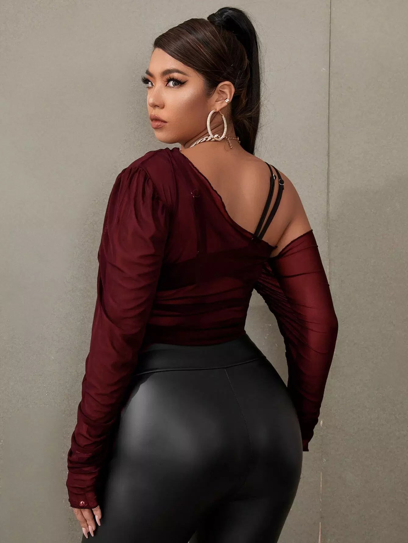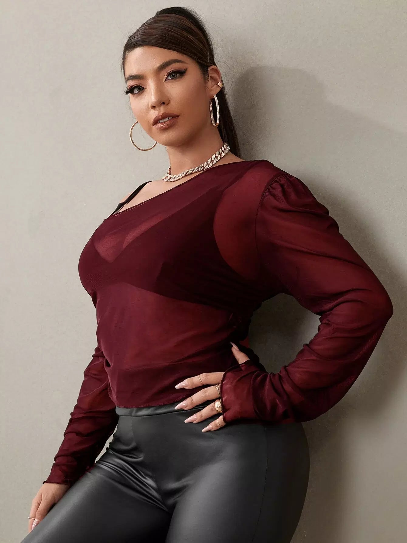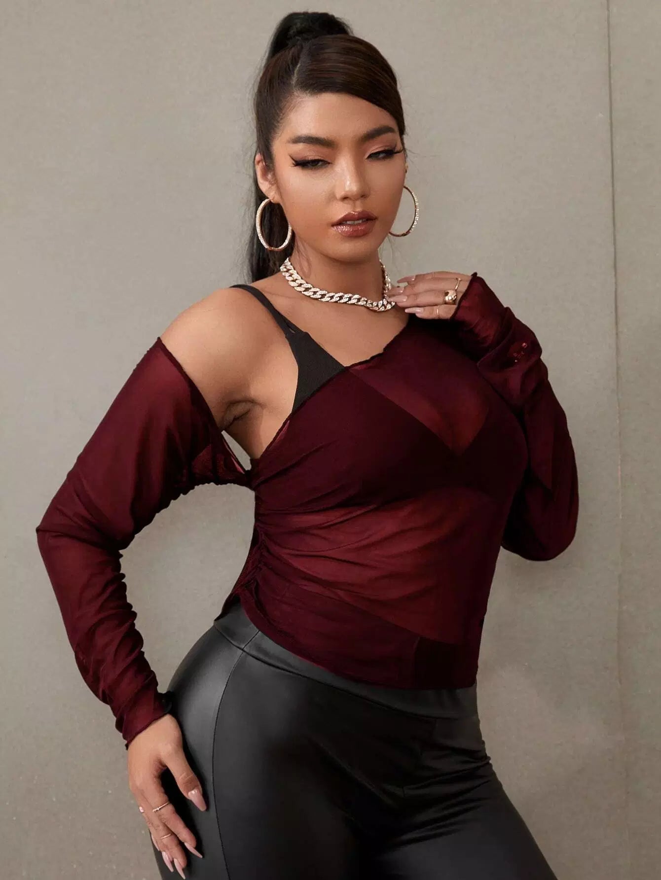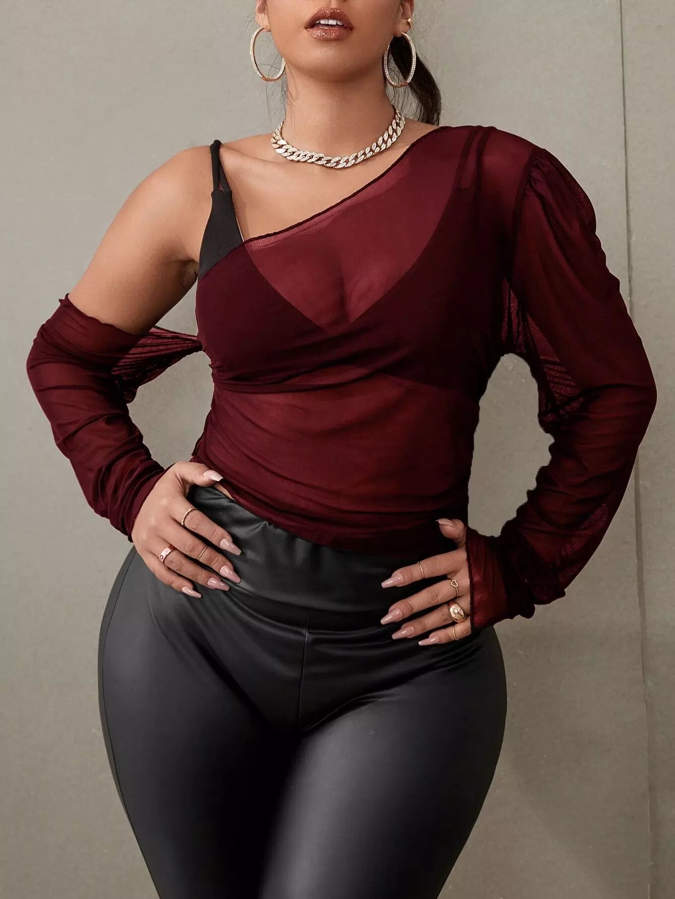 بلوزة شفافة برقبة غير متناظرة برقبة شفافة
