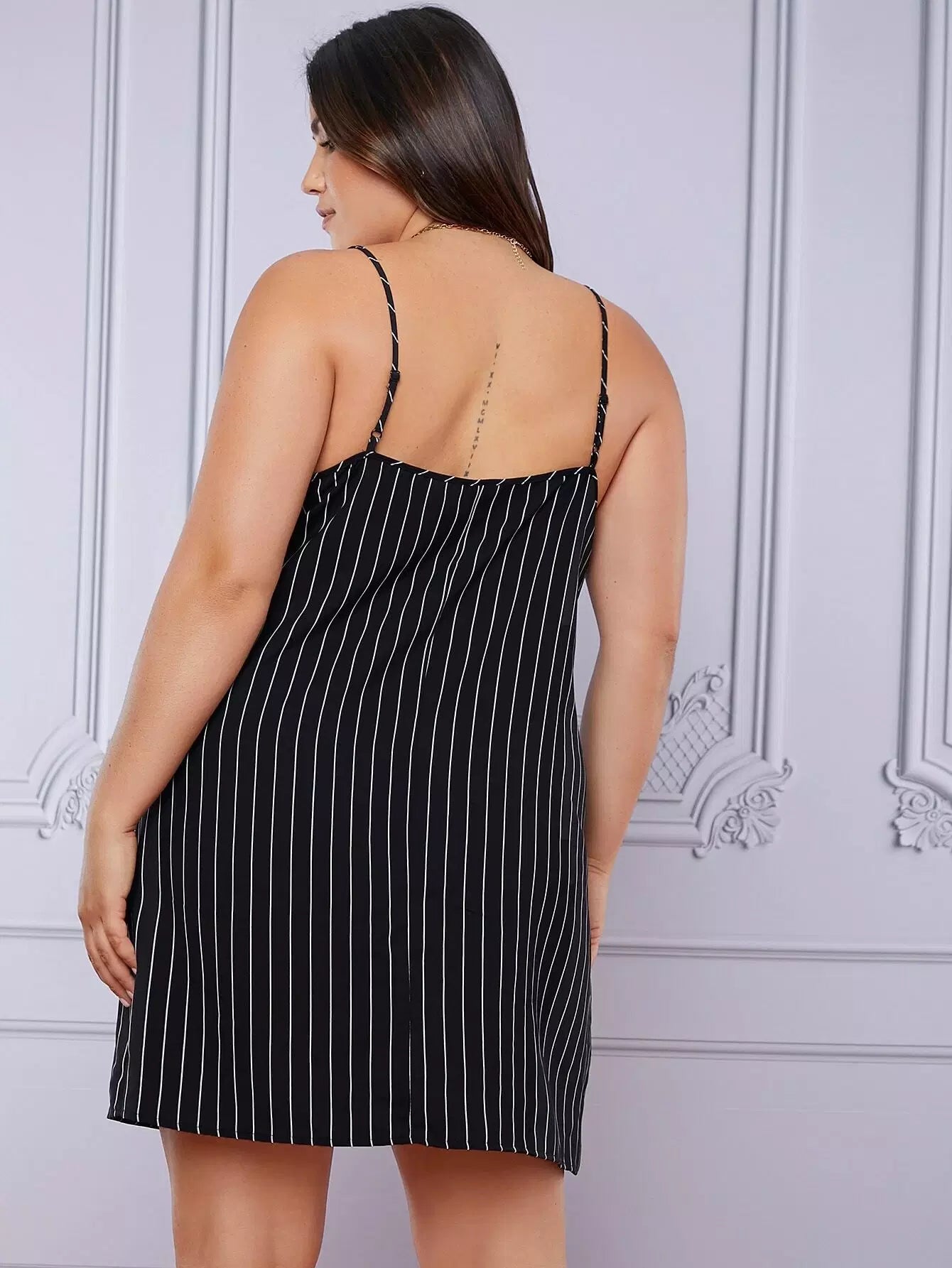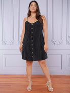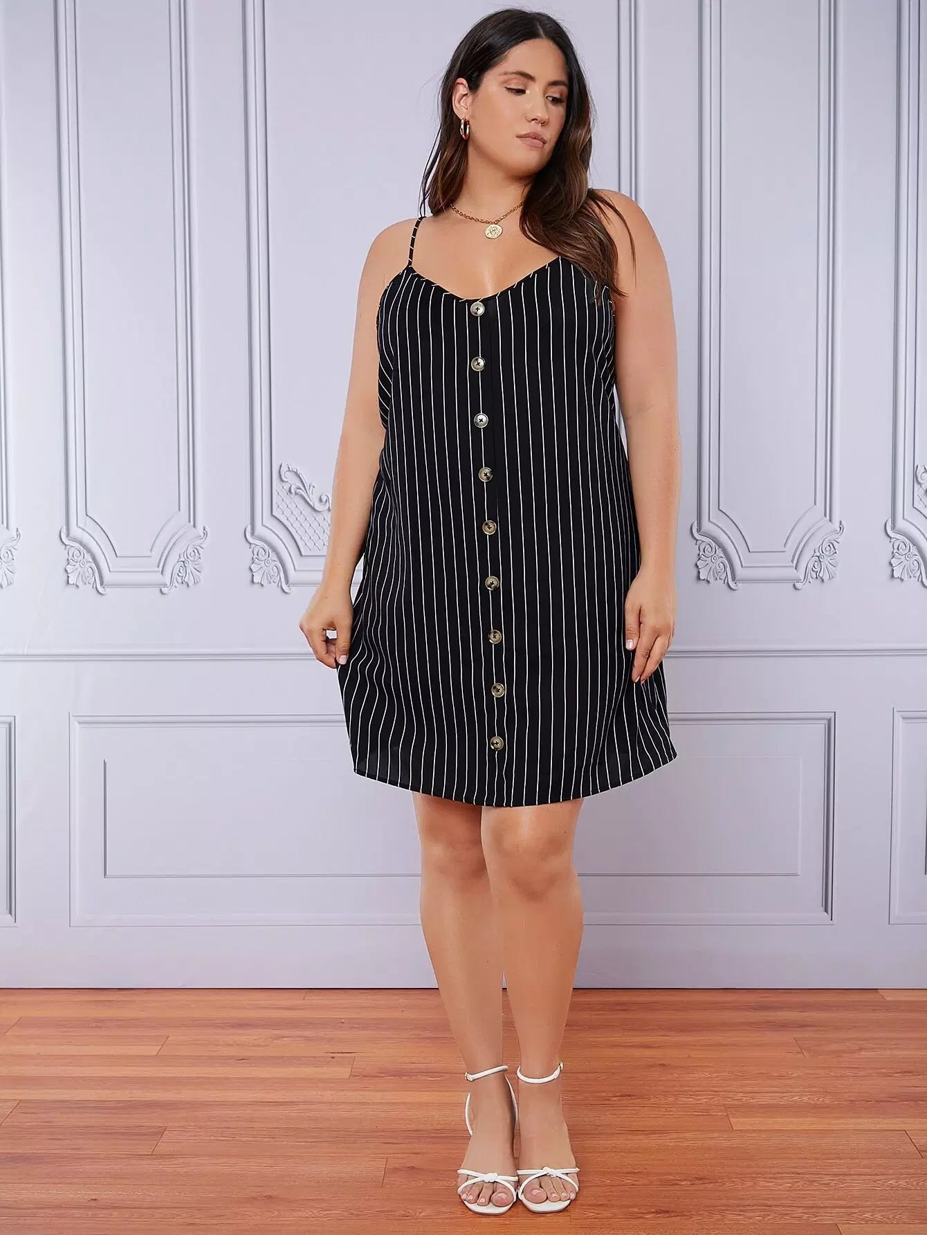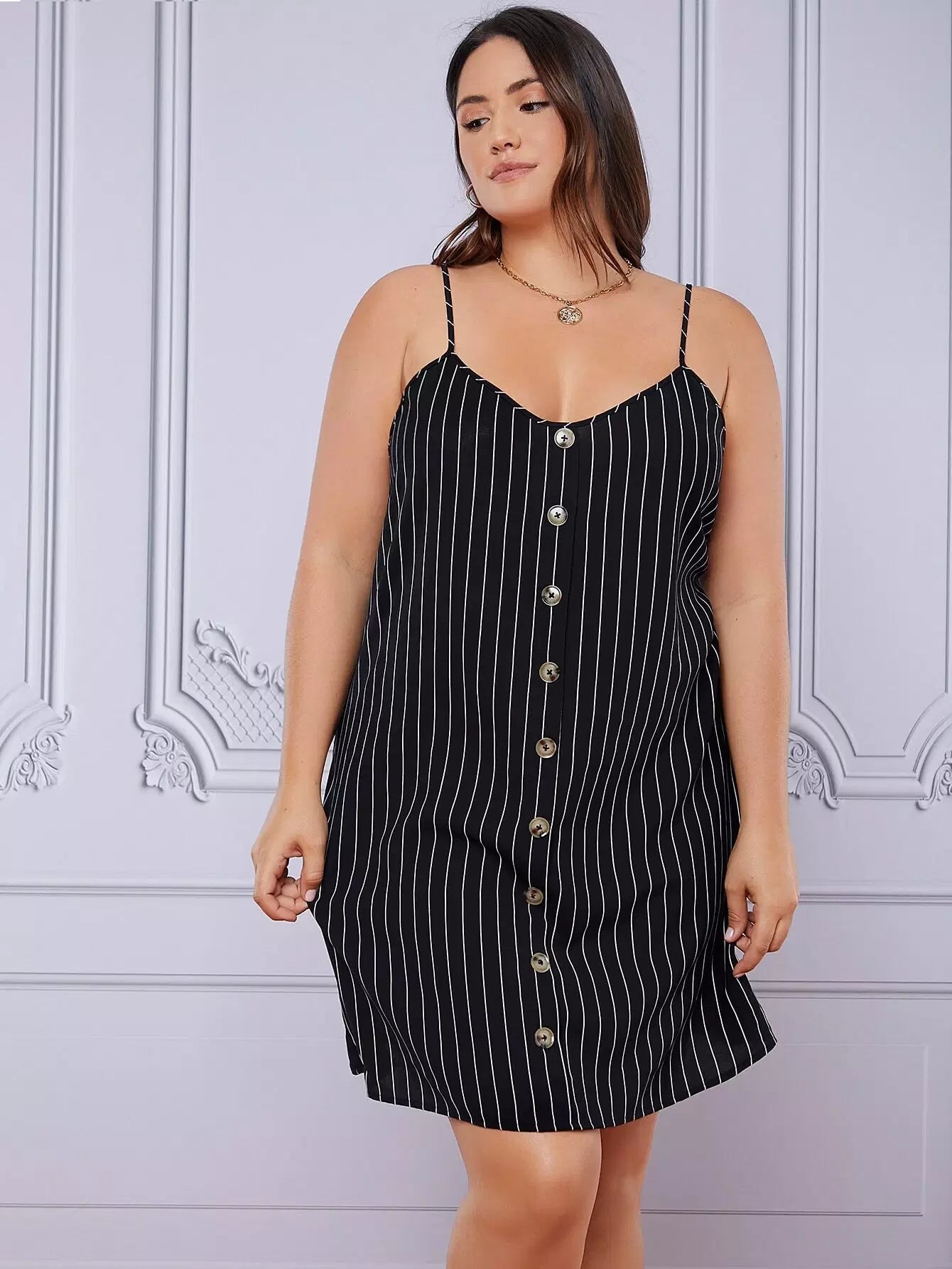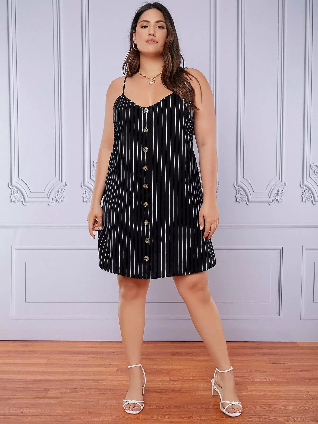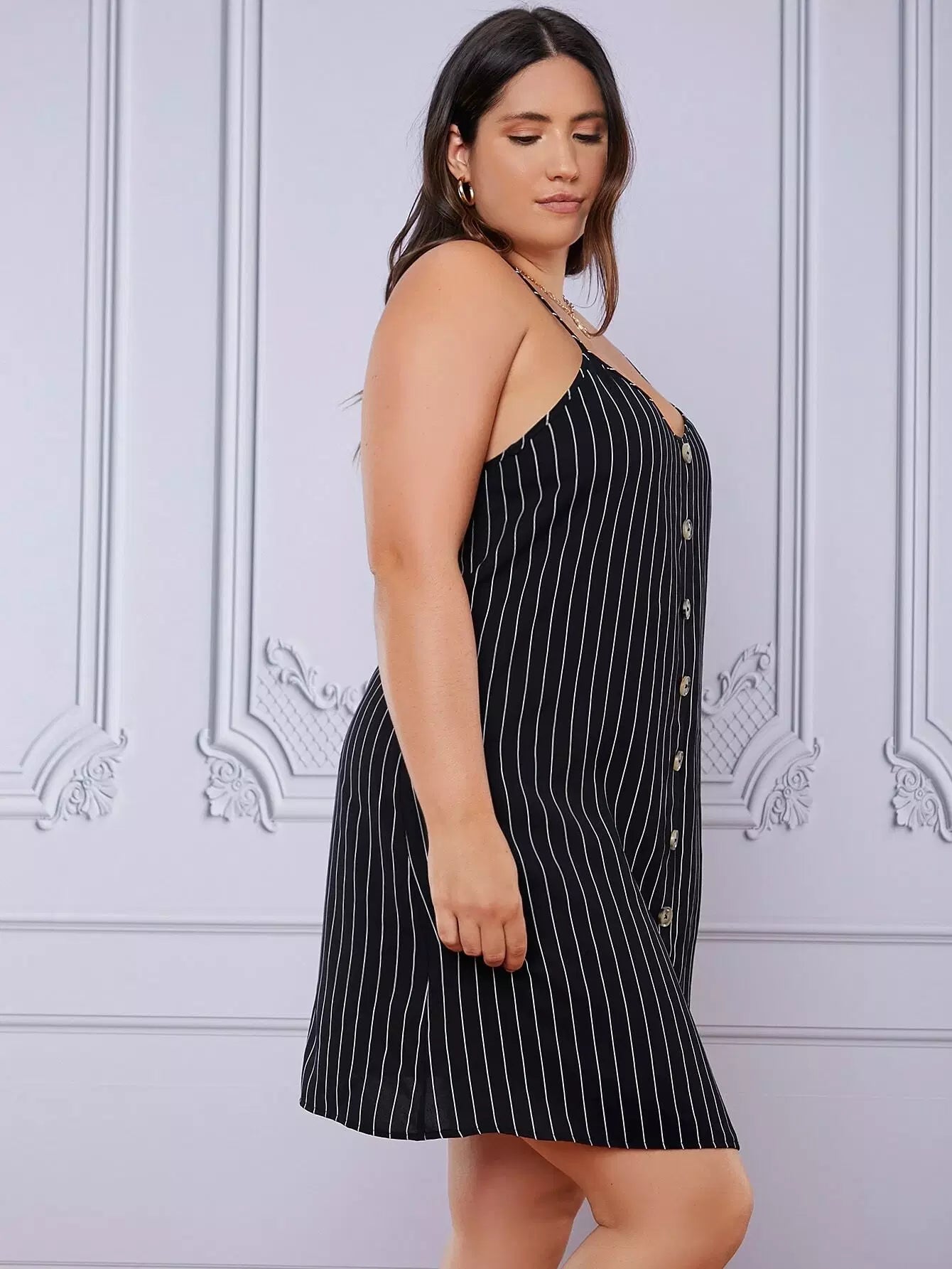 فستان كامي مخطط بأزرار أمامي بأزرار زائد