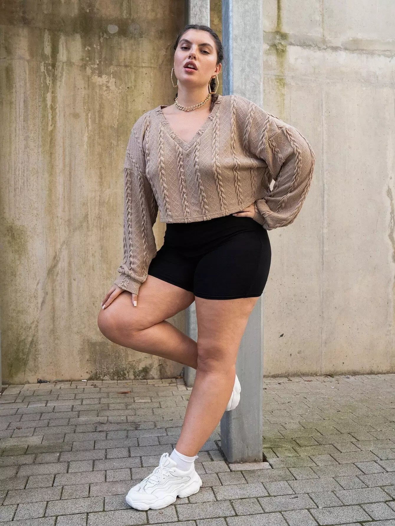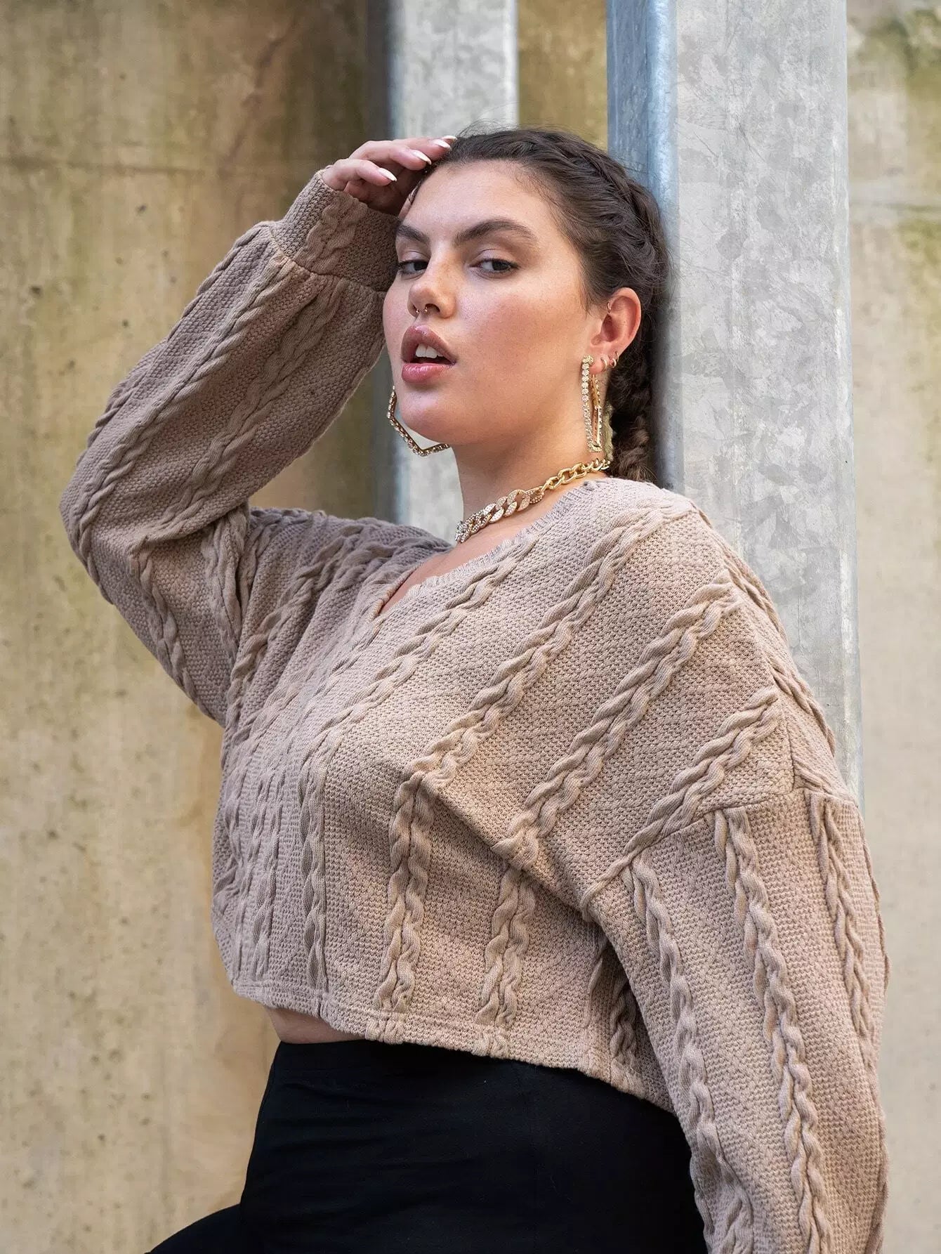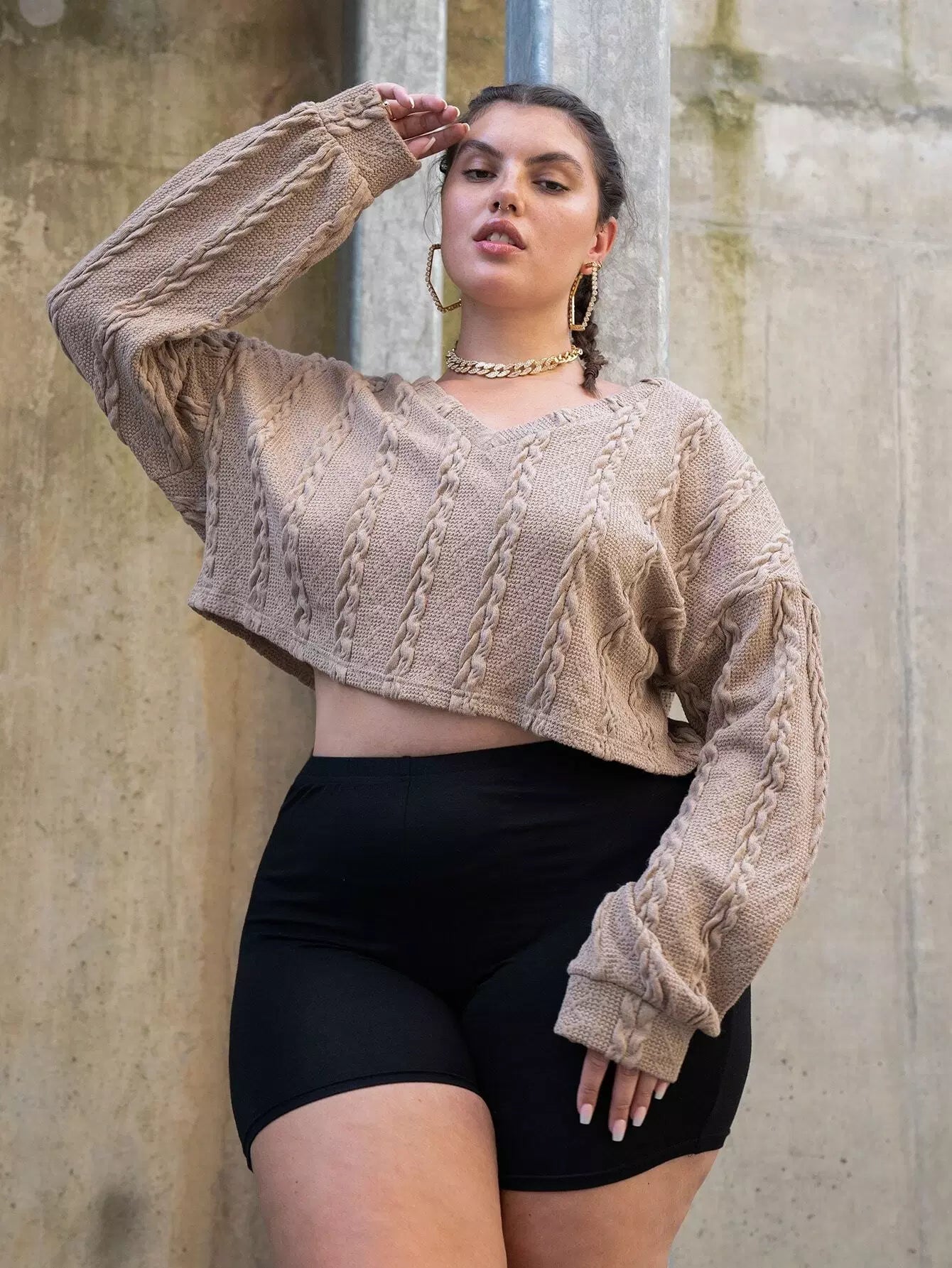 بلوزة قصيرة محبوكة بكابل محبوكة بلاس