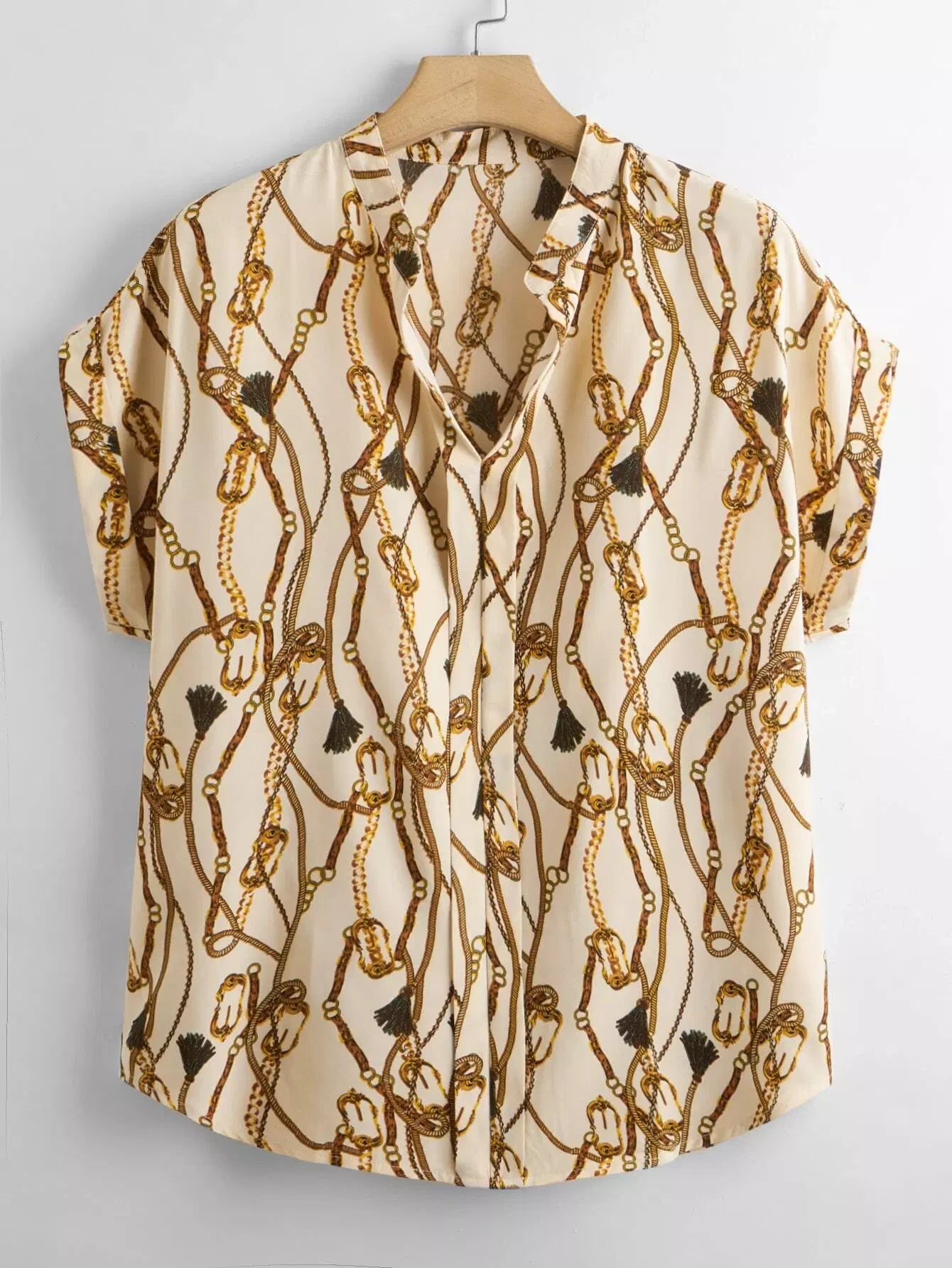 بلوزة بطبعة سلسلة مطبوعة على رقبة برقبة برقبة زائد