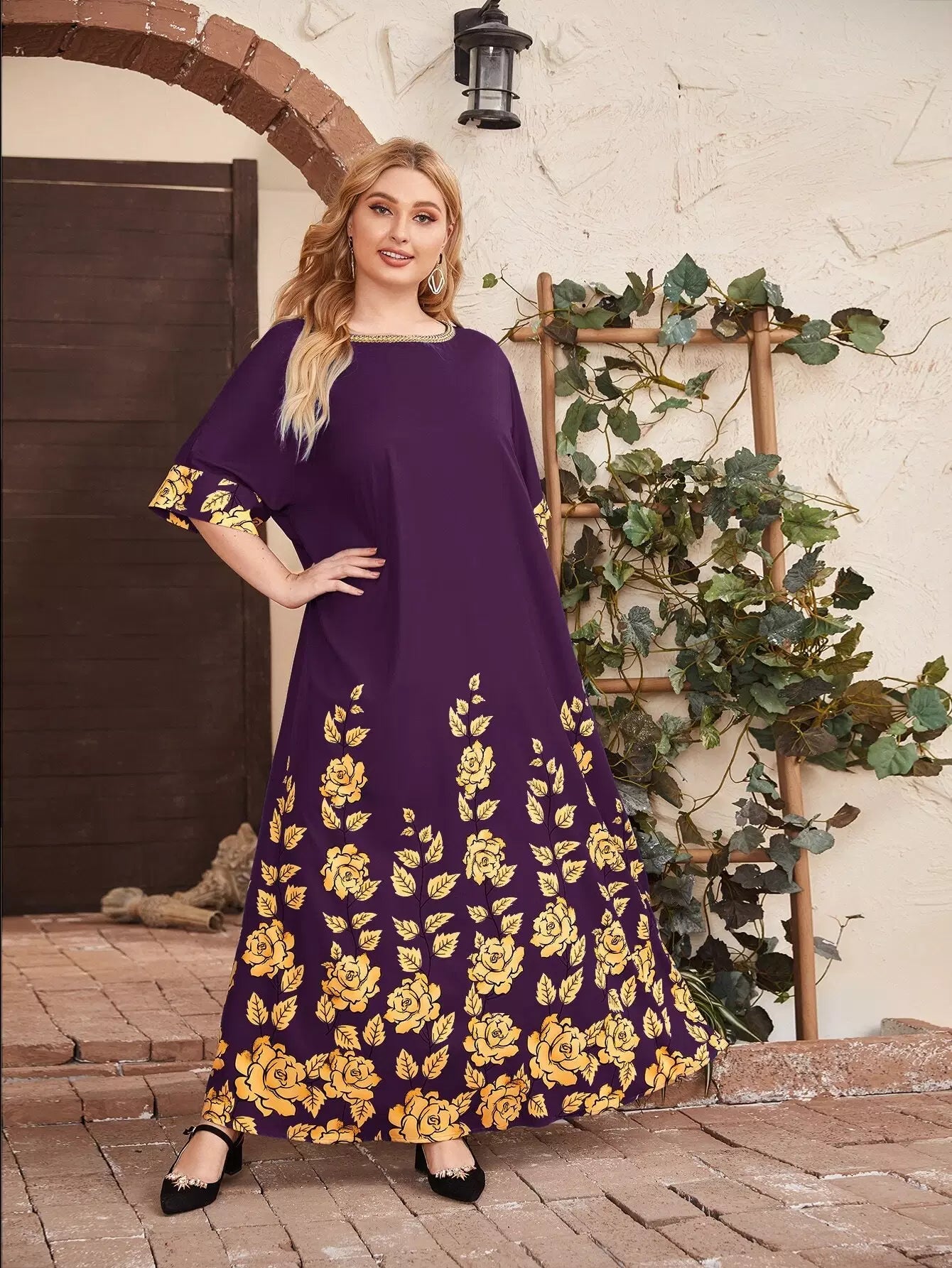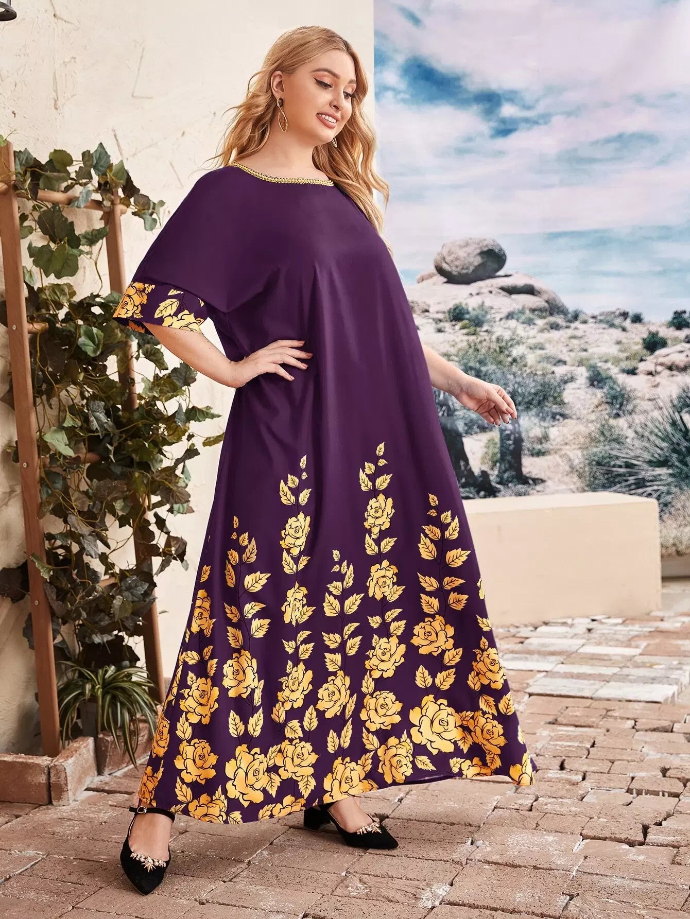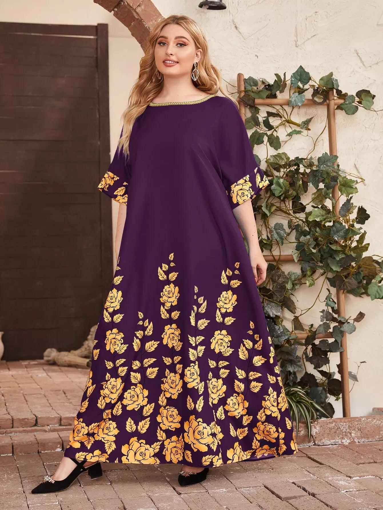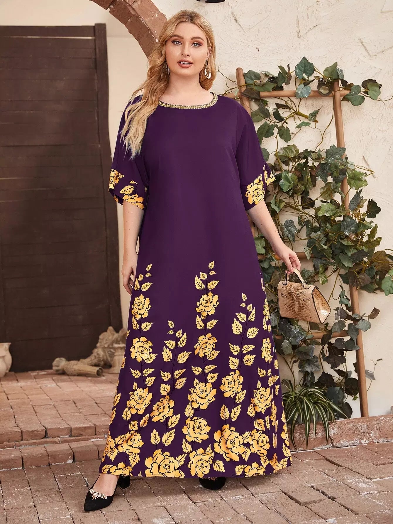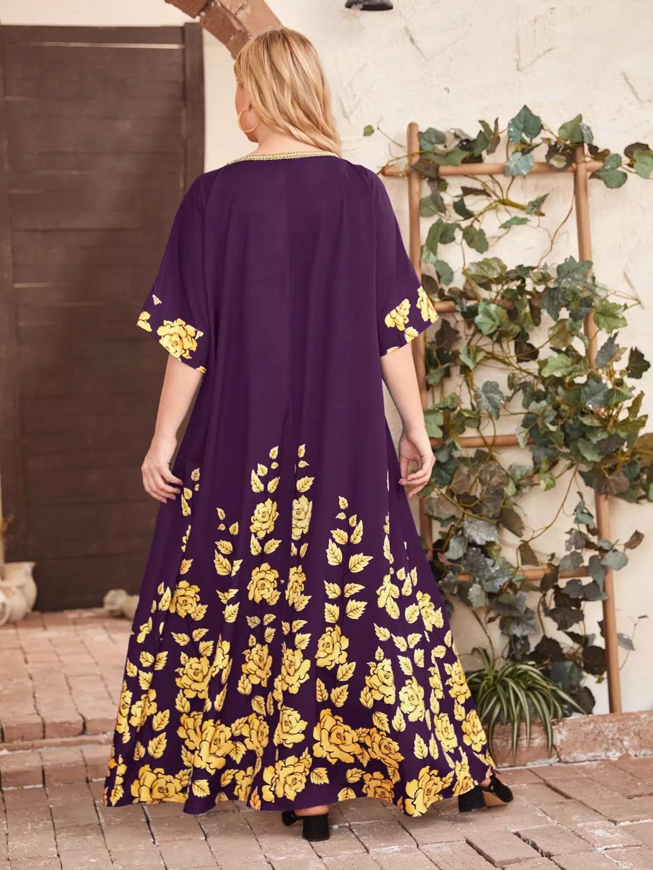 فستان بطبعة زهور برقبة شريط بلون مغاير بلون مغاير