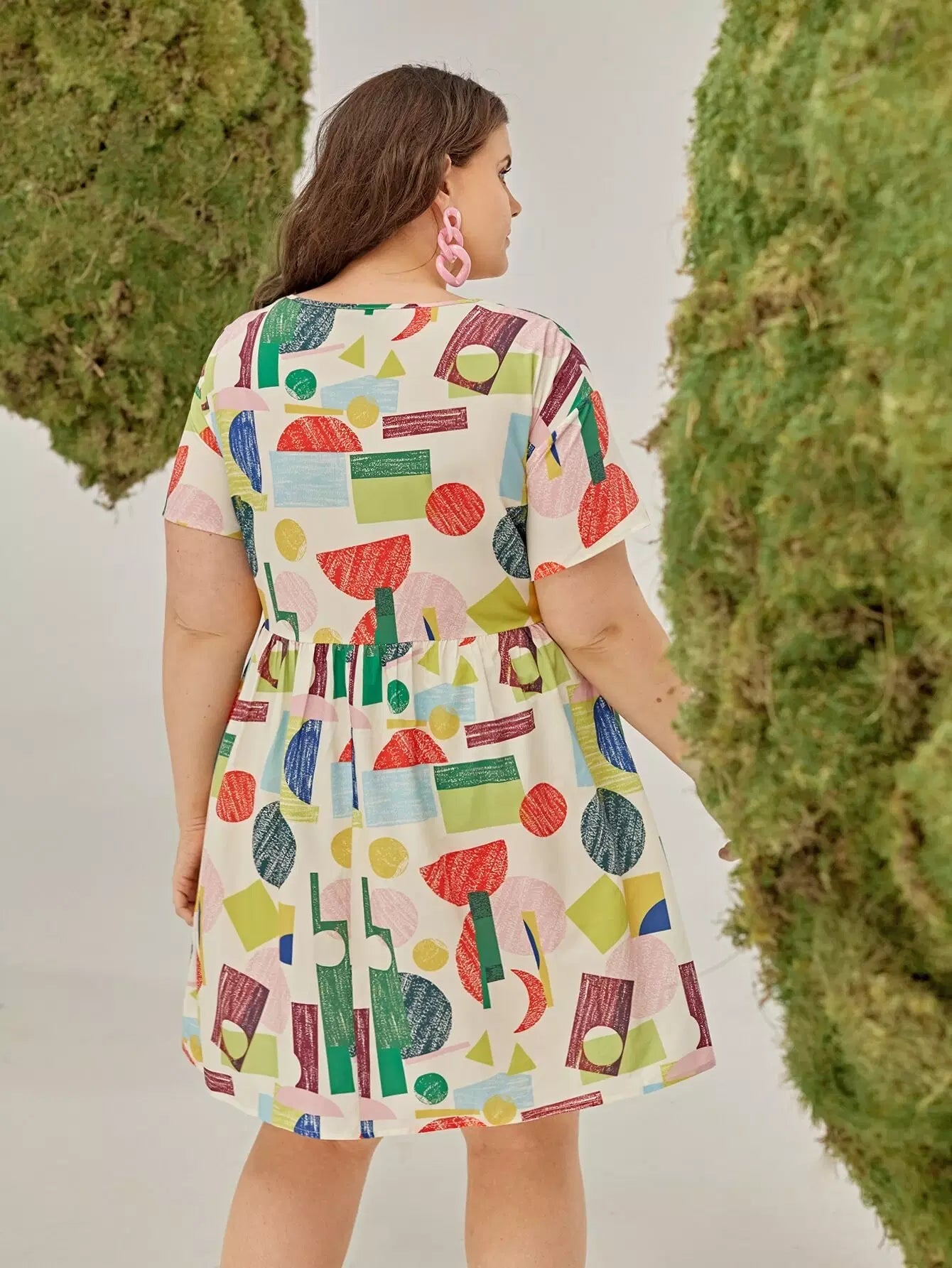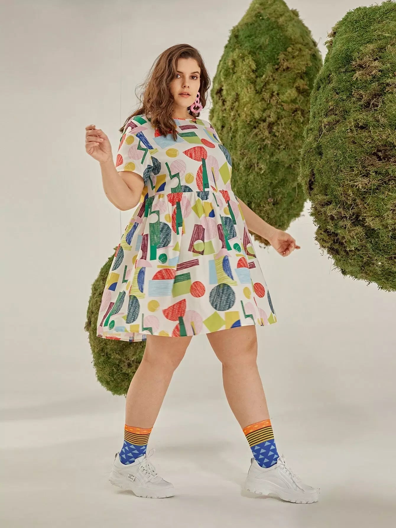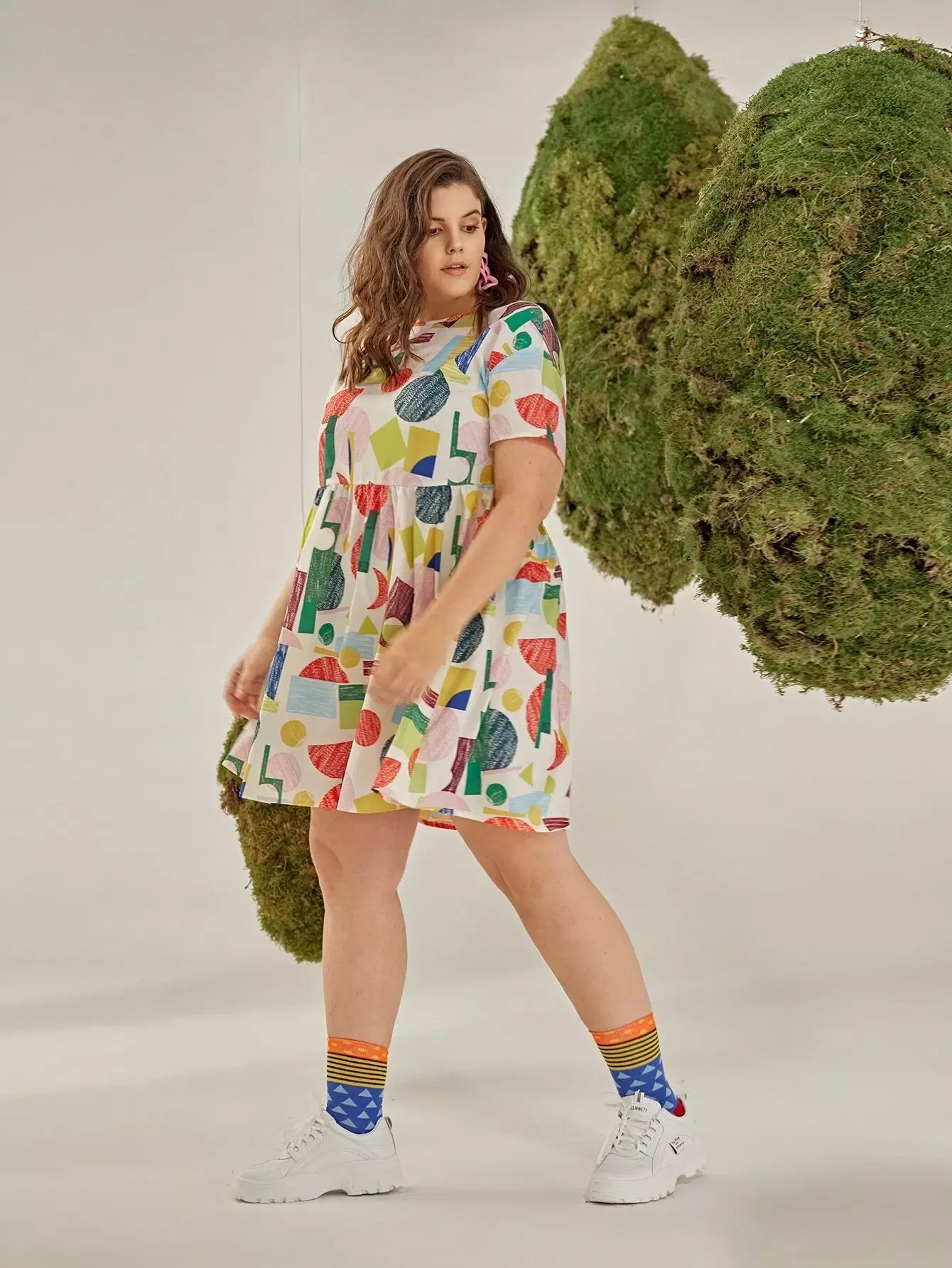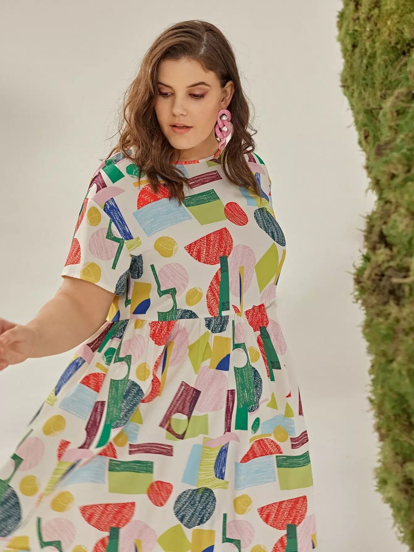 فستان بطبعة جيو مطبوع على الأكتاف منسدل الأكتاف زائد