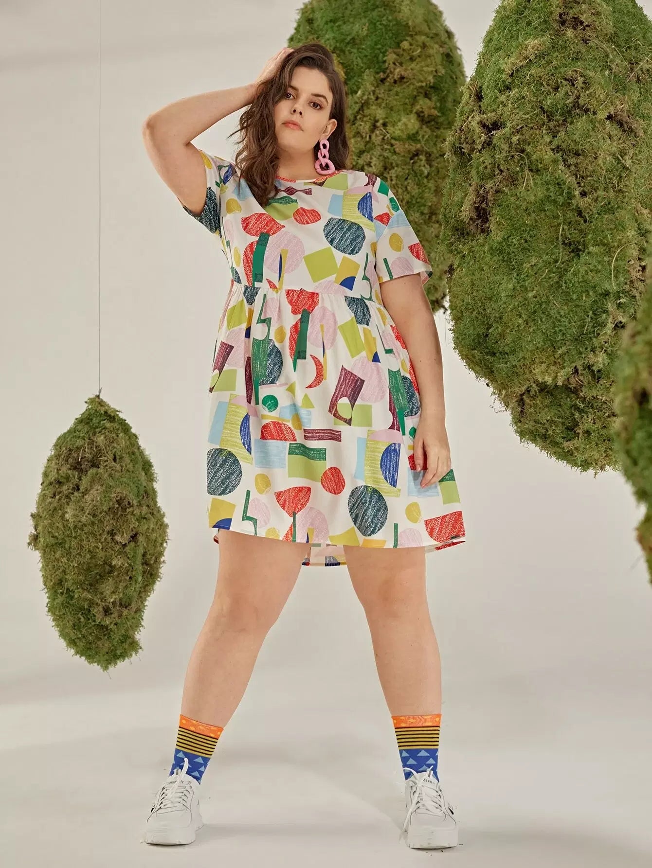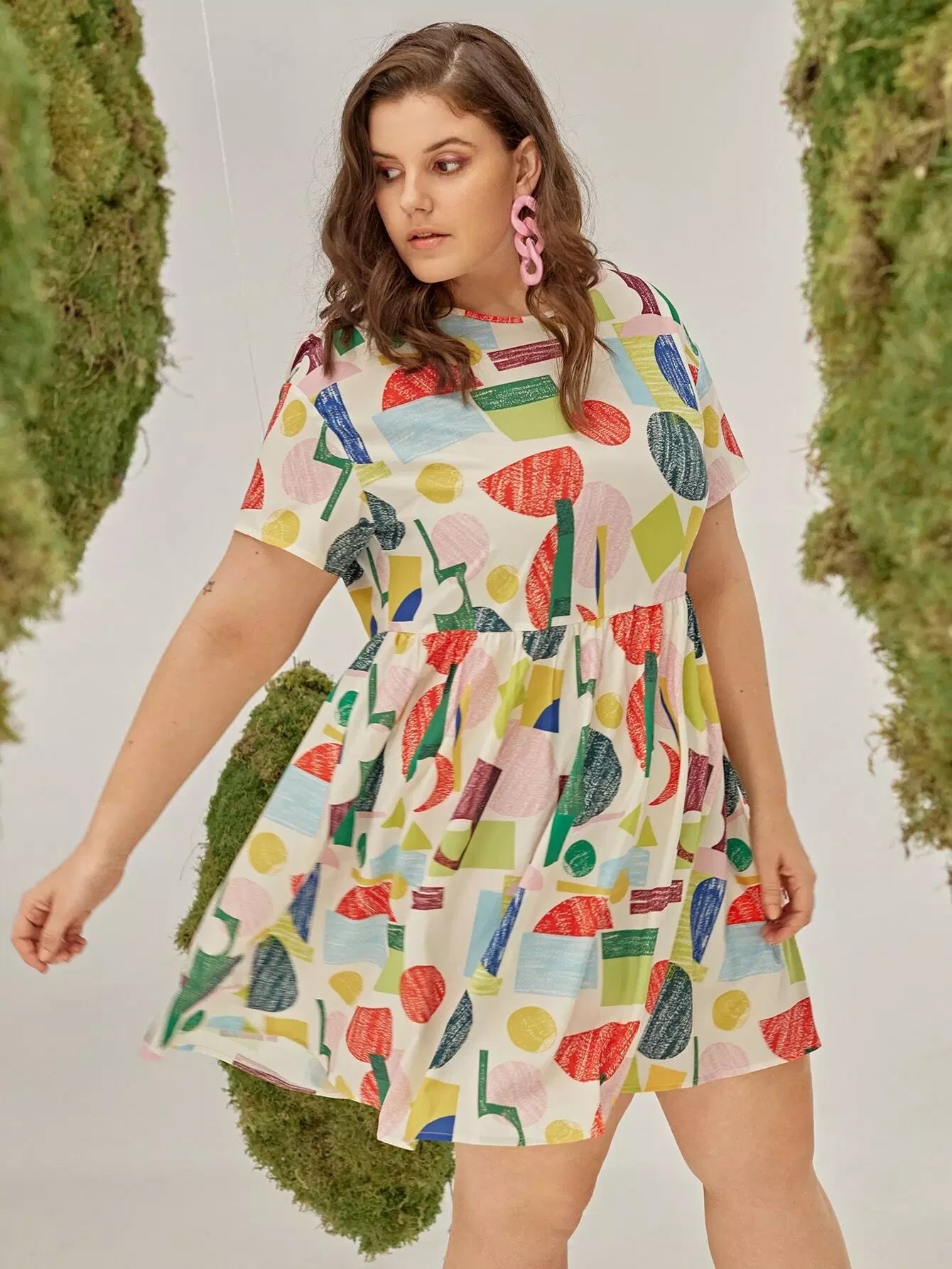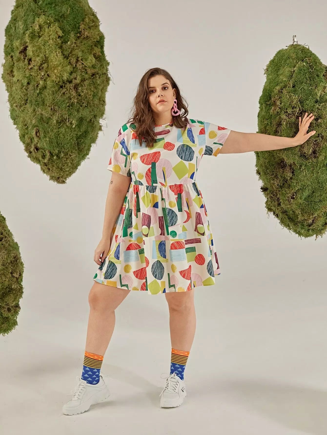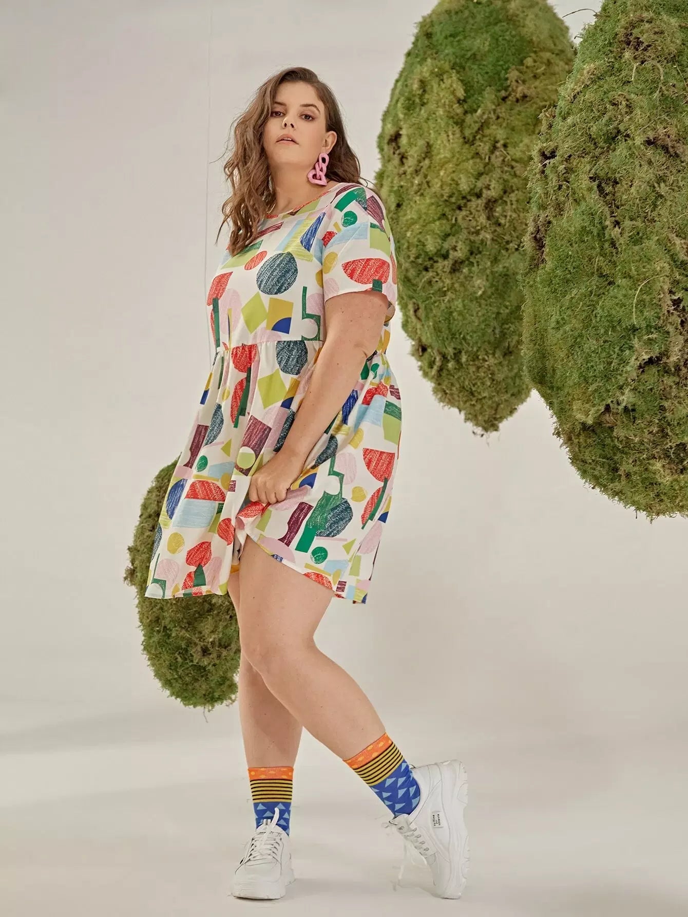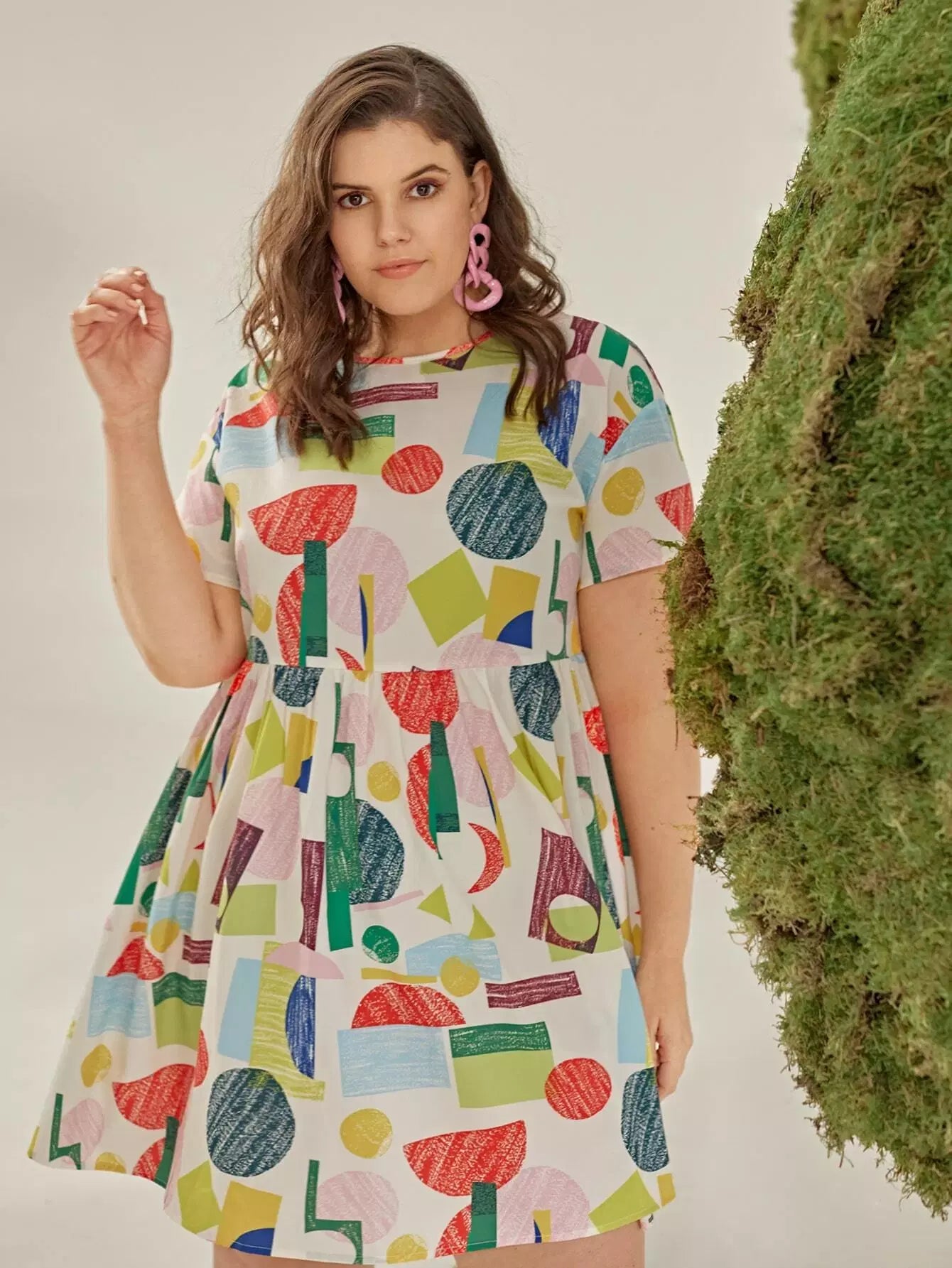 فستان بطبعة جيو مطبوع على الأكتاف منسدل الأكتاف زائد