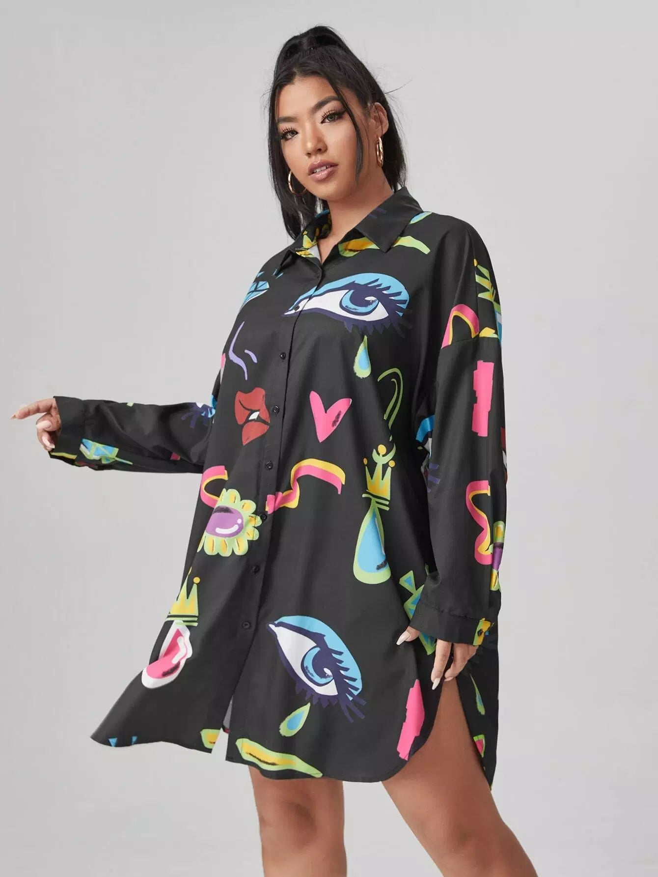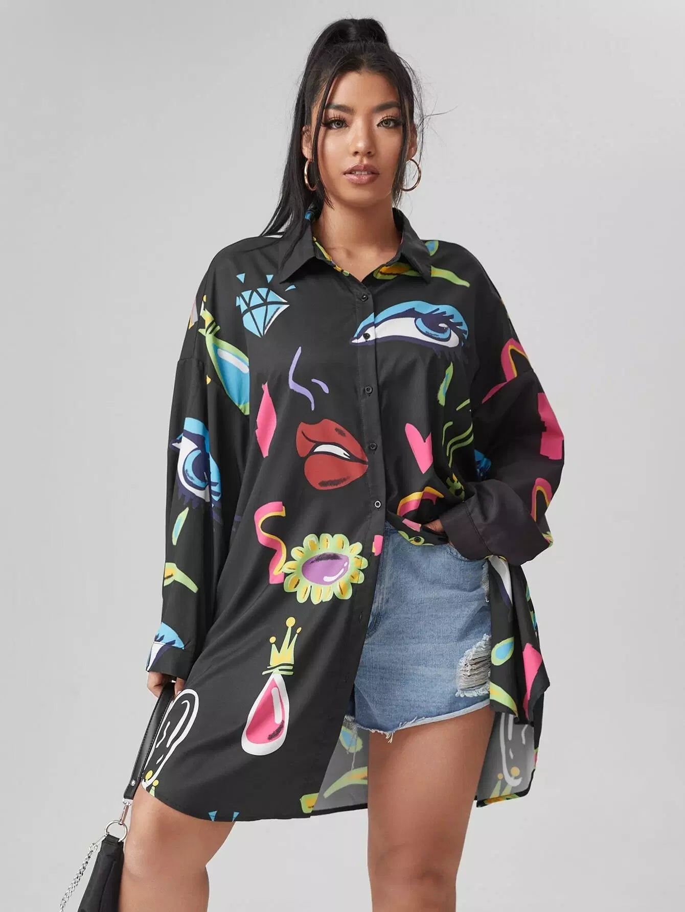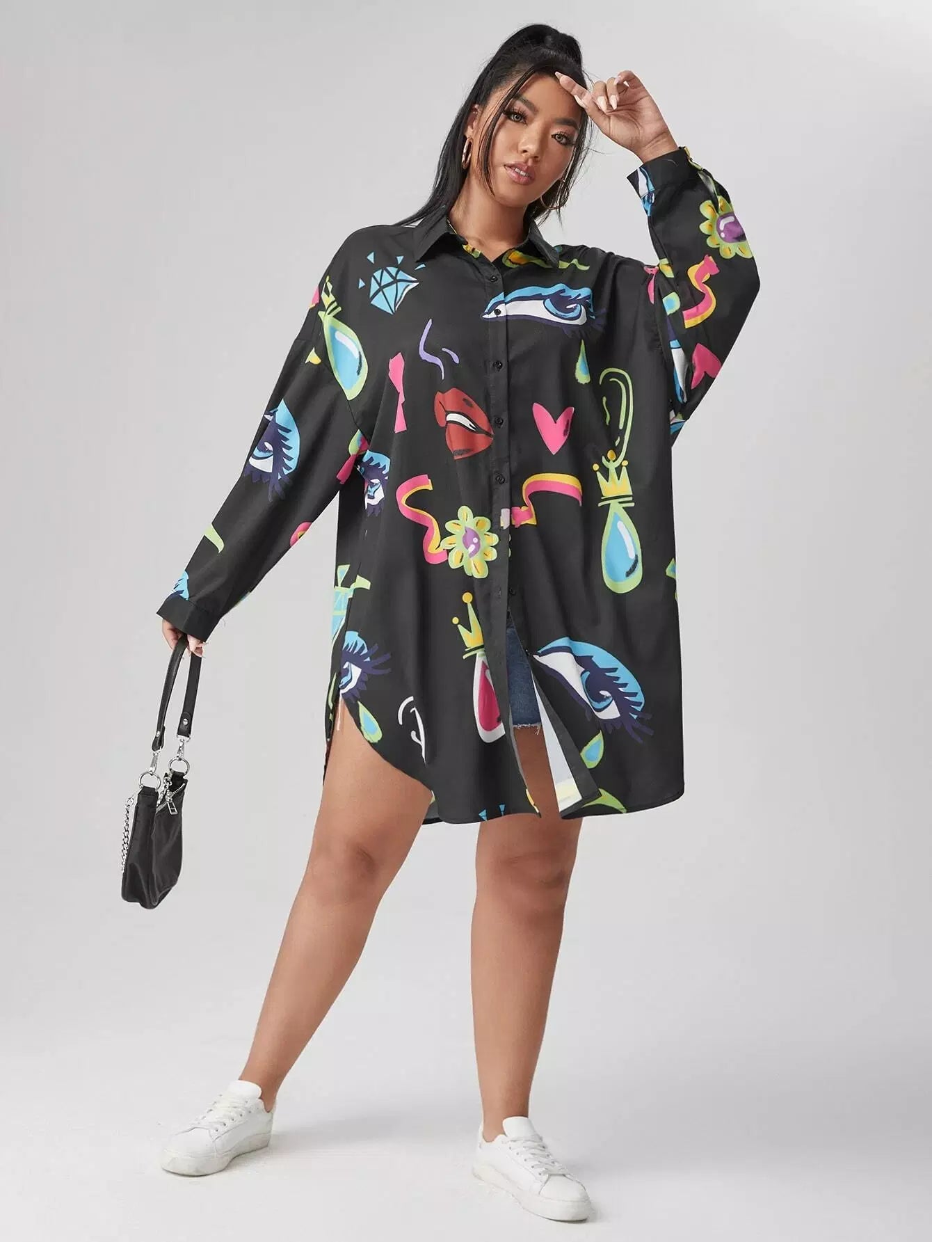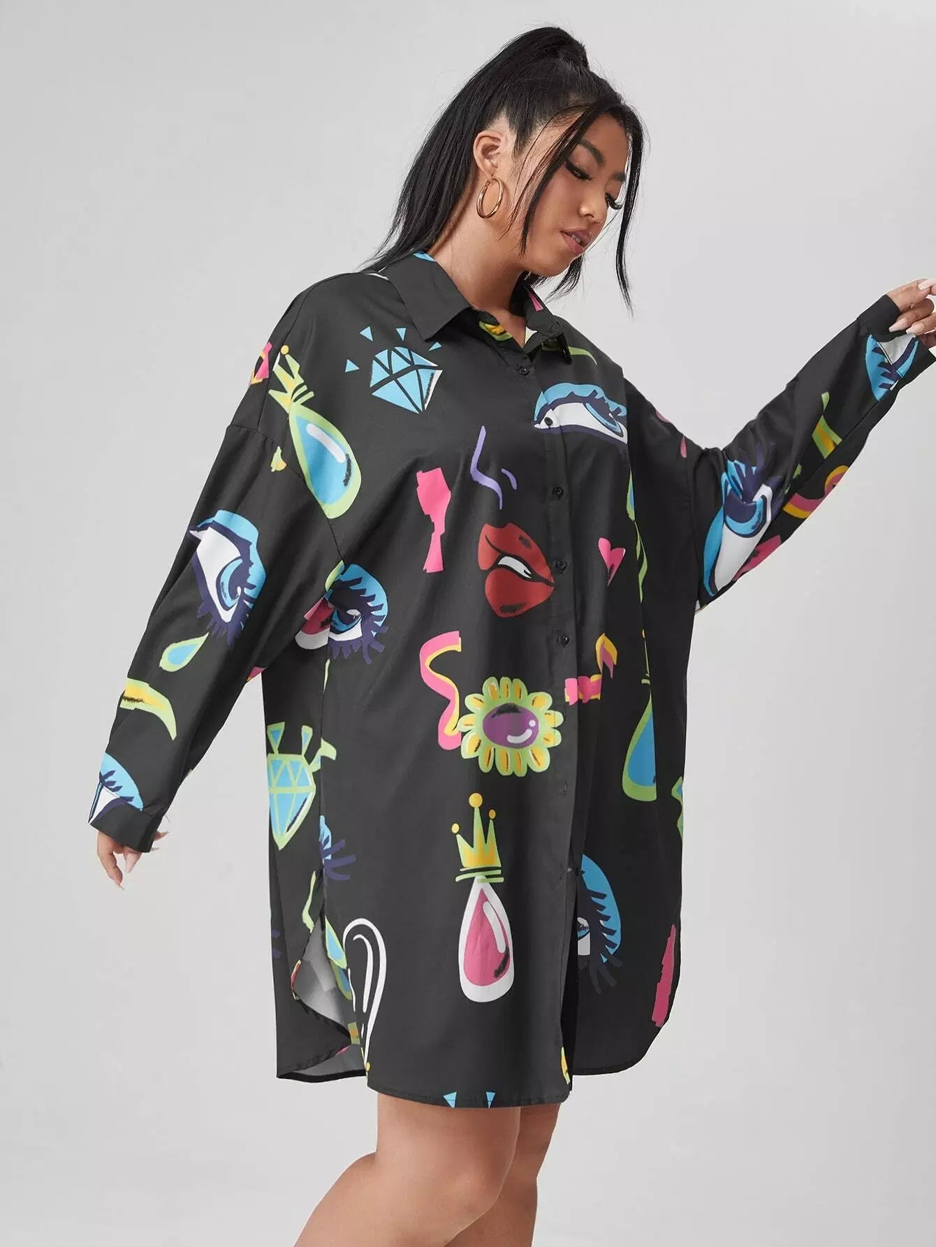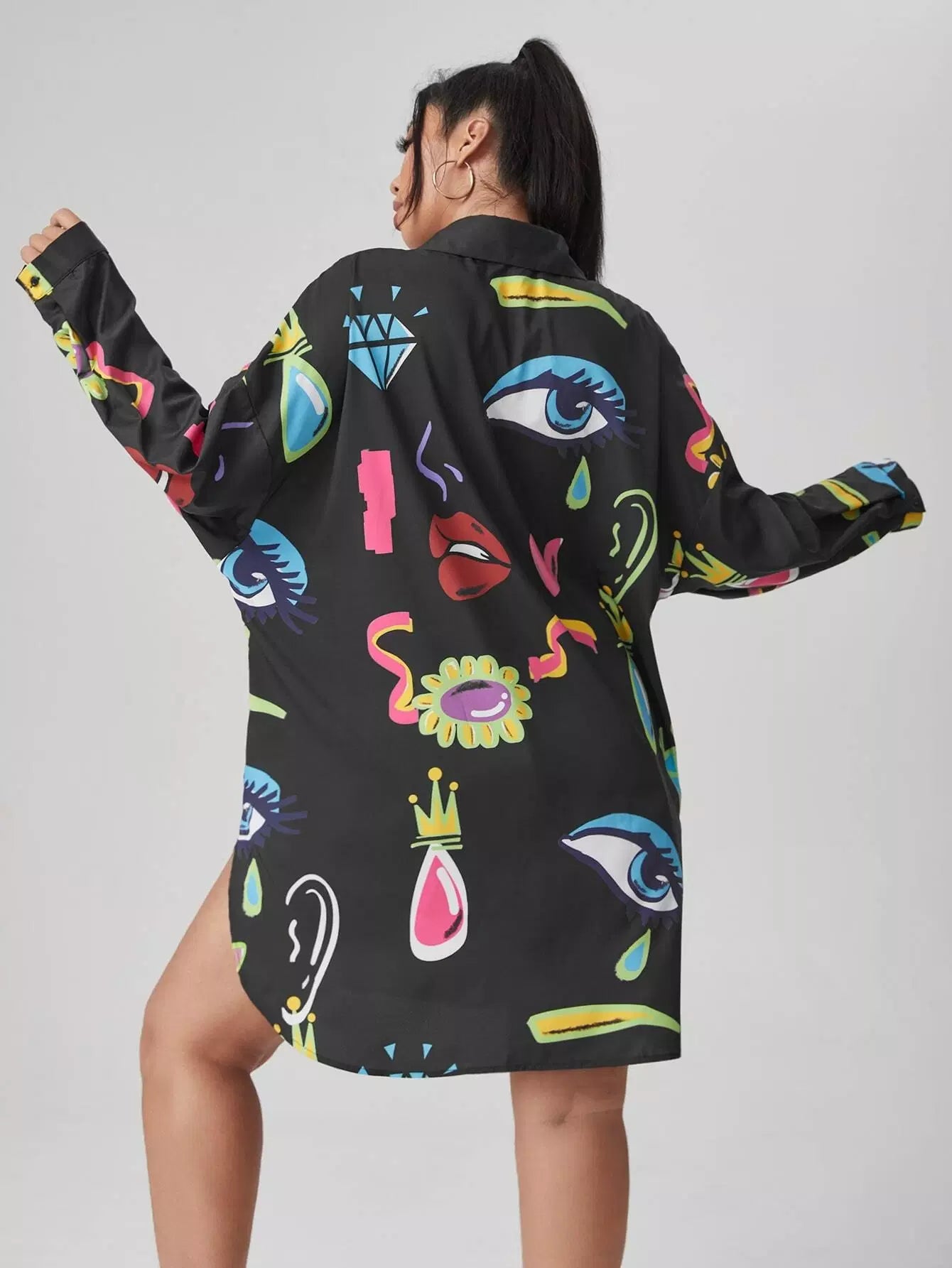 بلوزة بطبعة عين وفم زائد بحاشية منحنية