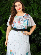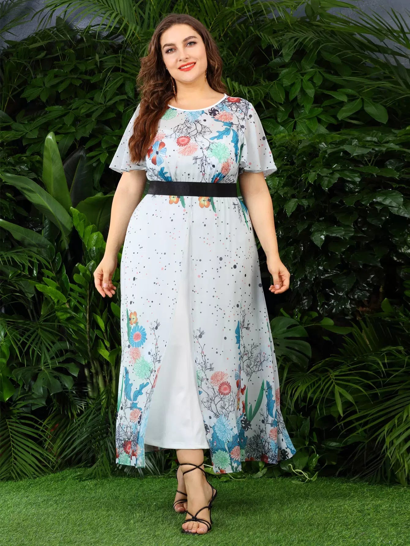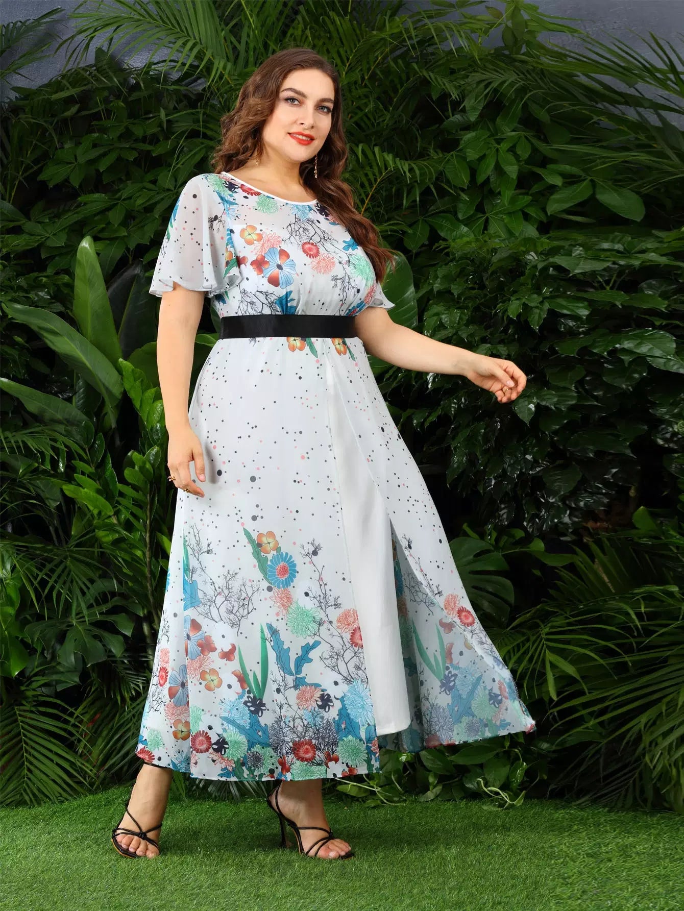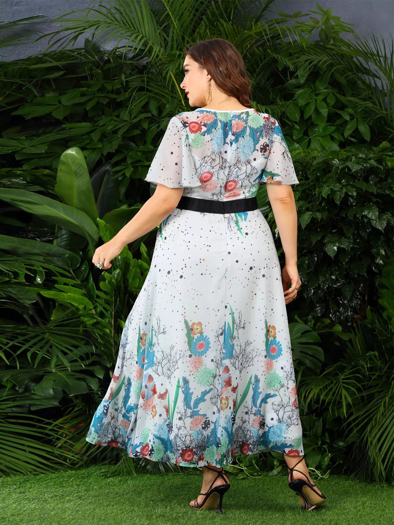 فستان بأكمام منقوشة بنقوش الزهور ونقاط منفوشة بأكمام منفوشة على شكل حرف A