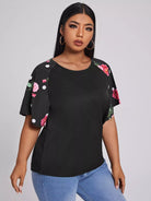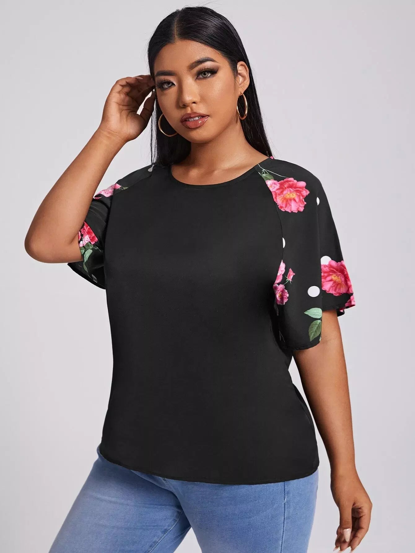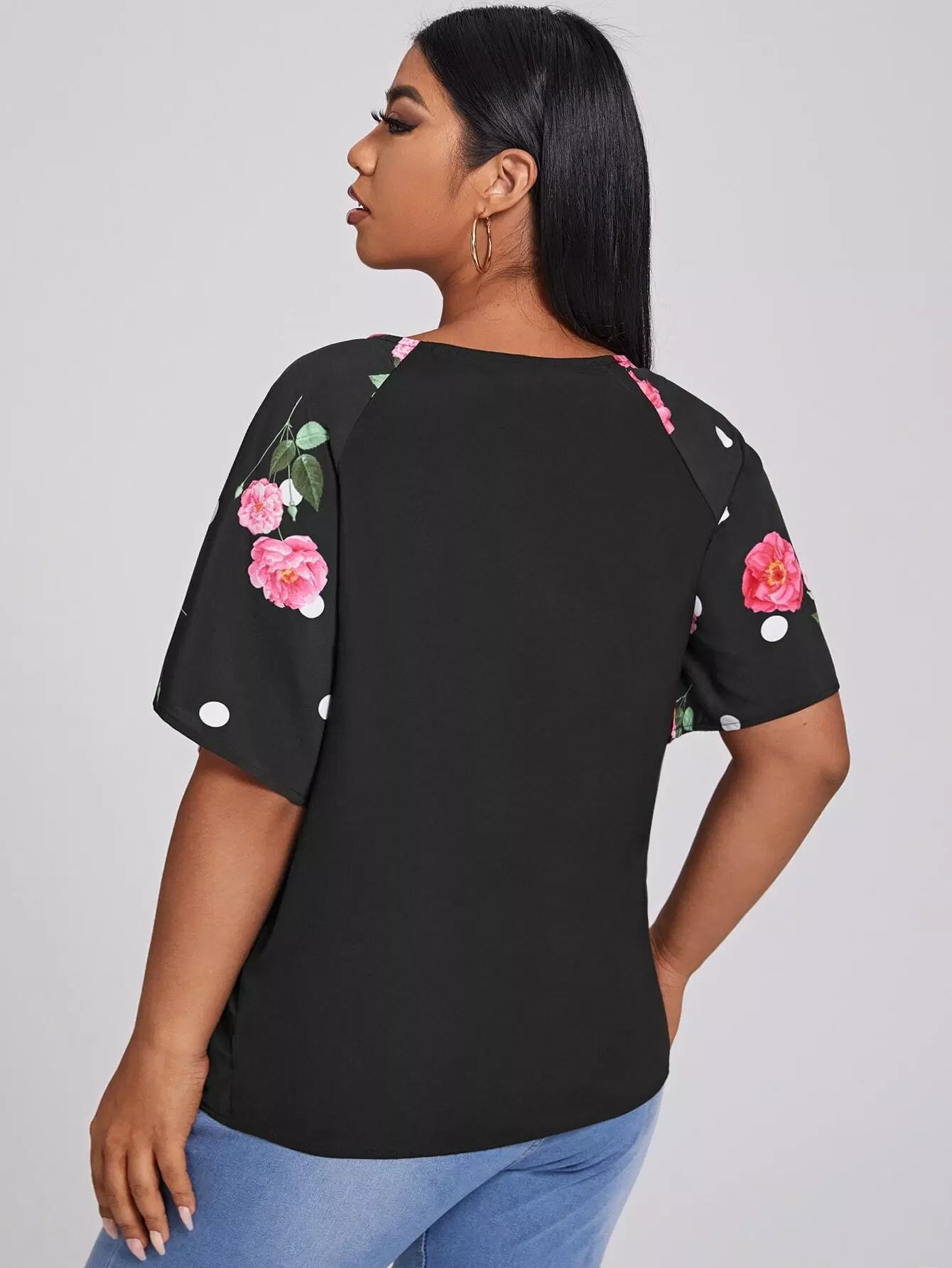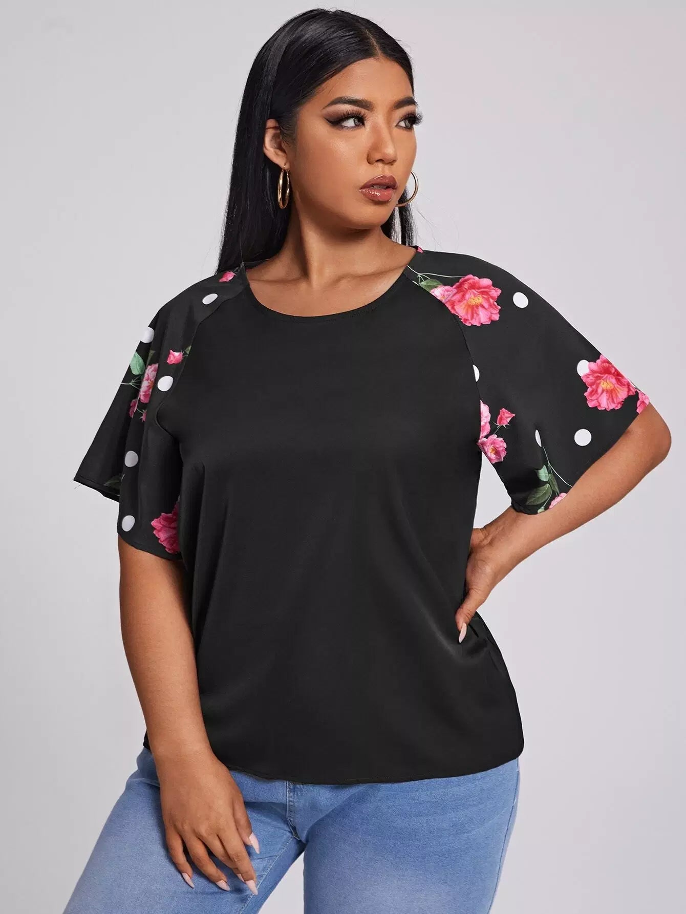 تي شيرت بأكمام منقوشة بنقشة الزهور والبولكا دوت