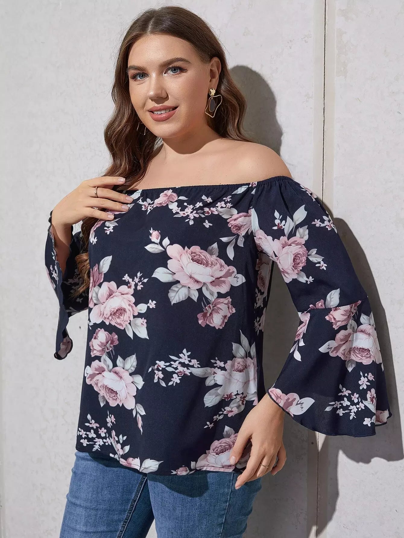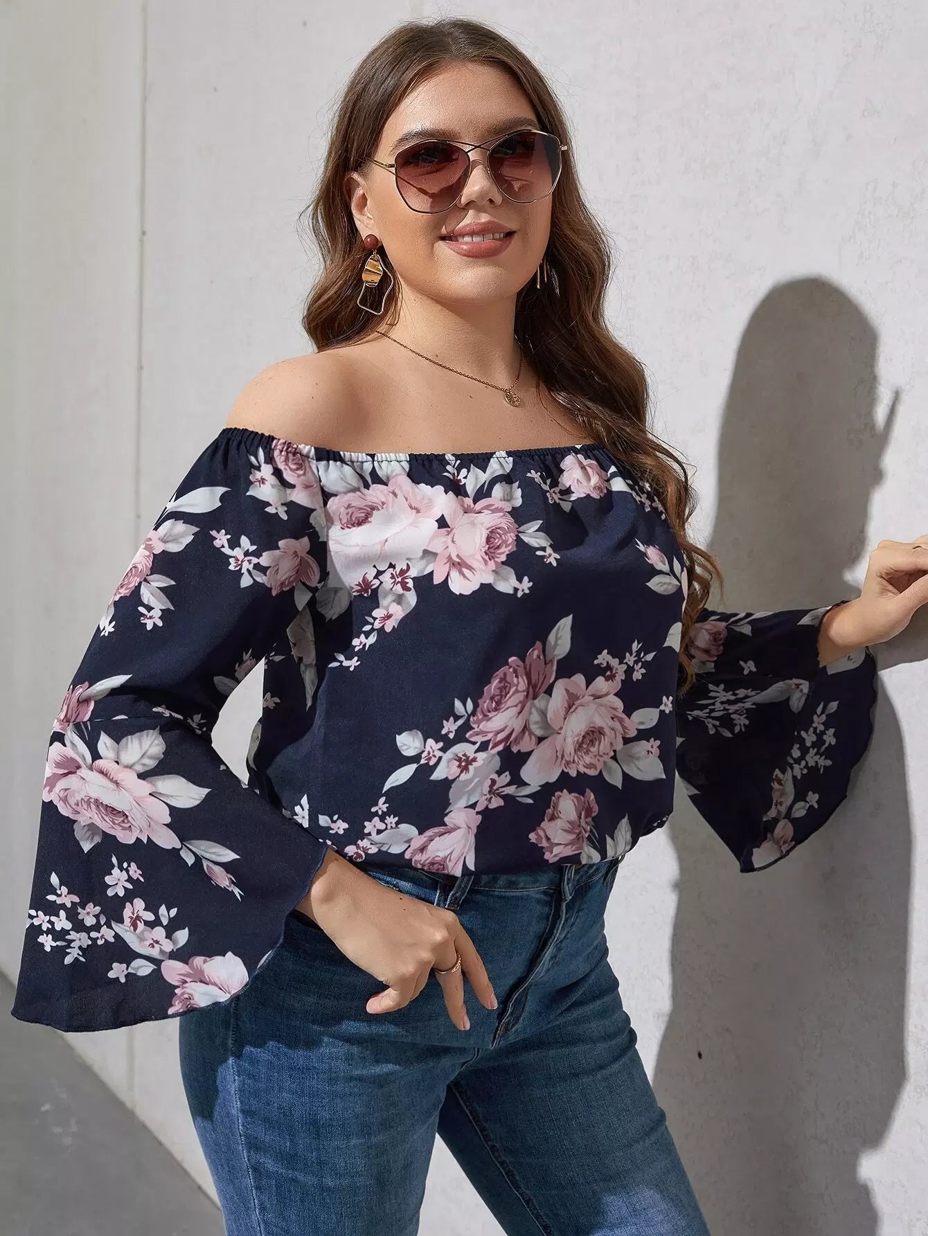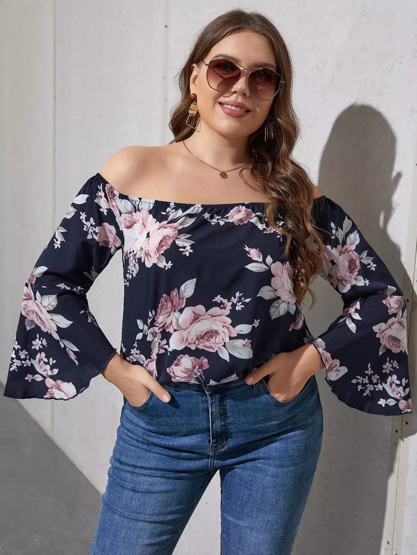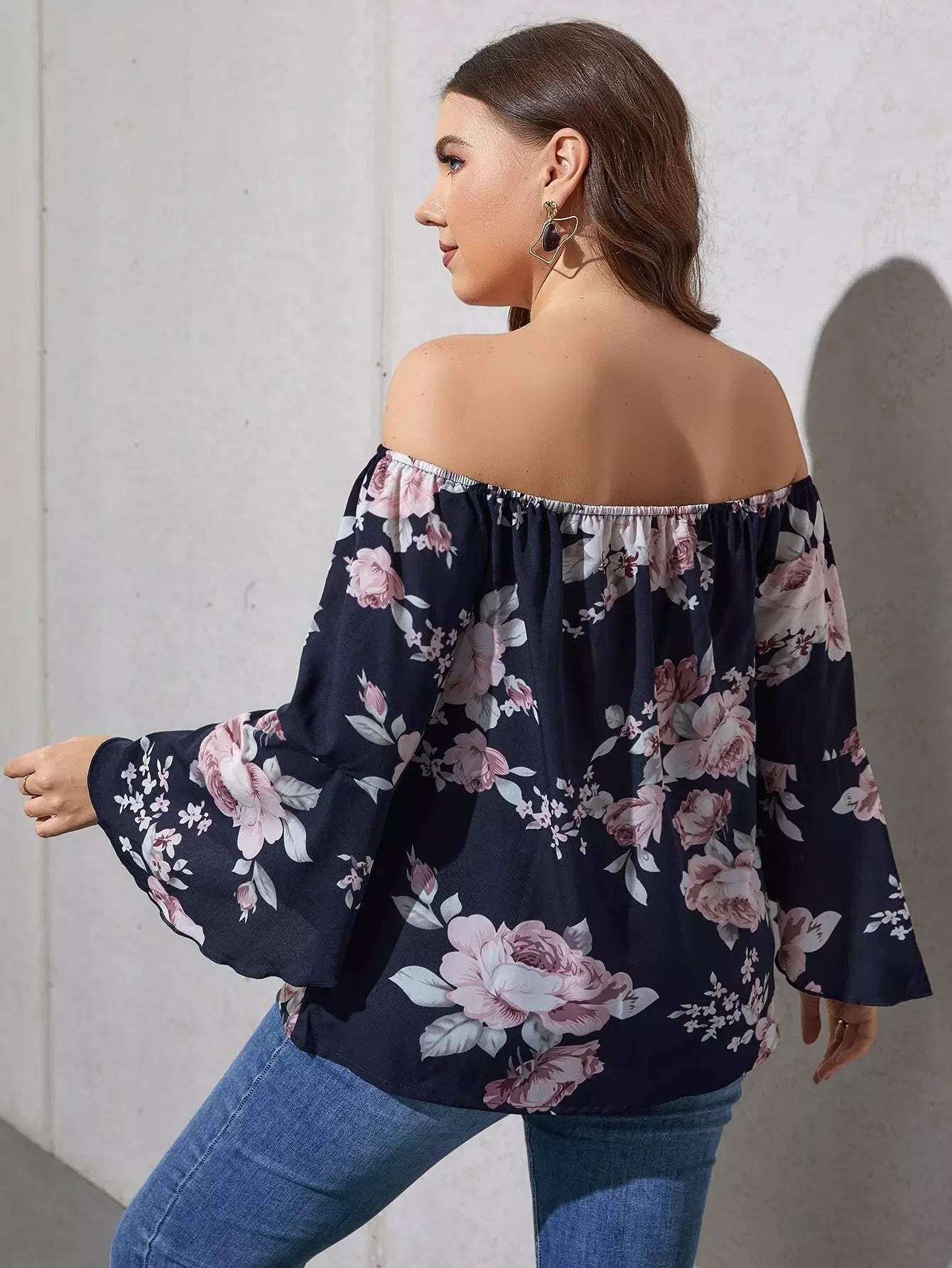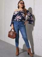 بلوزة بطبعة زهور مطبوعة على الأكتاف مكشوفة الأكمام بأكمام كبيرة